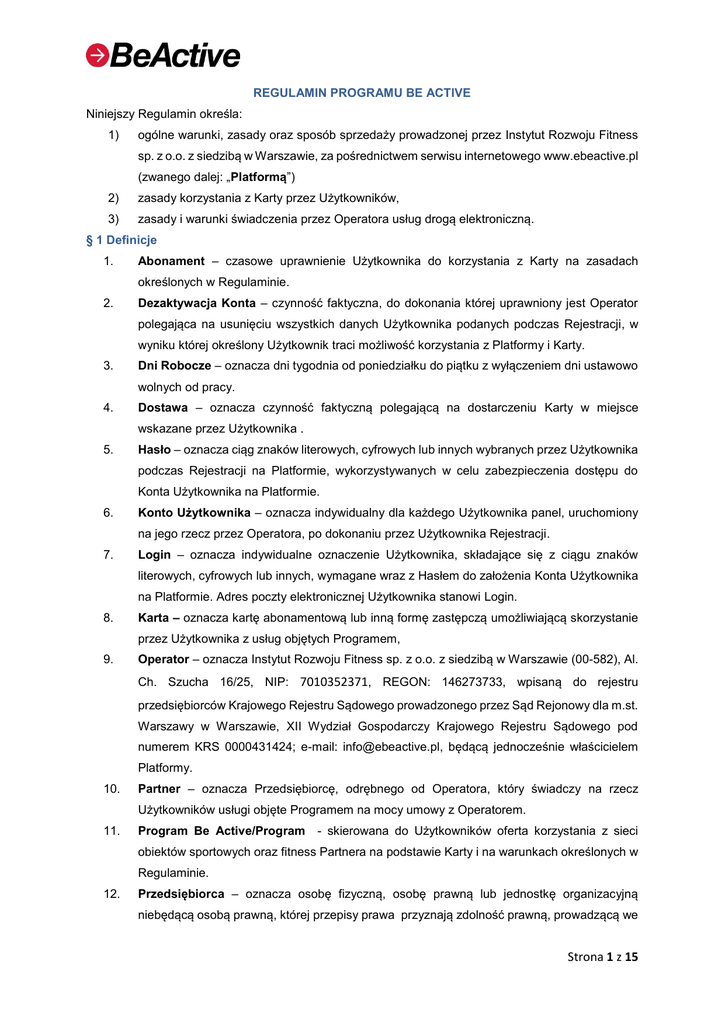 REGULAMIN PROGRAMU BE ACTIVE Niniejszy Regulamin określa: 1) ogólne warunki, zasady oraz sposób sprzedaży prowadzonej przez Instytut Rozwoju Fitness sp. z o.o. z siedzibą w Warszawie, za pośrednictwem serwisu internetowego www.ebeactive.pl (zwanego dalej: „Platformą”) 2) zasady korzystania z Karty przez Użytkowników, 3) zasady i warunki świadczenia przez Operatora usług drogą elektroniczną. § 1 Definicje 1. Abonament – czasowe uprawnienie Użytkownika do korzystania z Karty na zasadach określonych w Regulaminie. 2. Dezaktywacja Konta – czynność faktyczna, do dokonania której uprawniony jest Operator polegająca na usunięciu wszystkich danych Użytkownika podanych podczas Rejestracji, w wyniku której określony Użytkownik traci możliwość korzystania z Platformy i Karty. 3. Dni Robocze – oznacza dni tygodnia od poniedziałku do piątku z wyłączeniem dni ustawowo wolnych od pracy. 4. Dostawa – oznacza czynność faktyczną polegającą na dostarczeniu Karty w miejsce wskazane przez Użytkownika . 5. Hasło – oznacza ciąg znaków literowych, cyfrowych lub innych wybranych przez Użytkownika podczas Rejestracji na Platformie, wykorzystywanych w celu zabezpieczenia dostępu do Konta Użytkownika na Platformie. 6. Konto Użytkownika – oznacza indywidualny dla każdego Użytkownika panel, uruchomiony na jego rzecz przez Operatora, po dokonaniu przez Użytkownika Rejestracji. 7. Login – oznacza indywidualne oznaczenie Użytkownika, składające się z ciągu znaków literowych, cyfrowych lub innych, wymagane wraz z Hasłem do założenia Konta Użytkownika na Platformie. Adres poczty elektronicznej Użytkownika stanowi Login. 8. Karta – oznacza kartę abonamentową lub inną formę zastępczą umożliwiającą skorzystanie przez Użytkownika z usług objętych Programem, 9. Operator – oznacza Instytut Rozwoju Fitness sp. z o.o. z siedzibą w Warszawie (00-582), Al. Ch. Szucha 16/25, NIP: 7010352371, REGON: 146273733, wpisaną do rejestru przedsiębiorców Krajowego Rejestru Sądowego prowadzonego przez Sąd Rejonowy dla m.st. Warszawy w Warszawie, XII Wydział Gospodarczy Krajowego Rejestru Sądowego pod numerem KRS 0000431424; e-mail: [email protected], będącą jednocześnie właścicielem Platformy. 10. Partner – oznacza Przedsiębiorcę, odrębnego od Operatora, który świadczy na rzecz Użytkowników usługi objęte Programem na mocy umowy z Operatorem. 11. Program Be Active/Program - skierowana do Użytkowników oferta korzystania z sieci obiektów sportowych oraz fitness Partnera na podstawie Karty i na warunkach określonych w Regulaminie. 12. Przedsiębiorca – oznacza osobę fizyczną, osobę prawną lub jednostkę organizacyjną niebędącą osobą prawną, której przepisy prawa przyznają zdolność prawną, prowadzącą we Strona 1 z 15 własnym imieniu działalność gospodarczą lub zawodową, z której usług w ramach Programu może skorzystać Użytkownik. 13. Regulamin – oznacza niniejszy regulamin. 14. Rejestracja – oznacza czynność faktyczną dokonaną w sposób określony w Regulaminie, wymaganą dla korzystania przez Użytkownika ze wszystkich funkcjonalności Platformy. 15. Strona Internetowa Platformy – oznacza strony internetowe, pod którymi Operator prowadzi Platformę, działające w domenie www.ebeactive.pl. 16. Umowa Be Active– oznacza umowę sprzedaży zawartą drogą elektroniczną na zasadach określonych w Regulaminie, między Użytkownikiem a Operatorem, której przedmiotem jest możliwość korzystania z Programu przy użyciu Karty, 17. Umowa o prowadzenie Konta - oznacza umowę zawartą drogą elektroniczną na zasadach określonych w Regulaminie, między Użytkownikiem a Operatorem, której przedmiotem jest możliwość korzystania przez Użytkownika z Konta, 18. Użytkownik – oznacza osobę fizyczną w wieku od 16 do 26 lat, mającą co najmniej ograniczoną zdolność do czynności prawnych, będącą uczniem szkoły lub studentem, posiadającą ważną legitymację szkolną lub studencką, korzystającą z Programu, Kart lub Platformy w zakresie niezwiązanym bezpośrednio z jej działalnością gospodarczą lub zawodową. Partnerzy mogą stosować ograniczenia wieku Użytkowników, zgodnie z § 6 ust. 12. § 2 Postanowienia ogólne 1. Wszelkie prawa do Platformy, w tym majątkowe prawa autorskie, prawa własności intelektualnej do jej nazwy, domeny internetowej, Strony Internetowej Platformy, a także do wzorców, formularzy, logotypów należą do Operatora, a korzystanie z nich może następować wyłącznie w sposób określony i zgodny z Regulaminem. 2. Platforma jest udostępniana przez Operatora za pośrednictwem sieci Internet i Strony Internetowej Platformy, jako zasób systemu teleinformatycznego oraz informatycznego. 3. Operator zastrzega sobie prawo do umieszczania na Stronie Internetowej Platformy treści reklamowych towarów i usług osób trzecich, w formach stosowanych w sieci Internet. 4. Zabronione jest wykorzystywanie Platformy lub Strony Internetowej Platformy przez Użytkowników lub osoby trzecie do przesyłania niezamówionej informacji handlowej. § 3 Korzystanie z Platformy 1. Korzystanie z Platformy oznacza każdą czynność Użytkownika, która prowadzi do zapoznania się przez niego z treściami zawartymi na Stronie Internetowej Platformy, z zastrzeżeniem postanowień §4 Regulaminu. 2. Korzystanie z Platformy odbywać może się wyłącznie na zasadach i w zakresie wskazanym w Regulaminie. 3. Operator dołoży starań, aby korzystanie z Platformy było możliwe dla użytkowników Internetu z użyciem wszystkich popularnych przeglądarek internetowych, systemów operacyjnych, typów komputerów oraz typów połączeń internetowych. Minimalne wymagania techniczne umożliwiające korzystanie ze Stron Platformy, z zastrzeżeniem zdania poprzedniego to: Strona 2 z 15 Komputer pentium 4, minimum 3.0 GHz, pamięć 1GB RAM lub lepsza, przeglądarka Microsoft Interne