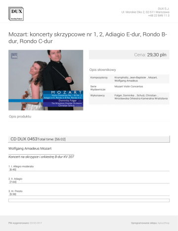 DUX S.J. Ul. Morskie Oko 2, 02-511 Warszawa +48 22 849 11 3 Mozart: koncerty skrzypcowe nr 1, 2, Adiagio E-dur, Rondo Bdur, Rondo C-dur Cena: 29,30 pln Opis słownikowy Kompozytorzy Krumpholtz, Jean-Baptiste ∎, Mozart, Wolfgang Amadeus ∎ Serie Wydawnicze Mozart Violin Concertos Wykonawcy Falger, Dominika ∎, Schulz, Christian ∎, Wrocławska Orkiestra Kameralna Wratislavia ∎ Opis produktu CD DUX 0453Total time: [56:02] Wolfgang Amadeus Mozart Koncert na skrzypce i orkiestrę B-dur KV 207 1. I. Allegro moderato [6:45] 2. II. Adagio [7:00] 3. III. Presto [5:38] Plik wygenerowano: 03-03-2017 Oprogramowanie sklepu: AptusShop DUX S.J. Ul. Morskie Oko 2, 02-511 Warszawa +48 22 849 11 3 Wolfgang Amadeus Mozart Koncert na skrzypce i orkiestrę D-dur KV 211 4. I. Allegro moderato [7:19] 5. II. Andante [6:03] Jean-Baptiste Krumpholtz VI Koncert na harfę op. 9 6. III. Rondo. Allegro [4:19] Wolfgang Amadeus Mozart Koncert na skrzypce i orkiestrę D-dur KV 211 6. III. Rondo. Allegro [4:19] Wolfgang Amadeus Mozart Adagio E-dur KV 261 7. Adagio E-dur KV 261 / Adagio in E major K.261 [6:28] Wolfgang Amadeus Mozart Rondo B-dur KV 269 8. Rondo B-dur KV 269 / Rondo in B flat major K.269 [6:36] Plik wygenerowano: 03-03-2017 Oprogramowanie sklepu: AptusShop DUX S.J. Ul. Morskie Oko 2, 02-511 Warszawa +48 22 849 11 3 Wolfgang Amadeus Mozart Rondo C-dur KV 373 9. Rondo C-dur KV 373 / Rondo in C major K.373 [5:53] Wykonawcy: Wrocławska Orkiestra Kameralna Wratislavia Christian Schulz /dyrygent/ Dominika Falger /skrzypce/ Zestawy Mozart Koncerty skrzypcowe Mozart: koncerty skrzypcowe nr 4, 5 Plik wygenerowano: 03-03-2017 Powered by TCPDF (www.tcpdf.org) 74,73 pln Oszczędzasz 13,17 pln Mozart: koncerty skrzypcowe nr 1, 2, Adiagio Edur, Rondo B-dur, Rondo C-dur Mozart: koncert skrzypcowy nr 3, Sinfonia Concertante Oprogramowanie sklepu: AptusShop