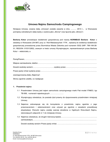 Umowa Najmu Samochodu Campingowego Niniejsza Umowa, (zwana dalej „Umową”) została zawarta w dniu ........... 2013 r., w Warszawie pomiędzy (określanymi dalej każdy z osobna jako „Strona" oraz łącznie jako „Strony"): Barbarą Kotur prowadząca działalność gospodarczą pod nazwą NORMBUD Barbara Kotur z siedzibą w Warszawie (04-987) przy ul. Wał Miedzeszyński 177K , wpisaną do ewidencji działalności gospodarczej prowadzonej przez Burmistrza Miasta Zielonka pod numerem 5032 (NIP: 799-149-3851, REGON: 015313262), zwanym w treści umowy Wynajmującym, reprezentowanym przez Barbarę Kotur – właściciela, a Panią/Panem, …………………………………………………………………………………………………….. Miejsce zamieszkania, telefon…………………………………………………………………………………… Dowód osobisty seria/nr……………………………..wydany przez………….……………………………….. Prawo jazdy nr/kat wydane przez…………………………………………………………….…………………. zwanego/zwaną dalej „Najemcą". Strony zgodnie ustaliły, co następuje: 1. Przedmiot najmu: 1.1 Przedmiotem Umowy jest najem samochodu campingowego marki Fiat model ITINEO, typ TB 690, numerach rejestracyjnych …………………. 1.2 Wynajmujący oświadcza, że posiada tytuł prawny do dysponowania przedmiotem niniejszej Umowy. 1.3 Najemca zobowiązuje się do korzystania z przedmiotu najmu zgodnie z jego przeznaczeniem i właściwościami oraz używać go zgodnie z zasadami prawidłowej eksploatacji. Warunki najmu zostały szerzej określone w Ogólnych Warunkach Najmu, stanowiących załącznik nr 1 do niniejszej Umowy. 1.4 Najemca oświadcza, że drugim kierowcą będzie………………………………………………….. zamieszkały/a…………………………………………………………………….……………………. Dowód osobisty seria/nr Prawo jazdy nr/kat. ………………………………………………………. Siedziba firmy: NORMBUD Ul. Wał Miedzeszyński 177K; 04-987 Warszawa Tel. (22)761-10-12; Fax. (22)781-96-51 Email: [email protected] 1|Strona (Do zawarcia Umowy niezbędne są dwa dokumenty Najemcy: potwierdzające tożsamość oraz potwierdzające uprawnienia do prowadzenia samochodu. W przypadku osób prawnych, odpis KRS oraz upoważnienie osoby reprezentującej podmiot gospodarczy) 2. Okres najmu samochodu: 2.1 Wynajmujący zobowiązuje się na podstawie niniejszej Umowy do przekazania Najemcy samochodu campingowego określonego w pkt 1.1. w okresie od dnia ……. 2013 roku do ……. 2013 roku, tj. na ………… dni. 2.2 Strony uzgadniają, że wydanie pojazdu nastąpi w dniu (dd-mm-rrrr) …………………….. o godz. …….. w (siedziba firmy Wynajmującego). 2.3 Najemca zobowiązuje się do zwrotu samochodu do dnia ……………… 2013 roku do godziny …….. do (siedziba firmy Wynajmującego). 2.4 Wraz z wydaniem samochodu jak i jego odbioru po okresie wynajmu, strony podpisują protokół zdawczo-odbiorczy, będący załącznikiem nr 2 do niniejszej Umowy. 2.5 Strony potwierdzają, iż możliwy jest wcześniejszy zwrot samochodu, jednakże nie skutkuje to zmianą ustalonego w Umowie wynagrodzenia za wynajem. 2.6 Najemca zwraca samochód w określonym terminie i nie ma możliwości przedłużenia Umowy Najmu bez pisemnej (SMS lub mailem) zgody Wynajmującego. 2.7 W przypadku, gdy Najemca nie zwróci przedmiotu najmu w wyznaczonym terminie, zobowiązany będzie do zapłaty kary umownej zgodnie z pkt 7.3 Warunków Ogólnych Najmu stanowiących załącznik nr 1 do Umowy. 2.8 Jeżeli Najemca nie zwróci pojazdu do 6 godzin po terminie wskazanym w Umowie i nie skontaktuje się z Wynajmującym, Wynajmujący poinformuje organy ścigania o kradzieży i spowoduje to całkowitą utratę kaucji. 3. Wynagrodzenie: 3.1 Tytułem wynagrodzenia za korzystanie z przedmiotu Umowy Najmu Najemca zobowiązany jest do zapłaty kwoty w wysokości ………………..… PLN brutto. 3.2 Jednorazowa opłata w kwocie 300 PLN brutto za serwis (pełna butla gazu, płyny do WC, papier toaletowy, pełny zbiornik wody, instruktaż). 3.3 Kaucja w kwocie 4000 PLN. 3.4 Opłata za przekroczenie średniego dziennego limitu 350 kilometrów/dobę w kwocie 0,80 PLN brutto. Opłata nie dotyczy okresu wynajmu samochodu campingowego bez limitu kilometrów. Siedziba firmy: NORMBUD Ul. Wał Miedzeszyński 177K; 04-987 Warszawa Tel. (22)761-10-12; Fax. (22)781-96-51 Email: [email protected] 2|Strona 3.5 Łączna kwota wynagrodzenie wynosi …………… PLN brutto (słownie : ………………………………. , w tym opłata za serwis 300 PLN brutto, ponadto zwrotna kaucja w wysokości 4000 PLN. Powyższe wynagrodzenie płatne jest następujących transzach: 3.5.1 I transza - kaucja w kwocie 4000 PLN; wpłata na rachunek bankowy Wynajmującego w ciągu 2 dni od daty podpisania niniejszej Umowy. 3.5.2 II transza w kwocie ……………. PLN wpłata na konto do dnia ………….. 2012r. 3.5.3 III transza w kwocie ……………. PLN wpłata na konto do dnia …………. 2012r. 3.5.4 Powyższe kwoty należy wpłacić na rachunek bankowy Wynajmującego MULTIBANK BRE BANK S.A. 28 1140 2017 0000 4002 0429 3270 tytułem „wynajem Fiat Itineo od ………………. do …………………..” 3.6 W przypadku braku wpływu środków pieniężnych na konto, zgodnie z pkt. 3.5.1 Umowa ulega rozwiązaniu w trybie natychmiastowym. 3.7 W przypadku braku wpływu środków pieniężnych na konto, zgodnie z pkt. 3.5.2 Strony zgodnie przyjmują, że Najemca zrezygnował z wynajmu samochodu, a wpłacona opłata rezerwacyjna nie podlega zwrotowi. 3.8 Pozostałe przypadki realizacji postanowień Umowy będą traktowane zgodnie z Warunkami Ogólnymi Wynajmu Samochodu, w szczególności: 3.8.1 Najemca odpowiada za wynikłe szkody komunikacyjne d
