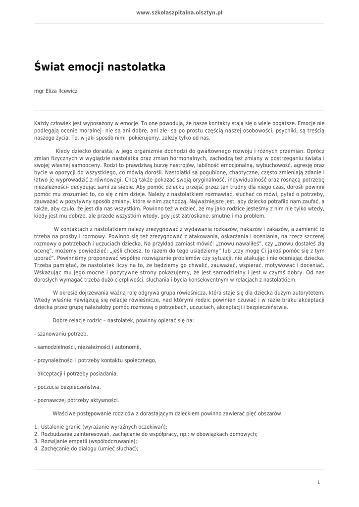 www.szkolaszpitalna.olsztyn.pl Świat emocji nastolatka mgr Eliza Ilcewicz Każdy człowiek jest wyposażony w emocje. To one powodują, że nasze kontakty stają się o wiele bogatsze. Emocje nie podlegają ocenie moralnej- nie są ani dobre, ani złe- są po prostu częścią naszej osobowości, psychiki, są treścią naszego życia. To, w jaki sposób nimi pokierujemy, zależy tylko od nas. Kiedy dziecko dorasta, w jego organizmie dochodzi do gwałtownego rozwoju i różnych przemian. Oprócz zmian fizycznych w wyglądzie nastolatka oraz zmian hormonalnych, zachodzą też zmiany w postrzeganiu świata i swojej własnej samooceny. Rodzi to prawdziwą burzę nastrojów, labilność emocjonalną, wybuchowość, agresję oraz bycie w opozycji do wszystkiego, co mówią dorośli. Nastolatki są pogubione, chaotyczne, często zmieniają zdanie i łatwo je wyprowadzić z równowagi. Chcą także pokazać swoją oryginalność, indywidualność oraz rosnącą potrzebę niezależności- decydując sami za siebie. Aby pomóc dziecku przejść przez ten trudny dla niego czas, dorośli powinni pomóc mu zrozumieć to, co się z nim dzieje. Należy z nastolatkiem rozmawiać, słuchać co mówi, pytać o potrzeby, zauważać w pozytywny sposób zmiany, które w nim zachodzą. Najważniejsze jest, aby dziecko potrafiło nam zaufać, a także, aby czuło, że jest dla nas wszystkim. Powinno też wiedzieć, że my jako rodzice jesteśmy z nim nie tylko wtedy, kiedy jest mu dobrze, ale przede wszystkim wtedy, gdy jest zatroskane, smutne i ma problem. W kontaktach z nastolatkiem należy zrezygnować z wydawania rozkazów, nakazów i zakazów, a zamienić to trzeba na prośby i rozmowy. Powinno się też zrezygnować z atakowania, oskarżania i oceniania, na rzecz szczerej rozmowy o potrzebach i uczuciach dziecka. Na przykład zamiast mówić: „znowu nawaliłeś”, czy „znowu dostałeś złą ocenę”, możemy powiedzieć: „jeśli chcesz, to razem do tego usiądziemy” lub „czy mogę Ci jakoś pomóc się z tym uporać”. Powinniśmy proponować wspólne rozwiązanie problemów czy sytuacji, nie atakując i nie oceniając dziecka. Trzeba pamiętać, że nastolatek liczy na to, że będziemy go chwalić, zauważać, wspierać, motywować i doceniać. Wskazując mu jego mocne i pozytywne strony pokazujemy, że jest samodzielny i jest w czymś dobry. Od nas dorosłych wymagać trzeba dużo cierpliwości, słuchania i bycia konsekwentnym w relacjach z nastolatkiem. W okresie dojrzewania ważną rolę odgrywa grupa rówieśnicza, która staje się dla dziecka dużym autorytetem. Wtedy właśnie nawiązują się relacje rówieśnicze, nad którymi rodzic powinien czuwać i w razie braku akceptacji dziecka przez grupę należałoby pomóc rozmową o potrzebach, uczuciach, akceptacji i bezpieczeństwie. Dobre relacje rodzic – nastolatek, powinny opierać się na: - szanowaniu potrzeb, - samodzielności, niezależności i autonomii, - przynależności i potrzeby kontaktu społecznego, - akceptacji i potrzeby posiadania, - poczucia bezpieczeństwa, - poznawczej potrzeby aktywności. Właściwe postępowanie rodziców z dorastającym dzieckiem powinno zawierać pięć obszarów. 1. 2. 3. 4. Ustalenie granic (wyrażanie wyraźnych oczekiwań); Rozbudzanie zainteresowań, zachęcanie do współpracy, np.: w obowiązkach domowych; Rozwijanie empatii (współodczuwanie); Zachęcanie do dialogu (umieć słuchać); 1 www.szkolaszpitalna.olsztyn.pl 5. Zachęcanie do odpowiedzialności i niezależności (dobry wybór prowadzi do dobrej samooceny, a niewłaściwe wybory należy traktować jako naukę na własnych błędach). Należy pamiętać o tym, że dzieci często nie rozumieją emocji, których doświadczają. Nie potrafią ich nazwać, znaleźć ich źródła. Nie wiedzą w jaki sposób sobie radzić z takimi stanami jak gniew czy frustracja. Potrzebują nas, byśmy pomogli im zdefiniować co czują. Powinniśmy stać się wyrozumiałym i cierpliwym opiekunem w powrocie do równowagi i zrozumienia tego, co się z nim dzieje. Powiedz dziecku, że jest dobre, że umie, że potrafi, a staniesz się jego przyjacielem i powiernikiem. 2