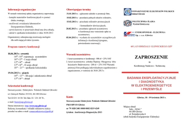 Informacje organizacyjne Obowiązujące terminy W ramach wniesionej opłaty organizatorzy zapewniają: 31.01.2013 r. - zgłoszenie udziału w promocji firm, - komplet materiałów konferencyjnych w postaci druku zwartego, - możliwość zwiedzania laboratoriów Energopomiaru-Elektryki, - serwis kawowy w przerwach obrad oraz dwa obiady, - udział w spotkaniu koleżeńskim w dniu 18.04.2013 15.02.2013 r. - przesłanie pełnych tekstów referatów, Organizatorzy zabezpieczają rezerwację noclegów dla osób mających takie życzenie. 15.02.2013 r. - przesłanie referatów promocyjnych i komunikatów akwizycyjnych, 28.02.2013 r. - przesłanie zgłoszeń uczestnictwa w konferencji oraz wniesienie opłat za uczestnictwo, 05.04.2013 r. - wysłanie do uczestników szczegółowych informacji o konferencji (program, potwierdzenie rezerwacji). 19.04.2013 r. -piątek l 000 - 13°° - III sesja i zakończenie obrad 1300-14°°- obiad POLITECHNIKA ŚLĄSKA Wydział Elektryczny ENERGOPOMIAR - ELEKTRYKA Sp. z o.o. Gliwice 60 LAT ODDZIAŁU GLIWICKIEGO SZP Program ramowy konferencji 18..04..2013 r. - czwartek l 000- l 030- rejestracja uczestników 1030-1300 - I sesja obrad 1300-1400 – obiad 1300-1400 - II sesja obrad 1830 - 2130 - spotkanie koleżeńskie STOWARZYSZENIE ELEKTRYKÓW POLSKICH Oddział Gliwicki Warunki uczestnictwa 1. koszt uczestnictwa w konferencji - 500 zł + 23% VAT 2. koszt uczestnictwa członka Śląskiej Okręgowej Izby Inżynierów Budownictwa - 200 zł + 23% VAT Warunki promocji firm podlegają indywidualnym uzgodnieniom z organizatorem, w terminie do 30.01.2013 r. ZAPROSZENIE na Konferencję Naukowo - Techniczną BADANIA EKSPLOATACYJYJNJE l DIAGNOSTYKA W ELEKTROENERGETYCE l PRZEMYŚLE Sekretariat konferencji Stowarzyszenie Elektryków Polskich Oddział Gliwicki ul. Górnych Wałów 25/210, 44-100 Gliwice Tel.32/231 14 30: Tel./faks 32 / 231 28 76 , Konto e-mail: [email protected] Stowarzyszenie Elektryków Polskich Oddział Gliwicki Strona internetowa: http://www.sep.gliwice.pl Referaty, komunikaty i wkładki reklamowe należy przesłać na adres e-mail: [email protected] PKO BP I/O Gliwice nr 79 1020 2401 0000 0002 0219 4249 tytułem : konferencja Diagnostyka 2013 Gliwice, 18 - 19 kwietnia 2013 r. Miejsce obrad: Sala „ MAG " 44-100 Gliwice ul. Świętokrzyska 6 (obok budynku Energopomiar- Elektryka) Szanowni Państwo Konferencja adresowana jest do specjalistów: W roku jubileuszu 60-lecia Oddziału Gliwickiego Stowarzyszenia Elektryków Polskich, zapraszamy do udziału w konferencji naukowo technicznej, będącej forum wymiany myśli i doświadczeń z zakresu badań eksploatacyjnych i diagnostyki w elektroenergetyce zawodowej i przemyśle. - służb technicznych przedsiębiorstw energetycznych: wytwórczych, sieciowych i dystrybucji energii elektrycznej, - służb eksploatacyjnych przedsiębiorstw i zakładów przemysłowych, - firm wykonawczych urządzeń i instalacji elektrycznych, - firm i zespołów pomiarowo - ruchowych wykonujących zawodowo prace pomiarowo - ruchowe, badania diagnostyczne, rozruchy i oceny techniczne, - jednostek naukowo - technicznych zajmujących się problematyką badań i diagnostyki, - producentów, dystrybutorów urządzeń kontrolnopomiarowych, systemów diagnostyki i pomiarów elektrycznych. Celem konferencji jest przedstawienie aktualnej sytuacji oraz zaprezentowanie m/nowszych kierunków rozwoju badań diagnostycznych w eksploatacji urządzeń, instalacji i sieci elektroenergetycznych, ich znaczenia w zapewnieniu pewności dostaw energii elektrycznej i bezpieczeństwa pracy służb eksploatacji. Dążeniem organizatorów jest by konferencja miała charakter praktyczne - szkoleniowy. Tematy preferowane Komitet honorowy Prof. dr hab. inż. Paweł Sowa Dziekan Wydziału Elektrycznego Mgr inż. Andrzej S. Grabowski Prezes Oddziału Gliwickiego SEP Mgr inż. Daniel Pawłowski Prezes Energopomiar - Elektryka Sp. z o.o. Komitet programowo-organizacyjny Dr hab. inż. Kazimierz Gierlotka prof. Poi. Śl. przewodniczący Wydział Elektryczny Poi. Śl. Dr inż. Roman Miksiewicz Wydział Elektryczny Poi. Śl. Mgr inż. Andrzej Sanocki Energopomiar – Elektryka Mgr inż. Andrzej Ciepły - sekretarz konferencji Oddział Gliwicki SEP Mgr inż. Kazimierz Boba Oddział Gliwicki SEP Mgr inż. Andrzej Sielski Oddział Gliwicki SEP - problemy metrologii elektrycznej w elektroenergetyce i przemyśle, - tendencje rozwoju systemów diagnostyki i badań eksploatacyjnych, - badania diagnostyczne maszyn, urządzeń, sieci i instalacji elektrycznych: napędów, transformatorów, stacji i układów rozdzielczych, kabli i instalacji, - systemy monitorowania, układy automatycznej kontroli pracy sieci i urządzeń elektroenergetycznych, - dopuszczanie i eksploatacja urządzeń w atmosferze SF6, - organizacja prac pomiarowo - badawczych, - pomiary ruchowe i rozliczeniowe energii elektrycznej, - pomiary, diagnostyka w elektroenergetyce w aspekcie ochrony środowiska, - systemy nadzoru i urządzenia obiektowe oferowane przez firmy specjalistyczne Zgłoszenia referatów Wiodące referaty są zamawiane przez organizatorów. Organizatorzy zachęcają również uczestników do zgłaszania innych referatów i komunikatów z zakresu proponowanej tematyki konferencji. Referaty zamawiane należy opracować zgodnie ze wskazówkami, które będą wysyłane przez sekretariat konferencji wraz z zaproszeniami na konferencję. Wskazówki dla autorów referatów, zgłaszanych przez uczestników konferencji, zostaną przedstawione na stronie internetowej konferencji. Mile widziane będą referaty promocyjne oraz komunikaty przedsiębiorstw specjalistycznych oferujących urządzenia, aparaturę pomiarową lub systemy pomiarowe i usługi pomiarowo diagnostyczne . Przyjęte przez Komitet programowo - organizacyjny referaty i komunikaty zostaną wydrukowane w materiałach konferencyjnych. Autorzy o przyjęciu referatów lub komunikatów zostaną powiadomieni drogą elektroniczną. Promocja firm 