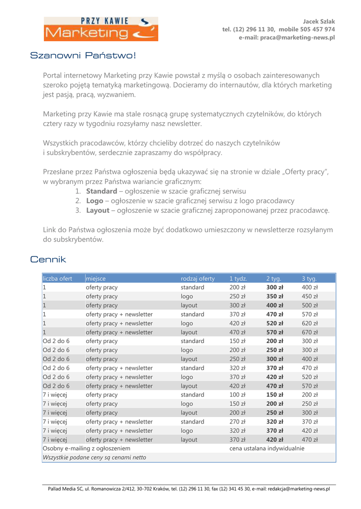Jacek Szlak tel. (12) 296 11 30, mobile 505 457 974 e-mail: [email protected] Szanowni Państwo! Portal internetowy Marketing przy Kawie powstał z myślą o osobach zainteresowanych szeroko pojętą tematyką marketingową. Docieramy do internautów, dla których marketing jest pasją, pracą, wyzwaniem. Marketing przy Kawie ma stale rosnącą grupę systematycznych czytelników, do których cztery razy w tygodniu rozsyłamy nasz newsletter. Wszystkich pracodawców, którzy chcieliby dotrzeć do naszych czytelników i subskrybentów, serdecznie zapraszamy do współpracy. Przesłane przez Państwa ogłoszenia będą ukazywać się na stronie w dziale „Oferty pracy”, w wybranym przez Państwa wariancie graficznym: 1. Standard – ogłoszenie w szacie graficznej serwisu 2. Logo – ogłoszenie w szacie graficznej serwisu z logo pracodawcy 3. Layout – ogłoszenie w szacie graficznej zaproponowanej przez pracodawcę. Link do Państwa ogłoszenia może być dodatkowo umieszczony w newsletterze rozsyłanym do subskrybentów. Cennik liczba ofert miejsce 1 oferty pracy 1 oferty pracy 1 oferty pracy 1 oferty pracy + newsletter 1 oferty pracy + newsletter 1 oferty pracy + newsletter Od 2 do 6 oferty pracy Od 2 do 6 oferty pracy Od 2 do 6 oferty pracy Od 2 do 6 oferty pracy + newsletter Od 2 do 6 oferty pracy + newsletter Od 2 do 6 oferty pracy + newsletter 7 i więcej oferty pracy 7 i więcej oferty pracy 7 i więcej oferty pracy 7 i więcej oferty pracy + newsletter 7 i więcej oferty pracy + newsletter 7 i więcej oferty pracy + newsletter Osobny e-mailing z ogłoszeniem Wszystkie podane ceny są cenami netto rodzaj oferty standard logo layout standard logo layout standard logo layout standard logo layout standard logo layout standard logo layout 1 tydz. 2 tyg. 3 tyg. 200 zł 300 zł 400 zł 250 zł 350 zł 450 zł 300 zł 400 zł 500 zł 370 zł 470 zł 570 zł 420 zł 520 zł 620 zł 470 zł 570 zł 670 zł 150 zł 200 zł 300 zł 200 zł 250 zł 300 zł 250 zł 300 zł 400 zł 320 zł 370 zł 470 zł 370 zł 420 zł 520 zł 420 zł 470 zł 570 zł 100 zł 150 zł 200 zł 150 zł 200 zł 250 zł 200 zł 250 zł 300 zł 270 zł 320 zł 370 zł 320 zł 370 zł 420 zł 370 zł 420 zł 470 zł cena ustalana indywidualnie Pallad Media SC, ul. Romanowicza 2/412, 30-702 Kraków, tel. (12) 296 11 30, fax (12) 341 45 30, e-mail: [email protected] Jacek Szlak tel. (12) 296 11 30, mobile 505 457 974 e-mail: [email protected] O portalu Marketing przy Kawie Marketing przy Kawie to branżowa baza wiedzy o marketingu i reklamie, skierowana do profesjonalistów i pasjonatów. Prezentuje w sposób przystępny analizy, wyniki badań, opinie, poglądy i idee marketingowe. Opisuje najbardziej aktualne zagadnienia i trendy. Gromadzi również bieżące informacje ze świata marketingu i reklamy. Marketing przy Kawie jest prawdopodobnie największą bezpłatną bazą wiedzy i inspiracji z dziedziny marketingu w Polsce. Marketing przy Kawie to także newslettery rozsyłane cztery razy w tygodniu do ponad 70 000 subskrybentów. Kontakt Jacek Szlak tel. (12) 296 11 30, mobile 505 457 974 e-mail: [email protected] Pallad Media SC, ul. Romanowicza 2/412, 30-702 Kraków, tel. (12) 296 11 30, fax (12) 341 45 30, e-mail: [email protected] Jacek Szlak tel. (12) 296 11 30, mobile 505 457 974 e-mail: [email protected] Statystyki oglądalności i profil czytelnika 60 000 unikalnych użytkowników miesięcznie (Google Analytics, marzec 2011 r.) Ponad 250 000 odsłon miesięcznie (Google Analytics, marzec 2011 r.) Ponad 80 000 prenumeratorów Ponad połowa z nich to właściciele firm, managerowie i specjaliści Nasi subskrybenci to marketerzy, osoby związane z marketingiem lub zainteresowane tą problematyką Dwie trzecie to kobiety 46% jest w wieku 26–35 lat 24% jest w wieku 18–25 lat 26% osób pracuje w firmach zatrudniających ponad 100 pracowników, 19% w firmach liczących 51–100 pracowników, 26% w firmach liczących 11–50 pracowników Wszyscy otrzymujący nasze e-maile zarejestrowali się w serwisie dobrowolnie i wyrazili oraz potwierdzili wolę otrzymywania naszych publikacji Ponad 13 000 fanów na Facebooku (maj 2011 r.) statystyki na podstawie danych z 10 tys. formularzy rejestracyjnych Pallad Media SC, ul. Romanowicza 2/412, 30-702 Kraków, tel. (12) 296 11 30, fax (12) 341 45 30, e-mail: [email protected] Jacek Szlak tel. (12) 296 11 30, mobile 505 457 974 e-mail: [email protected] Pallad Media SC, ul. Romanowicza 2/412, 30-702 Kraków, tel. (12) 296 11 30, fax (12) 341 45 30, e-mail: [email protected]