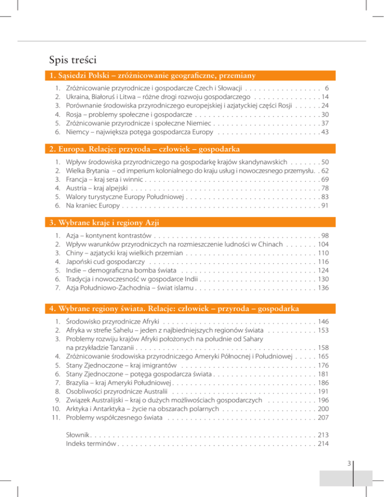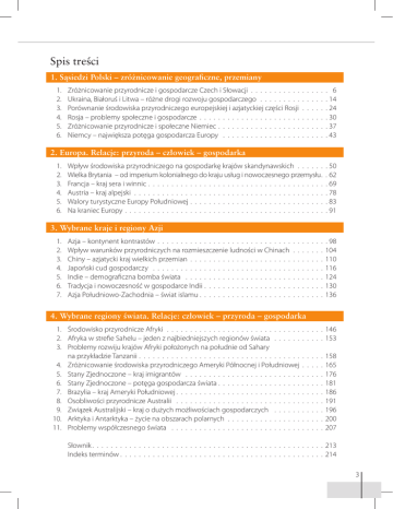 Spis treści 1. Sąsiedzi Polski – zróżnicowanie geograficzne, przemiany 1. 2. 3. 4. 5. 6. Zróżnicowanie przyrodnicze i gospodarcze Czech i Słowacji . . . . . . . . . . . Ukraina, Białoruś i Litwa – różne drogi rozwoju gospodarczego . . . . . . . . . Porównanie środowiska przyrodniczego europejskiej i azjatyckiej części Rosji Rosja – problemy społeczne i gospodarcze . . . . . . . . . . . . . . . . . . . . . . Zróżnicowanie przyrodnicze i społeczne Niemiec . . . . . . . . . . . . . . . . . . Niemcy – największa potęga gospodarcza Europy . . . . . . . . . . . . . . . . . . . . . . . . . . . . . . . . . . . . . . . . . . . . . . . . 6 . 14 . 24 . 30 . 37 . 43 Wpływ środowiska przyrodniczego na gospodarkę krajów skandynawskich . . . . . . Wielka Brytania – od imperium kolonialnego do kraju usług i nowoczesnego przemysłu . Francja – kraj sera i winnic . . . . . . . . . . . . . . . . . . . . . . . . . . . . . . . . . . . . . . Austria – kraj alpejski . . . . . . . . . . . . . . . . . . . . . . . . . . . . . . . . . . . . . . . . . Walory turystyczne Europy Południowej . . . . . . . . . . . . . . . . . . . . . . . . . . . . . Na kraniec Europy . . . . . . . . . . . . . . . . . . . . . . . . . . . . . . . . . . . . . . . . . . . . 50 . 62 . 69 . 78 . 83 . 91 2. Europa. Relacje: przyroda – człowiek – gospodarka 1. 2. 3. 4. 5. 6. 3. Wybrane kraje i regiony Azji 1. 2. 3. 4. 5. 6. 7. Azja – kontynent kontrastów . . . . . . . . . . . . . . . . . . . . . . . . . . . . . Wpływ warunków przyrodniczych na rozmieszczenie ludności w Chinach Chiny – azjatycki kraj wielkich przemian . . . . . . . . . . . . . . . . . . . . . . Japoński cud gospodarczy . . . . . . . . . . . . . . . . . . . . . . . . . . . . . . Indie – demograficzna bomba świata . . . . . . . . . . . . . . . . . . . . . . . Tradycja i nowoczesność w gospodarce Indii . . . . . . . . . . . . . . . . . . . Azja Południowo-Zachodnia – świat islamu . . . . . . . . . . . . . . . . . . . . . . . . . . . . . . . . . . . . . . . . . . . . . . . . . . . . . . . . . . . . . . . . . . . . . . 98 104 110 116 124 130 136 4. Wybrane regiony świata. Relacje: człowiek – przyroda – gospodarka 1. Środowisko przyrodnicze Afryki . . . . . . . . . . . . . . . . . . . . . . . . . . . . . 2. Afryka w strefie Sahelu – jeden z najbiedniejszych regionów świata . . . . . . 3. Problemy rozwiju krajów Afryki położonych na południe od Sahary na przykładzie Tanzanii . . . . . . . . . . . . . . . . . . . . . . . . . . . . . . . . . . . 4. Zróżnicowanie środowiska przyrodniczego Ameryki Północnej i Południowej 5. Stany Zjednoczone – kraj imigrantów . . . . . . . . . . . . . . . . . . . . . . . . . 6. Stany Zjednoczone – potęga gospodarcza świata . . . . . . . . . . . . . . . . . . 7. Brazylia – kraj Ameryki Południowej . . . . . . . . . . . . . . . . . . . . . . . . . . . 8. Osobliwości przyrodnicze Australii . . . . . . . . . . . . . . . . . . . . . . . . . . . 9. Związek Australijski – kraj o dużych możliwościach gospodarczych . . . . . . 10. Arktyka i Antarktyka – życie na obszarach polarnych . . . . . . . . . . . . . . . . 11. Problemy współczesnego świata . . . . . . . . . . . . . . . . . . . . . . . . . . . . . . . . . 146 . . . . . 153 . . . . . . . . . . . . . . . . . . . . . . . . . . . . . . . . . . . . . . . . . . . . . 158 165 176 181 186 191 196 200 207 Słownik . . . . . . . . . . . . . . . . . . . . . . . . . . . . . . . . . . . . . . . . . . . . . . . . . . 213 Indeks terminów . . . . . . . . . . . . . . . . . . . . . . . . . . . . . . . . . . . . . . . . . . . . 214 3