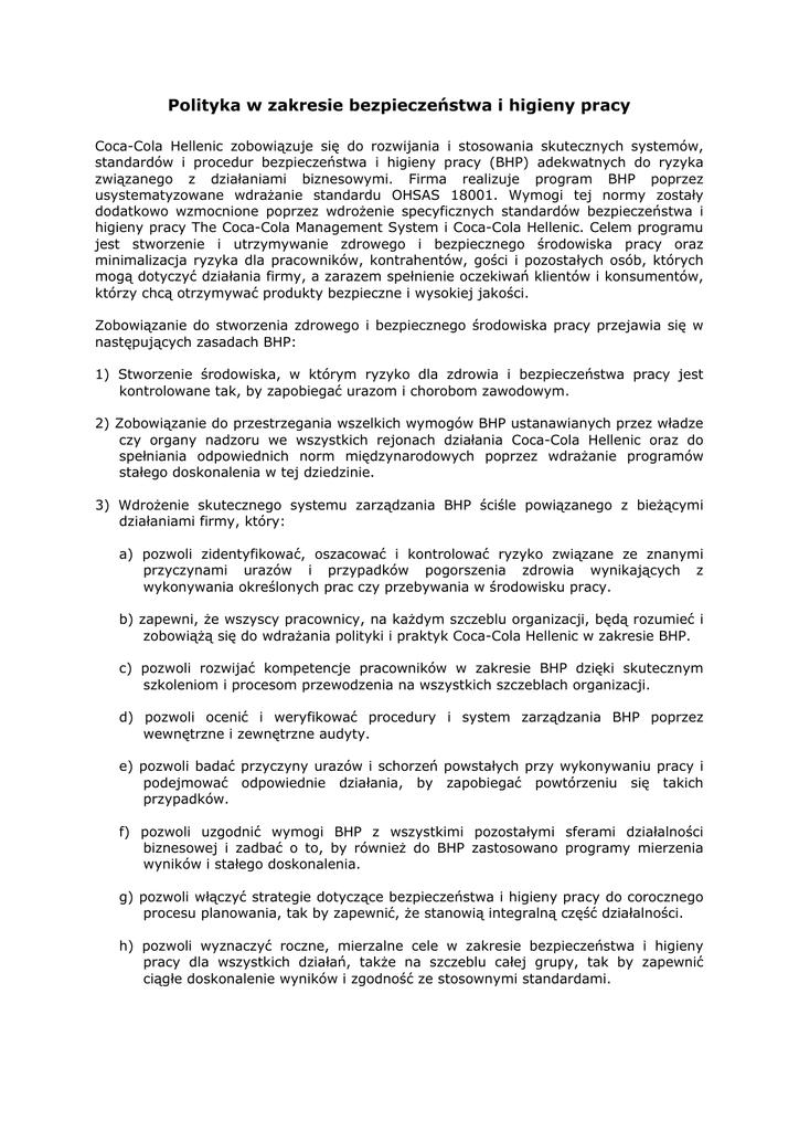 Polityka w zakresie bezpieczeństwa i higieny pracy Coca-Cola Hellenic zobowiązuje się do rozwijania i stosowania skutecznych systemów, standardów i procedur bezpieczeństwa i higieny pracy (BHP) adekwatnych do ryzyka związanego z działaniami biznesowymi. Firma realizuje program BHP poprzez usystematyzowane wdrażanie standardu OHSAS 18001. Wymogi tej normy zostały dodatkowo wzmocnione poprzez wdrożenie specyficznych standardów bezpieczeństwa i higieny pracy The Coca-Cola Management System i Coca-Cola Hellenic. Celem programu jest stworzenie i utrzymywanie zdrowego i bezpiecznego środowiska pracy oraz minimalizacja ryzyka dla pracowników, kontrahentów, gości i pozostałych osób, których mogą dotyczyć działania firmy, a zarazem spełnienie oczekiwań klientów i konsumentów, którzy chcą otrzymywać produkty bezpieczne i wysokiej jakości. Zobowiązanie do stworzenia zdrowego i bezpiecznego środowiska pracy przejawia się w następujących zasadach BHP: 1) Stworzenie środowiska, w którym ryzyko dla zdrowia i bezpieczeństwa pracy jest kontrolowane tak, by zapobiegać urazom i chorobom zawodowym. 2) Zobowiązanie do przestrzegania wszelkich wymogów BHP ustanawianych przez władze czy organy nadzoru we wszystkich rejonach działania Coca-Cola Hellenic oraz do spełniania odpowiednich norm międzynarodowych poprzez wdrażanie programów stałego doskonalenia w tej dziedzinie. 3) Wdrożenie skutecznego systemu zarządzania BHP ściśle powiązanego z bieżącymi działaniami firmy, który: a) pozwoli zidentyfikować, oszacować i kontrolować ryzyko związane ze znanymi przyczynami urazów i przypadków pogorszenia zdrowia wynikających z wykonywania określonych prac czy przebywania w środowisku pracy. b) zapewni, że wszyscy pracownicy, na każdym szczeblu organizacji, będą rozumieć i zobowiążą się do wdrażania polityki i praktyk Coca-Cola Hellenic w zakresie BHP. c) pozwoli rozwijać kompetencje pracowników w zakresie BHP dzięki skutecznym szkoleniom i procesom przewodzenia na wszystkich szczeblach organizacji. d) pozwoli ocenić i weryfikować procedury i system zarządzania BHP poprzez wewnętrzne i zewnętrzne audyty. e) pozwoli badać przyczyny urazów i schorzeń powstałych przy wykonywaniu pracy i podejmować odpowiednie działania, by zapobiegać powtórzeniu się takich przypadków. f) pozwoli uzgodnić wymogi BHP z wszystkimi pozostałymi sferami działalności biznesowej i zadbać o to, by również do BHP zastosowano programy mierzenia wyników i stałego doskonalenia. g) pozwoli włączyć strategie dotyczące bezpieczeństwa i higieny pracy do corocznego procesu planowania, tak by zapewnić, że stanowią integralną część działalności. h) pozwoli wyznaczyć roczne, mierzalne cele w zakresie bezpieczeństwa i higieny pracy dla wszystkich działań, także na szczeblu całej grupy, tak by zapewnić ciągłe doskonalenie wyników i zgodność ze stosownymi standardami. W ramach działań na rzecz osiągnięcia stanu doskonałego w dziedzinie BHP, Coca-Cola Hellenic przedstawia swe działania w tej dziedzinie w corocznym raporcie o społecznej odpowiedzialności firmy. Jako Dyrektor Generalny uznaję „Politykę w zakresie bezpieczeństwa i higieny pracy”, ustaloną i zatwierdzoną przez komitet ds. społecznej odpowiedzialności biznesu w radzie nadzorczej, za wiążącą. Odpowiedzialność za wdrażanie z powodzeniem tego programu spoczywa na każdym pracowniku Coca-Cola Hellenic, niezależnie od szczebla w firmowej hierarchii i zajmowanego stanowiska. Doros Constantinou Dyrektor Generalny 20 czerwca 2008 r. Ostatnia aktualizacja: czerwiec 2008