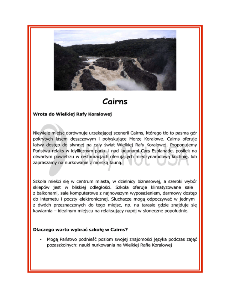Cairns Wrota do Wielkiej Rafy Koralowej Niewiele miejsc dorównuje urzekającej scenerii Cairns, którego tło to pasma gór pokrytych lasem deszczowym i połyskujące Morze Koralowe. Cairns oferuje łatwy dostęp do słynnej na cały świat Wielkiej Rafy Koralowej. Proponujemy Państwu relaks w idyllicznym parku i nad lagunami Cars Esplanade, posiłek na otwartym powietrzu w restauracjach oferujących międzynarodową kuchnię, lub zapraszamy na nurkowanie z morską fauną. Szkoła mieści się w centrum miasta, w dzielnicy biznesowej, a szeroki wybór sklepów jest w bliskiej odległości. Szkoła oferuje klimatyzowane sale z balkonami, sale komputerowe z najnowszym wyposażeniem, darmowy dostęp do internetu i poczty elektronicznej. Słuchacze mogą odpoczywać w jednym z dwóch przeznaczonych do tego miejsc, np. na tarasie gdzie znajduje się kawiarnia – idealnym miejscu na relaksujący napój w słoneczne popołudnie. Dlaczego warto wybrać szkołę w Cairns? • Mogą Państwo podnieść poziom swojej znajomości języka podczas zajęć pozaszkolnych: nauki nurkowania na Wielkiej Rafie Koralowej Kursy i daty rozpoczęcia Kurs Ilość tygodni Data rozpoczęcia Angielski na wakacjach 2-17 Każdy poniedziałek (lub wtorek jeśli poniedziałek jest dniem ustawowo wolnym od pracy) Angielski intensywny (w tym kursy dla początkujących) 2+ Każdy poniedziałek (lub wtorek jeśli poniedziałek jest dniem ustawowo wolnym od pracy) Angielski dla biznesu 2+ • • • • • Na życzenie Extra services (dodatkowe usługi): Ubezpieczenie na czas podroży i zdrowotne Zajęcia indywidualne z nauczycielem Transfer z lotniska (Cairns International) Pomoc w ubieganiu się o przyjęcie na uniwersytet Praktyki Accommodation Options (Opcje zakwaterowania) Nazwa zakwaterowania Rodzaj pokoju Posiłki Wiek (minimum) U rodziny australijskiej Jednoosobowy 16/tydzień 18 U rodziny australijskiej, poniżej 18 roku życia Jednoosobowy 16/tydzień 16 Hostel Cairns Sharehouse Dwuosobowy Bez posiłków (osobne łóżka)/ Jednoosobowy 18