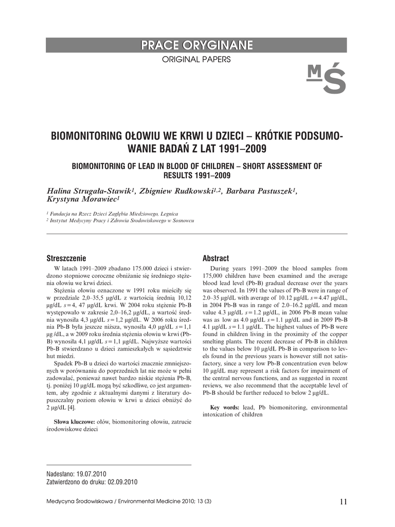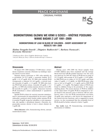 PRACE ORYGINANE ORIGINAL PAPERS BIOMONITORING O¸OWIU WE KRWI U DZIECI – KRÓTKIE PODSUMOWANIE BADA¡ Z LAT 1991–2009 BIOMONITORING OF LEAD IN BLOOD OF CHILDREN – SHORT ASSESSMENT OF RESULTS 1991–2009 Halina Struga∏a-Stawik1, Zbigniew Rudkowski1,2, Barbara Pastuszek1, Krystyna Morawiec1 1 2 Fundacja na Rzecz Dzieci Zag∏´bia Miedziowego, Legnica Instytut Medycyny Pracy i Zdrowia Srodowiskowego w Sosnowcu Streszczenie Abstract W latach 1991–2009 zbadano 175.000 dzieci i stwierdzono stopniowe coroczne obni˝anie si´ Êredniego st´˝enia o∏owiu we krwi dzieci. St´˝enia o∏owiu oznaczone w 1991 roku mieÊci∏y si´ w przedziale 2,0–35,5 µg/dL z wartoÊcià Êrednià 10,12 µg/dL s44, 47 µg/dL krwi. W 2004 roku st´˝enie Pb-B wyst´powa∏o w zakresie 2,0–16,2 µg/dL, a wartoÊç Êrednia wynosi∏a 4,3 µg/dL s41,2 µg/dL. W 2006 roku Êrednia Pb-B by∏a jeszcze ni˝sza, wynosi∏a 4,0 µg/dL s41,1 µg /dL, a w 2009 roku Êrednia st´˝enia o∏owiu w krwi (PbB) wynosi∏a 4,1 µg/dL s41,1 µg/dL. Najwy˝sze wartoÊci Pb-B stwierdzano u dzieci zamieszka∏ych w sàsiedztwie hut miedzi. Spadek Pb-B u dzieci do wartoÊci znacznie zmniejszonych w porównaniu do poprzednich lat nie mo˝e w pe∏ni zadowalaç, poniewa˝ nawet bardzo niskie st´˝enia Pb-B, tj. poni˝ej 10 µg/dL mogà byç szkodliwe, co jest argumentem, aby zgodnie z aktualnymi danymi z literatury dopuszczalny poziom o∏owiu w krwi u dzieci obni˝yç do 2 µg/dL [4]. During years 1991–2009 the blood samples from 175,000 children have been examined and the average blood lead level (Pb-B) gradual decrease over the years was observed. In 1991 the values of Pb-B were in range of 2.0–35 µg/dL with average of 10.12 µg/dL s44.47 µg/dL, in 2004 Pb-B was in range of 2.0–16.2 µg/dL and mean value 4.3 µg/dL s41.2 µg/dL, in 2006 Pb-B mean value was as low as 4.0 µg/dL s41.1 µg/dL and in 2009 Pb-B 4.1 µg/dL s41.1 µg/dL. The highest values of Pb-B were found in children living in the proximity of the copper smelting plants. The recent decrease of Pb-B in children to the values below 10 µg/dL Pb-B in comparison to levels found in the previous years is however still not satisfactory, since a very low Pb-B concentration even below 10 µg/dL may represent a risk factors for impairment of the central nervous functions, and as suggested in recent reviews, we also recommend that the acceptable level of Pb-B should be further reduced to below 2 µg/dL. Key words: lead, Pb biomonitoring, environmental intoxication of children S∏owa kluczowe: o∏ów, biomonitoring o∏owiu, zatrucie Êrodowiskowe dzieci Nades∏ano: 19.07.2010 Zatwierdzono do druku: 02.09.2010 Medycyna Ârodowiskowa / Environmental Medicine 2010; 13 (3) 11 Przewlek∏e zatrucie niskimi dawkami o∏owiu jest od dawna powa˝nym problemem zdrowotnym, który mimo up∏ywu lat nadal ma ogromne znaczenie, zw∏aszcza w wieku rozwojowym bioràc pod uwag´ wielonarzàdowe uszkodzenia powodowane przez ten ksenobiotyczny metal [1]. Âwiatowa Organizacja Zdrowia prowadzi nadal aktywnà kampani´ w celu eliminacji chorób dzieci wywo∏anych ekspozycjà na o∏ów, poniewa˝ o∏ów jest przede wszystkim uznanym czynnikiem neurotoksycznym, szczególnie w okresie prenatalnym, co tym samym powoduje, ˝e populacja dzieci jest najbardziej wra˝liwa i nara˝ona na ujemne skutki jego dzia∏ania (childrensenvhealth@who. int) Podstaw´ oceny wielkoÊci nara˝enia Êrodowiskowego dzieci na o∏ów oraz wystàpienia potencjalnych skutków zdrowotnych nara˝enia stanowi obecnie pomiar st´˝eƒ o∏owiu we krwi (Pb-B). Fundacja na Rzecz Dzieci Zag∏´bia Miedziowego w Legnicy od 1991 r. w ramach monitoringu biologicznego prowadzi badania przesiewowe st´˝enia o∏owiu we krwi dzieci z terenu Dolnego Âlàska. W ciàgu minionych 18 lat do koƒca 2009 r. obj´to nimi ponad 175 tys. dzieci badanych w ró˝nych miejscowoÊciach Legnicko-G∏ogowskiego Zag∏´bia Miedziowego, g∏ównie dzieci szkolnych. Obserwujàc wyniki badania Pb-B w ciàgu kolejnych lat stwierdza si´ stopniowe coroczne obni˝anie si´ Êredniego st´˝enia o∏owiu we krwi dzieci (ryc. 1). Wykres Êrednich i przedz. ufnoÊci (95,00%) 13 12 11 10 9 Pb 8 7 6 5 4 3 G-PB 2 1991 1993 1995 1997 1999 2001 2003 2005 2007 2009 G-DATA_BAD-ROK Rycina 1. Zestawienie wartoÊci Êrednich o∏owiu we krwi dzieci (0–18 lat) w badaniach w latach 1991–2009 Figure 1. Average levels of Pb-B in blood of children (0–18 years old) according to studies cenducted from 1991–2009 St´˝enia o∏owiu oznaczone w 1991 roku mieÊci∏y si´ w przedziale 2,0–35,5 µg/dL z wartoÊcià Êrednià 10,12 µg/dL s44,47 µg/dL krwi. W 2004 roku st´˝enie Pb-B wyst´powa∏o w zakresie 2,0–16,2 µg/dL, a wartoÊç Êrednia wynosi∏a 4,3 µg/dL s41,2 µg/dL W 2006 roku Êrednia Pb-B by∏a jeszcze ni˝sza tj. wynosi∏a 4,0 µg/dL s41,1 µg/dL, a w 2009 roku Êrednia st´˝enia o∏owiu w krwi (Pb-B) wynosi∏a 4,1 µg/dL s41,1 µg/dL. Najwy˝sze Êrednie st´˝enia o∏owiu we krwi i najwy˝szy odsetek dzieci, u których stwierdzono przekroczenie st´˝enia dopusz- 12 czalnego (które przyj´liÊmy jako 6 µg/dL), odnotowano w gminach zlokalizowanych w bliskoÊci êróde∏ emisji o∏owiu – hut miedzi. Wyniki oznaczeƒ uzyskanych w latach 1991– 2009 przez laboratorium Toksykologii Metali Ci´˝kich Fundacji na Rzecz Dzieci Zag∏´bia Miedziowego wskazujà, ˝e u dzieci mieszkajàcych na terenach po∏o˝onych w bezpoÊrednim sàsiedztwie du˝ych emitorów stwierdza si´ nadmierne nara˝enie na o∏ów (ryc. 2). W zwiàzku z powy˝szym Fundacja prowadzi badania przesiewowe w celu identyfikacji Medycyna Ârodowiskowa / Environmental Medicine 2010; 13 (3) dzieci z podwy˝szonym st´˝eniem Pb-B oraz dzia∏ania profilaktyczne w celu ograniczeƒ skutków nara˝enia m.in. przez wychowanie prozdrowotne, kszta∏towanie odpowiednich nawyków higienicznych i ˝ywieniowych Znaczàcy wp∏yw na stan intoksykacji o