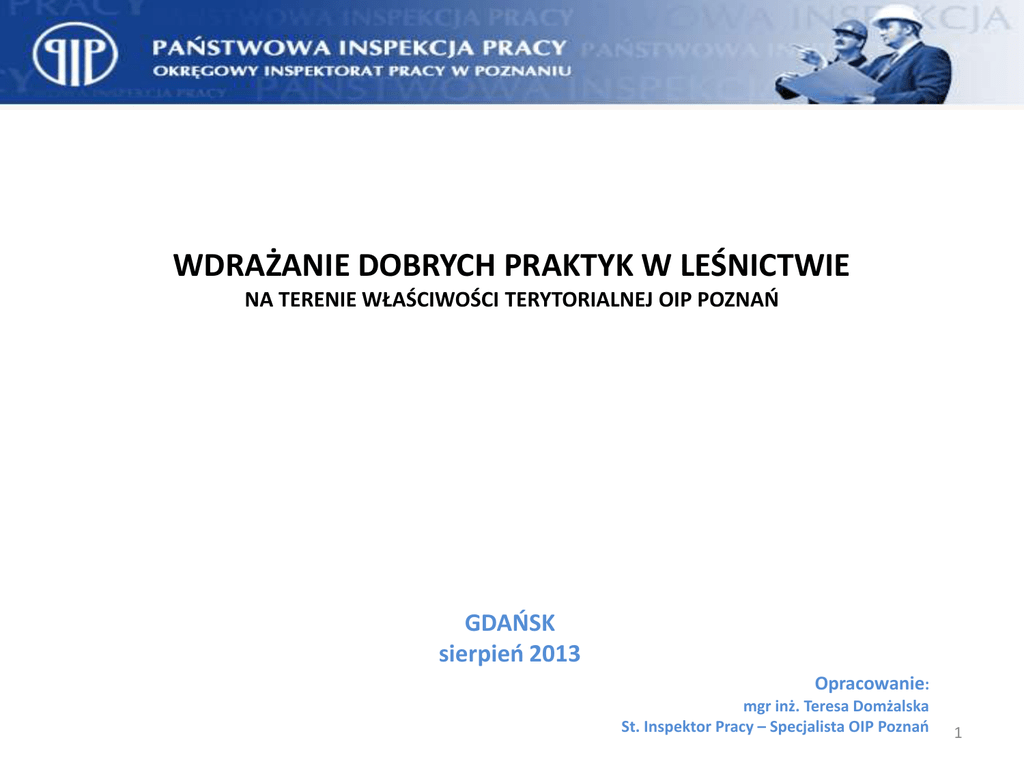 WDRAŻANIE DOBRYCH PRAKTYK W LEŚNICTWIE NA TERENIE WŁAŚCIWOŚCI TERYTORIALNEJ OIP POZNAŃ GDAŃSK sierpień 2013 Opracowanie: mgr inż. Teresa Domżalska St. Inspektor Pracy – Specjalista OIP Poznań 1 Dobre praktyki w zarządzaniu bezpieczeństwem i higieną pracy to skuteczne rozwiązania, które przynoszą wymierne korzyści w zakresie poprawy bezpieczeństwa pracy. Misją Państwowej Inspekcji Pracy jest zapobieganie i eliminowanie zagrożeń w środowisku pracy. W ramach właściwości terytorialnej Okręgowy Inspektor Pracy w Poznaniu opracował Wielkopolską Strategię Przeciwdziałania Wypadkom przy Pracy 2010-2012. Do udziału w planowaniu i realizacji zamierzeń zaproszono przedstawicieli administracji rządowej i samorządowej, organy nadzoru nad warunkami pracy, związki zawodowe, organizacje pracodawców, samorząd gospodarczy i zawodowy oraz wszystkich zainteresowanych działalnością na rzecz poprawy warunków pracy. Jednym z głównych zadań strategii jest m.in. propagowanie dobrych praktyk w procesach produkcyjnych. Przy obecnym poziomie technicznym i technologicznym ograniczanie się tylko do przestrzegania samych przepisów bezpieczeństwa i higieny pracy jest niewystarczające. W każdym procesie produkcyjnym bardzo ważne jest zarządzanie bezpieczeństwem pracy i wdrażanie w sposób systemowy procedur zapewniających bezpieczne warunki pracy. 2 W ramach ww. strategii w 2012r. w Wielkopolsce podjęto daleko idące działania zmierzające do opracowania dobrych praktyk w leśnictwie z uwagi na dużą koncentrację zagrożeń wypadkowych i chorobowych występujących przy pracach związanych z prowadzoną gospodarką leśną. Wdrażanie dobrych praktyk w gospodarce leśnej ma na celu zmniejszenie całkowitego potencjału narażenia na zagrożenia pracowników lub innych osób związanych z przedsiębiorstwem, wynikającego ze zidentyfikowanego źródła zagrożenia, poprawę ogólnych warunków pracy poprzez dążenie do jak najlepszych bezpiecznych i higienicznych warunków wykonywania pracy oraz skuteczną promocję zdrowia, bezpieczeństwa i wydajności pracowników zatrudnionych przy wykonywaniu prac leśnych oraz osiągnięcie stałego i wyraźnego zmniejszenia zagrożenia dla pracowników. 3 Dobre praktyki powinny wskazywać metody i kroki, które można podjąć w miejscu pracy lub organizacji w celu poprawy warunków pracy i życia, lub zmniejszenia zagrożenia dla bezpieczeństwa i zdrowia w miejscu pracy, koncentrować się w miarę możliwości na identyfikacji zagrożenia u źródła, być skuteczne i etyczne, spełniać odpowiednie wymogi ustawowe, być aktualne i dostosowane do potrzeb docelowych użytkowników oraz praktyk w zakresie pracy, zawierać wystarczające informacje, tak by można było je zastosować w każdym miejscu pracy, zakładać poważne zaangażowanie wszystkich stron, w szczególności tych pracowników i ich przedstawicieli, którzy będą bezpośrednio uczestniczyć w podejmowanych działaniach. 4 Dotychczasowe doświadczenia wynikające z prowadzonych przez PIP działań kontrolno-nadzorczych w sektorze usług leśnych wskazują, że osiągnięcie zamierzonego celu jest możliwe przy współudziale i współpracy oraz konstruktywnych i zintegrowanych działaniach ze strony służb Lasów Państwowych oraz innych organów nadzoru i kontroli (PIS, UDT). Leśnictwo stanowi trudną i niebezpieczną gałąź przemysłu z uwagi na specyficzne warunki pracy. Teren prac leśnych jest zwykle bardzo rozległy, a poszczególne powierzchnie robocze rozproszone na dużym obszarze, co znacznie utrudnia bezpieczne zorganizowanie wszystkich stanowisk pracy i zadbanie o bezpieczeństwo pracowników. Wykonywane zabiegi i prace leśne mają charakter tymczasowy, sezonowy, co ma duży wpływ na wielkość zatrudnienia w prywatnych zakładach usług leśnych. 5 Prowadzenie działań inspekcyjnych w przedsiębiorstwach leśnych przy braku współpracy z Regionalną Dyrekcją Lasów Państwowych oraz przedstawicielami nadleśnictw stanowi duże wyzwanie dla inspektorów pracy w zakresie ustalenia miejsca wykonywania pracy. Usługi w zakresie gospodarki leśnej obejmują szereg prac: tj. pozyskanie i zrywkę drewna, ochronę lasu, ochronę przeciwpożarową, hodowle lasu, nasiennictwo, uboczne użytkowanie lasu, a zespoły robocze, które je wykonują na jednej powierzchni roboczej są często 2 - 4 osobowe. W celu poprawy bezpieczeństwa oraz standardów pracy dobre praktyki w branży leśnej należy rozpatrywać na obszarach dotyczących: personelu (pracowników); organizacji pracy; narzędzi, maszyn i urządzeń technicznych. 6 Pierwszy obszar dotyczący pracowników obejmuje m.in. zagadnienia dotyczące przygotowania zawodowego, w tym szkoleń doskonalących, szkoleń bhp, uprawnień kwalifikacyjnych, stanu zdrowia, badań lekarskich oraz predyspozycji psychicznych. Drugi obszar dotyczący organizacji pracy zawiera zagadnienia dotyczące ogólnej organizacji pracy, organizacji poszczególnych stanowisk pracy oraz odpowiedzialności osób organizujących, nadzorujących i koordynujących wykonanie konkretnych prac. W trzecim obszarze należy uwzględnić warunki dopuszczenia do eksploatacji maszyn i urządzeń technicznych wspomagających prowadzenie prac związanych z gospodarką leśną oraz bezpieczny sposób ich obsługi. 7 Zgodnie z zasadami dobrych praktyk każdy z ww. obszarów powinien być analizowany na poziomie: sporządzania specyfikacji zamówienia; uzgadniania warunków umowy realizacji zamówienia; nadzoru i monitorowania właściwego wykonania zamówienia. Dwa pierwsze poziomy sprowadzają się do opracowania dokumentacji, a trzeci poziom do zapewnienia odpowiednich warunków realizacji zamówienia. 8 Wdrożenie dobrych praktyk w leśnictwie mogłoby przyczynić się do wyhamowania lub ograniczenia bardzo niekorzystnych trendów, jakie coraz częściej obserwuje się w sektorze usług leśnych, spowodowanych wejściem w życie u