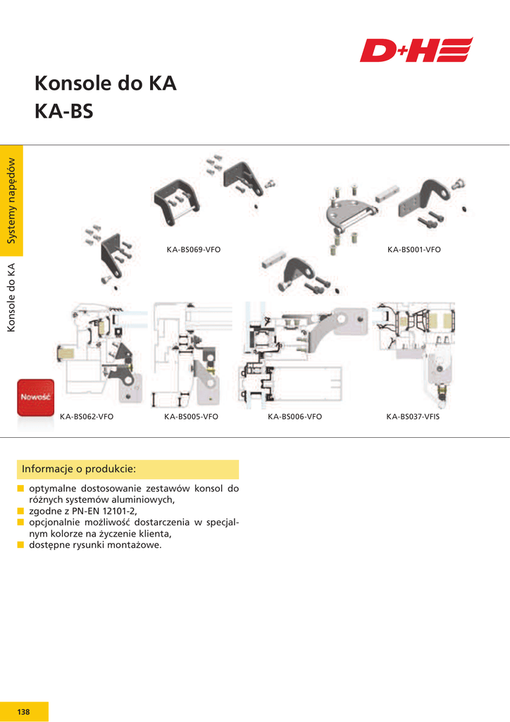 Systemy napędów Konsole do KA KA-BS KA-BS001-VFO Konsole do KA KA-BS069-VFO KA-BS062-VFO KA-BS005-VFO Informacje o produkcie: optymalne dostosowanie zestawów konsol do różnych systemów aluminiowych, zgodne z PN-EN 12101-2, opcjonalnie możliwość dostarczenia w specjalnym kolorze na życzenie klienta, dostępne rysunki montażowe. 138 KA-BS006-VFO KA-BS037-VFIS KA-BS046-VFI / KA-BS083-VFIS / KA-BS050-VFO / KA-BS040-VSI / RA-V / LK-KA Informacje o produkcie: nie nadaje się do KA-TW, kolor: srebrny, możliwość pomalowania na wszystkie kolory, również spoza palety RAL, maks. wysuw = wysokość skrzydła × 0,7. Konsole do KA Systemy napędów KA-BS046-VFI – montowane na ramie, otwierane do wewnątrz KA-BS083-VFIS – montowane na ramie (do skrzydeł rozwiernych), okna otwierane do wewnątrz Informacje o produkcie: nie nadaje się do KA-TW, kolor: srebrny, możliwość pomalowania na wszystkie kolory, również spoza palety RAL. 139 Systemy napędów KA-BS050-VFO – montowane na ramie, okna otwierane na zewnątrz Informacje o produkcie: nie nadaje się do KA-TW, kolor: srebrny, możliwość pomalowania na wszystkie kolory, również spoza palety RAL. Konsole do KA KA-BS040-VSI – montowane na skrzydle, okna otwierane do wewnątrz Informacje o produkcie: nie nadaje się do KA-TW, kolor: srebrny, możliwość pomalowania na wszystkie kolory, również spoza palety RAL. RA-V – montowane na ramie (konsola skrzydłowa), okna połaciowe Informacje o produkcie: do montażu na ramie w dolnej, części okien dachowych Roto® oraz VELUX®, kolor: srebrny, możliwość pomalowania na wszystkie kolory, również spoza palety RAL. 140 Konsole do KA Systemy napędów LK-KA – zestaw konsol do świetlików Informacje o produkcie: dostępne w dwóch wersjach, kolor: srebrny, możliwość pomalowania na wszystkie kolory, również spoza palety RAL. Typ Nr art. Uwagi KA-BS046-VFI 26.ADC.KS – KA-BS083-VFIS 26.AFJ.KS – KA-BS050-VFO 26.ADG.KS – KA-BS040-VSI 26.ACW.KS – RA-V 21.050.30 – LKK-KA 21.050.60 Dla świetlików dachowych typu Kleenlux® LKJ-KA 21.051.70 Dla świetlików dachowych typu Jet® LKL-KA 21.052.50 Dla świetlików dachowych typu Lamilux® 141 Konsole do KA Systemy napędów Okna dachowe otwierane na zewnątrz, montaż przeciwległy Seria profili / zastosowanie Zestaw konsol Nr art. Aluprof® – MB-SR50 KA-BS020-VFO 26.ACP.KS Aluprof® – MB-RW KA-BS096-VFO 26.AGA.KS Gutmann® – S70 Dach/roof KA-BS002-VFO 26.ACE.KS Heroal® – S 180 KA-BS011-VFO 26.ACH.KS Heroal® – series 180 ES KA-BS090-VFO 26.AFV.KS Hueck-Hartmann® – 1.0 KA-BS022-VFO 26.ACM.KS Hueck-Hartmann® – 85E KA-BS018-VFO 26.ACN.KS Jet Brakel® – Ventria TG KA-BS005-VFO 26.ACL.KS Raico® – Wing 105 D KA-BS002-VFO 26.ACE.KS Reynaers® – CR 120 KA-BS013-VFO 26.ACJ.KS Reynaers® – Flush Roof Vent KA-BS080-VFO 26.AFG.KS Sapa® – SFB 5050 / 5060 KA-BS015-VFO 26.ACK.KS Schüco® – AWS 57 RO KA-BS062-VFO 26.AEA.KS Schüco® – Royal S106 KA-BS010-VFO 26.ACG.KS Schüco® – Royal S88 KA-BS009-VFO 26.ACF.KS Technal® – MX KA-BS020-VFO 26.ACP.KS Wicona® – Wictec 50/60 KA-BS002-VFO 26.ACE.KS Seria profili / zastosowanie Zestaw konsol Nr art. Aluprof® – MB 59 Casement KA-BS076-VFO 26.AFD.KS Reynaers® – CS59, CS68, CS77, CS86Hi, eco system KA-BS036-VFO 26.ACV.KS Schüco® – AWS 65, 70, 75 KA-BS036-VFO 26.ACV.KS Skandinaviska® – SGS KA-BS077-VFO 26.AFB.KS Okna odchylne, otwierane na zewnątrz 142 Zestaw konsol Nr art. Gutmann® – S70 SK KA-BS006-VFO 26.AEF.KS Raico® – Wing50 SK / A KA-BS006-VFO 26.AEF.KS Schüco® – AWS 102 SK KA-BS001-VFO 26.ADB.KS Schüco® – AWS 102 SK KA-BS051-VFO 26.AEG.KS Seria profili / zastosowanie Zestaw konsol Nr art. Reynaers® – CS59, CS68, CS77, CS86Hi, eco system KA-BS085-VFIS 26.AFM.KS Schüco® – AWS 65, 70, 75 KA-BS085-VFIS 26.AFM.KS Okna rozwierane, otwierane do wewnątrz Uniwersalne zestawy konsol Seria profili / zastosowanie Zestaw konsol Nr art. Uwagi Otwierane do wewnątrz KA-BS040-VSI 26.ACX.KS Montaż napędu na skrzydle Otwierane do wewnątrz KA-BS046-VFI 26.ADD.KS Montaż napędu na ramie Otwierane na zewnątrz KA-BS050-VFO 26.ADP.KS Montaż napędu na ramie Dla skrzydeł rozwiernych, otwieranych do wewnątrz KA-BS088-VSIS 26.AFR.KS Montaż napędu na skrzydle Dla skrzydeł rozwiernych, otwieranych do wewnątrz KA-BS083-VFIS 26.AFK.KS Montaż napędu na ramie Konsole do KA Seria profili / zastosowanie Systemy napędów Okna odchylne z osią przesuwną, okna wysuwane równolegle, otwierane na zewnątrz 143