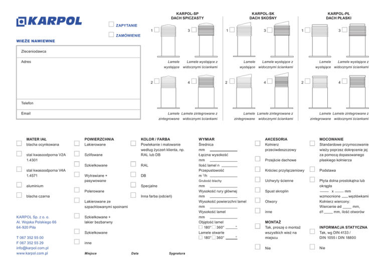 KARPOL-SP Dach spiczasty KARPOL KARPOL-SK Dach skośny KARPOL-pł Dach płaski zapytanie 1 3 1 3 1 3 zamówienie wieże nawiewne Zleceniodawca Adres Lamele Lamele wystające z wystające widocznymi ściankami 2 4 Lamele Lamele wystające z Lamele wystające widocznymi ściankami 2 4 Lamele wystające z wystające widocznymi ściankami 2 4 Telefon Email Lamele Lamele zintegrowane z zintegrowane widocznymi ściankami Mater iał blacha ocynkowana POWIERZCHNIA Lakierowane stal kwasoodporna V2A 1.4301 Szlifowane KOLOR / FARBA Powlekanie i malowanie według życzeń klienta, np. RAL lub DB Szkiełkowane RAL Wytrawiane + pasywowane DB stal kwasoodporna V4A 1.4571 aluminium Specjalne Polerowane blacha czarna Inna farba (odcień) Lakierowane ze szpachlowanymi spoinami KARPOL Sp. z o. o. Al. Wojska Polskiego 66 64-920 Piła Szkiełkowane + lakier bezbarwny Szkiełkowane T 067 352 55 00 F 067 352 55 29 [email protected] www.karpol.com.pl Lamele Lamele zintegrowane z zintegrowane widocznymi ściankami WYMIAR Średnica mm Łączna wysokość mm Ilość lamel n Przepustowość m 3/h AKCESORIA Kołnierz przeciwdeszczowy Grubość blachy mm Wysokość rury głównej mm Wysokość powierzchni lamel mm Wysokość lamel mm Objętość lamel 180° 360° ° Lamele otwarte 180° 360° ° Lamele Lamele zintegrowane z zintegrowane widocznymi ściankami Przejście dachowe MOCOWANIE Standardowe przymocowanie wieży poprzez dokręcenie jej za pomocą dopasowanego płaskiego kołnierza Króciec przyłączeniowy Podstawa Uchwyty ścienne inne Płyta dolna prostokątna lub okrągła x mm wzmocnione węzłówkami Kołnierz wiercony: Wiercenie ød mm, d1 mm, ilość otworów MONTAŻ Tak, proszę o montaż wszystkich wież na miejscu INFORMACJA STATYCZNA Tak, wg DIN 4133 / DIN 1055 i DIN 18800 Nie Nie Spust skroplin Otwory inne Miejsce Data Sygnatura