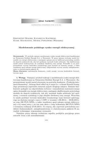 MATEMATYKA STOSOWANA TOM 13/54 2011 Krzysztof Opalski, Katarzyna Kacprzak, Kamil Maciejczyk, Michał Pawłowski (Warszawa) Modelowanie polskiego rynku energii elektrycznej Streszczenie. W artykule opisano modelowanie rynku energii elektrycznej handlowanej na Towarowej Giełdzie Energii S.A. w Warszawie. W pracy opisano wybrany model dynamiki cen energii elektrycznej, a następnie opisano proces kalibracji powstałego modelu do danych rynkowych tak, aby był spełniony warunek braku arbitrażu. Tak skalibrowany model został wykorzystany do symulacji chwilowej ceny energii. Pozwoliło to na przeprowadzenie wyceny kontraktu terminowego typu forward na dostawę energii, a także waniliowej opcji zakupu energii elektrycznej. Odpowiednie wyceny zostały zaimplementowane w statystycznym pakiecie R. Słowa kluczowe: matematyka finansowa, rynek energii, wycena konktaktów forward, wycena opcji. 1. Wstęp. Niniejszy artykuł traktuje o modelowaniu rynku energii elektrycznej handlowanej na Towarowej Giełdzie Energii S.A. w Warszawie. Zaprezentowany model został stworzony na potrzeby konkursu „Praktyka inżynierii finansowej”, którego finał odbył się w maju b.r. w firmie Ernst&Young. Jego prezentacja zapewniła autorom zajęcie drugiego miejsca. Zadanie konkursowe polegało na odpowiednim wyborze i uzasadnieniu matematycznego opisu dynamiki cen energii elektrycznej, następnie skalibrowaniu powstałego modelu do danych rynkowych, tak aby warunek braku arbitrażu był spełniony, i wreszcie symulację w jego obrębie chwilowej ceny energii. Wszystko to miało posłużyć wycenie kontraktu terminowego typu forward opiewającego na dostawę energii o mocy 5 MW w terminie 1.06.2011r. - 30.06.2011r. za cenę 190 PLN/MWh, a także waniliowej opcji zakupu energii elektrycznej o tej samej mocy i na ten sam okres z ceną wykonania 200 PLN/MWh i terminem realizacji 27.05.2011r. Co więcej, aby zapewnić powstałemu modelowi funkcjonalność, zaimplementowano w statystycznym pakiecie R narzędzie wykonujące wspomniane czynności. Niniejsza praca ukazuje techniczne aspekty podejścia przyjętego przez autorów wraz z ich uzasadnieniami. [105] 106 K. Opalski, K. Kacprzak, K. Maciejczyk, M. Pawłowski 2. Charakterystyka rynków energii. Wybór modelu rynku, czyli opis dynamiki cen instrumentu bazowego (cen energii elektrycznej), a co za tym idzie, metody kalibracji oraz wykorzystywane techniki numeryczne, zostały zdeterminowane przez wyjątkową specyfikę rynków energii elektrycznej na świecie, szczególnie obserwowaną na stosunkowo młodej Towarowej Giełdzie Energii S.A. w Warszawie. Cechami charakterystycznymi, odróżniającymi owe rynki od dobrze znanych nam rynków finansowych, są przede wszystkim: • Sezonowość (roczna, tygodniowa, dzienna) – cyklicznie powtarzające się trendy w wielkościach cen obserwowane na przestrzeni lat, tygodni, a także w trakcie trwania doby (brak niezależności przyrostów). Tę ostatnią, zgodnie z założeniami, pominięto w modelu. • Powrót cen do średniej – po uwzględnieniu trendów oraz sezonowości, ceny mają tendencję do powracania do stałego poziomu. • Nieoczekiwane, gwałtowne skoki cen spot – spowodowane np. usterką w elektrowni czy sieci transmisyjnej, bądź też nagłą zmianą temperatury otoczenia (przyrosty, w przeciwieństwie do klasyczniego modelu BlackaScholesa, nie są lognormalne). • Brak możliwości magazynowania energii, a w związku z tym niemożność wyznaczenia strategii replikującej. 3. Założenia teoretyczne modelu. Niech St oznacza cenę spot energii elektrycznej na modelowanym rynku, czyli na Towarowej Giełdzie Energii. Przyjęto, że ceny St opisuje równanie ln(St ) = g(t) + Yt , (1) co można też zapisać St = G(t)eYt , gdzie G(t) = eg(t) , podczas gdy g(t) jest deterministyczną funkcją sezonowości, Yt jest procesem stochastycznym zadanym równaniem (2) dYt = −αYt dt + σ(t)dZt + ln JdQt . Jest to proces powracający do średniej wynoszącej 0 o szybkości powrotu równej α. Parametr σ jest zależną od czasu zmiennością, J wielkością skoku, gdzie ln J ma rozkład normalny ln J ∼ N (µJ , σJ2 ), Z jest procesem Wienera, Q jest procesem Poissona takim, że 1 z prawdopodobieństwem ldt, dQt = 0 z prawdopodobieństwem 1 − ldt, przy czym l jest intensywnością częstotliwości. Co więcej, J, Q i Z są niezależne. Modelowanie polskiego rynku energii elektrycznej 107 Wybrany model uwzględnia wyżej wymienione aspekty, w szczególności wyodrębniono w nim komponentę sezonowości, a powrót cen do średniej zapewnia użycie procesu Orsteina-Uhlenbecka. Dodano też składnik odpowiadający skokom cen. Korzystając z lematu Itô, można napisać dSt = α(ρ(t) − ln St )dt + σ(t)St dZt + St (J − 1)dQt , 1 2 + σ (t) + g(t). gdzie ρ(t) = α1 dg(t) dt 2 Ponieważ strategie zabezpieczające, które są zazwyczaj związane z przechowywaniem sporych ilości instrumentu bazowego są w przypadku rynku energii elektrycznej niemożliwe, dużą popularnością cieszą się tu kontrakty terminowe typu forward. Stąd też, niezwykle użyteczna okazuje się możliwość wydobycia krzywej forwardowej z bazującego na cenie spot modelu. W obrębie tego modelu możliwe jest uzyskanie odpowiedniego wzoru w sposób analityczny. Jak wiadomo, zakup kontraktu forward w chwili t zapewnia wypłatę w chwili T wielkości ST − K, przy czym K jest z góry ustaloną ceną wykonania kontraktu. Ceną forward nazywamy taką wartość K, iż cena kontraktu w chwili jego zakupu t wynosi 0. Wynika stąd, że cena forward w chwili t kontraktu forward zapadającego w chwili T wynosi (3) (4) F (t, T ) = E Q t [ST |Ft ], gdzie Q jest odpowiednio dobraną miarą martyngałową. Szczegóły wyceny wspomnianego kontraktu forward na dostawę energii opisano w rozdziale „Kalibracja modelu i wyniki”, warto tu jedynie nadmienić, że w przypadku tego typu kontraktu, gdy jego realizacja odbywa się w okresie jednego mi