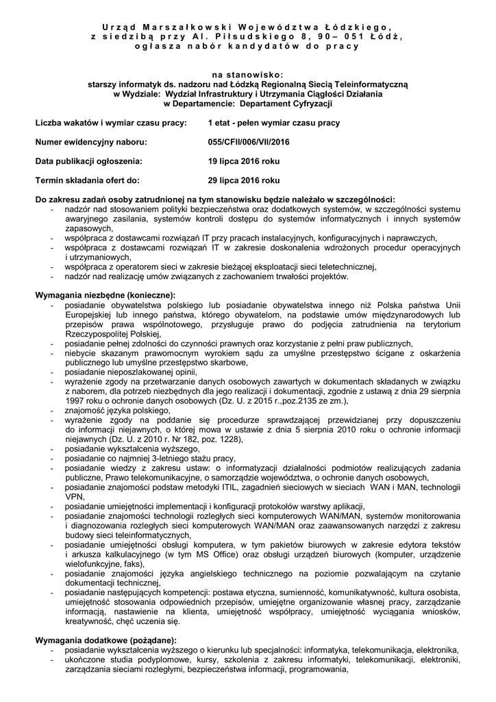 Urząd Marszałkowski Województwa Łódzkiego, z siedzibą przy Al. Piłsudskiego 8, 90– 051 Łódź, ogłasza nabór kandydatów do pracy n a stan o w i sko : starszy informatyk ds. nadzoru nad Łódzką Regionalną Siecią Teleinformatyczną w Wydziale: Wydział Infrastruktury i Utrzymania Ciągłości Działania w Departamencie: Departament Cyfryzacji Liczba wakatów i wymiar czasu pracy: 1 etat - pełen wymiar czasu pracy Numer ewidencyjny naboru: 055/CFII/006/VII/2016 Data publikacji ogłoszenia: 19 lipca 2016 roku Termin składania ofert do: 29 lipca 2016 roku Do zakresu zadań osoby zatrudnionej na tym stanowisku będzie należało w szczególności: - nadzór nad stosowaniem polityki bezpieczeństwa oraz dodatkowych systemów, w szczególności systemu awaryjnego zasilania, systemów kontroli dostępu do systemów informatycznych i innych systemów zapasowych, - współpraca z dostawcami rozwiązań IT przy pracach instalacyjnych, konfiguracyjnych i naprawczych, - współpraca z dostawcami rozwiązań IT w zakresie doskonalenia wdrożonych procedur operacyjnych i utrzymaniowych, - współpraca z operatorem sieci w zakresie bieżącej eksploatacji sieci teletechnicznej, - nadzór nad realizację umów związanych z zachowaniem trwałości projektów. Wymagania niezbędne (konieczne): - posiadanie obywatelstwa polskiego lub posiadanie obywatelstwa innego niż Polska państwa Unii Europejskiej lub innego państwa, którego obywatelom, na podstawie umów międzynarodowych lub przepisów prawa wspólnotowego, przysługuje prawo do podjęcia zatrudnienia na terytorium Rzeczypospolitej Polskiej, - posiadanie pełnej zdolności do czynności prawnych oraz korzystanie z pełni praw publicznych, - niebycie skazanym prawomocnym wyrokiem sądu za umyślne przestępstwo ścigane z oskarżenia publicznego lub umyślne przestępstwo skarbowe, - posiadanie nieposzlakowanej opinii, - wyrażenie zgody na przetwarzanie danych osobowych zawartych w dokumentach składanych w związku z naborem, dla potrzeb niezbędnych dla jego realizacji i dokumentacji, zgodnie z ustawą z dnia 29 sierpnia 1997 roku o ochronie danych osobowych (Dz. U. z 2015 r.,poz.2135 ze zm.), - znajomość języka polskiego, - wyrażenie zgody na poddanie się procedurze sprawdzającej przewidzianej przy dopuszczeniu do informacji niejawnych, o której mowa w ustawie z dnia 5 sierpnia 2010 roku o ochronie informacji niejawnych (Dz. U. z 2010 r. Nr 182, poz. 1228), - posiadanie wykształcenia wyższego, - posiadanie co najmniej 3-letniego stażu pracy, - posiadanie wiedzy z zakresu ustaw: o informatyzacji działalności podmiotów realizujących zadania publiczne, Prawo telekomunikacyjne, o samorządzie województwa, o ochronie danych osobowych, - posiadanie znajomości podstaw metodyki ITIL, zagadnień sieciowych w sieciach WAN i MAN, technologii VPN, - posiadanie umiejętności implementacji i konfiguracji protokołów warstwy aplikacji, - posiadanie znajomości technologii rozległych sieci komputerowych WAN/MAN, systemów monitorowania i diagnozowania rozległych sieci komputerowych WAN/MAN oraz zaawansowanych narzędzi z zakresu budowy sieci teleinformatycznych, - posiadanie umiejętności obsługi komputera, w tym pakietów biurowych w zakresie edytora tekstów i arkusza kalkulacyjnego (w tym MS Office) oraz obsługi urządzeń biurowych (komputer, urządzenie wielofunkcyjne, faks), - posiadanie znajomości języka angielskiego technicznego na poziomie pozwalającym na czytanie dokumentacji technicznej, - posiadanie następujących kompetencji: postawa etyczna, sumienność, komunikatywność, kultura osobista, umiejętność stosowania odpowiednich przepisów, umiejętne organizowanie własnej pracy, zarządzanie informacją, nastawienie na klienta, umiejętność współpracy, umiejętność wyciągania wniosków, kreatywność, chęć uczenia się. Wymagania dodatkowe (pożądane): - posiadanie wykształcenia wyższego o kierunku lub specjalności: informatyka, telekomunikacja, elektronika, - ukończone studia podyplomowe, kursy, szkolenia z zakresu informatyki, telekomunikacji, elektroniki, zarządzania sieciami rozległymi, bezpieczeństwa informacji, programowania, - - posiadanie doświadczenia w obszarze związanym z informatyką, administrowaniem systemami, posiadanie doświadczenia w pracy na stanowiskach związanych z zarządzaniem sieciami teleinformatycznymi, ich utrzymaniem i monitorowaniem, z obsługą i administrowaniem systemami informatycznymi, posiadanie umiejętności zarządzania i konfiguracji usług sieciowych w sieciach rozległych, obsługi i konfiguracji urządzeń specjalistycznych (switche, routery, macierze itp.), serwisowania sprzętu komputerowego w zakresie hardware i software, serwisowania sieci teleinformatycznej oraz urządzeń sieciowych oraz znajomości zaawansowanych narzędzi z zakresu administrowania siecią teleinformatyczną. Oferta kandydata musi zawierać: - CV wraz z listem motywacyjnym lub innym pisemnym zgłoszeniem udziału w naborze wraz z motywacją, - kwestionariusz osobowy dla osoby ubiegającej się o zatrudnienie, - kserokopie dokumentów potwierdzających posiadane wykształcenie, - kserokopie świadectw pracy lub innych dokumentów potwierdzających posiadany przez kandydata staż pracy, - kserokopie dokumentów potwierdzających niepełnosprawność, jeśli kandydat zamierza skorzystać z uprawnienia, o którym mowa w art. 13a ust. 2 ustawy z dnia 21 listopada 2008 r. o pracownikach samorządowych (Dz. U. z 2014 r., poz. 1202 ze zm. ) oraz w §30 pkt 6 „Procedury naboru kandydatów do pracy w Urzędzie Marszałkowskim Województwa Łódzkiego oraz zasad pracy Komisji ds. Naboru” (pierwszeństwo w zatrudnianiu osób niepełnosprawnych), - oświadczenie o posiadaniu obywatelstwa polskiego lub kserokopia dowodu osobistego, - oświadczenie o posiadaniu obywatelstwa innego niż Polska państwa Unii Europejskiej lub innego państwa, którego obywatelom, na podstawie um