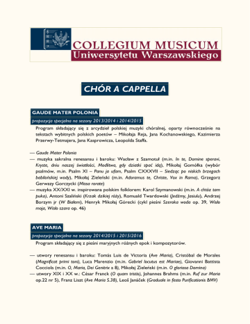 CHÓR A CAPPELLA GAUDE MATER POLONIA propozycja specjalna na sezony 2013/2014 i 2014/2015 Program składający się z arcydzieł polskiej muzyki chóralnej, oparty równocześnie na tekstach wybitnych polskich poetów – Mikołaja Reja, Jana Kochanowskiego, Kazimierza Przerwy-Tetmajera, Jana Kasprowicza, Leopolda Staffa. — Gaude Mater Polonia — muzyka sakralna renesansu i baroku: Wacław z Szamotuł (m.in. In te, Domine speravi, Kryste, dniu naszej światłości, Modlitwa, gdy dziatki spać idą), Mikołaj Gomółka (wybór psalmów, m.in. Psalm XI – Panu ja ufam, Psalm CXXXVII – Siedząc po niskich brzegach babilońskiej wody), Mikołaj Zieleński (m.in. Adoramus te, Christe, Vox in Rama), Grzegorz Gerwazy Gorczycki (Missa rorate) — muzyka XX/XXI w. inspirowana polskim folklorem: Karol Szymanowski (m.in. A chtóz tam puka), Antoni Szaliński (Krzak dzikiej róży), Romuald Twardowski (Jedźmy, Jasiulu), Andrzej Borzym jr (W Białem), Henryk Mikołaj Górecki (cykl pieśni Szeroka woda op. 39, Wisło moja, Wisło szara op. 46) AVE MARIA propozycja specjalna na sezony 2014/2015 i 2015/2016 Program składający się z pieśni maryjnych różnych epok i kompozytorów. — utwory renesansu i baroku: Tomás Luis de Victoria (Ave Maria), Cristóbal de Morales (Magnificat primi toni), Luca Marenzio (m.in. Gabriel locutus est Mariae), Giovanni Battista Cocciola (m.in. O, Maria, Dei Genitrix a 8), Mikołaj Zieleński (m.in. O gloriosa Domina) — utwory XIX i XX w.: César Franck (O quam tristis), Johannes Brahms (m.in. Ruf zur Maria op.22 nr 5), Franz Liszt (Ave Maria S.38), Leoš Janáček (Graduale in festo Purificationis BMV) POLSKA I EUROPEJSKA MUZYKA SAKRALNA XVI/XX w. — Wacław z Szamotuł (m.in. In te, Domine speravi, Kryste, dniu naszej światłości, Modlitwa, gdy dziatki spać idą), Mikołaj Zieleński (m.in. Adoramus te, Christe, Vox in Rama) — Henry Purcell (Lord, how long wilt Thou be angry), Thomas Tomkins (m.in. I heard a voice, When David heard), Cristobal de Morales (Magnificat primi toni), Tomas Luis de Victoria (Ave Maria), Quirino Gasparini (Adoramus te, Christe), Giovanni Battista Cocciola (utwory polichóralne szkoły weneckiej, m.in. Vulnerasti cor meum, Jubilate Deo) — Franz Liszt (m.in. Ave Maria S.38), Johannes Brahms (m.in. Ruf zur Maria op.22 nr 5) , Hieronim Feicht (m.in. Inclinet Dominus Deus noster) CHÓR ROZRYWKOWY PIOSENKI STARSZYCH PANÓW propozycja specjalna na rok 2015 – stulecie urodzin Jeremiego Przybory Najbardziej znane i te mniej popularne utwory Jeremiego Przybory i Jerzego Wasowskiego w chóralnych aranżacjach Andrzeja Borzyma — wybór spośród 29 tytułów, min. Herbatka, Kapturek '62, Na całej połaci śnieg, Piosenka jest dobra na wszystko, Rodzina, Stacyjka Zdrój, Wesołe jest życie staruszka, W kawiarence „Sułtan” czy Zmierzch. Andrzej Borzym występuje także w roli konferansjera koncertu. MIŁOŚĆ NIEDUŻA propozycja specjalna na rok 2015 – stulecie urodzin Jeremiego Przybory Piosenki do tekstów Jeremiego Przybory i Agnieszki Osieckiej w chóralnych aranżacjach Andrzeja Borzyma. Andrzej Borzym występuje także w roli konferansjera koncertu. — Jeremi Przybora: m.in. Herbatka, Wesołe jest życie staruszka, Stacyjka Zdrój, Biżuteria, W kawiarence „Sułtan”, To będzie miłość nieduża (wszystkie utwory z muzyką Jerzego Wasowskiego) — Agnieszka Osiecka: m.in. Dookoła noc się stała — muz. Adam Sławiński, Na brzozowej korze — muz. Maciej Małecki, Nim wstanie dzień — muz. Krzysztof Komeda-Trzciński, Kiedy mnie już nie będzie — muz. Seweryn Krajewski, Wielka woda — muz. Katarzyna Gärtner ŚPIEWNIK PANA WASOWSKIEGO Znakomity spektakl muzyczny warszawskiego Teatru Syrena z utworami Jerzego Wasowskiego i Jeremiego Przybory. Premiera spektaklu odbyła się 7 kwietnia 2013 r. Obsada: Justyna Steczkowska Wojciech Malajkat / Artur Andrus Chór Kameralny Collegium Musicum UW autor i reżyser: Krzysztof Jaślar kierownictwo muzyczne: Roman Hudaszek, Marcin Partyka aranżacje: Roman Hudaszek, Marcin Partyka, Andrzej Borzym choreografia: Tomasz Tworkowski scenografia: Agnieszka Tepli kostiumy: Elwira Rutkowska producent wykonawczy: Kamil Sadowski O możliwość wyjazdowego przedstawienia należy pytać Impresariat Teatru Syrena — http://teatrsyrena.pl/impresariat.html EAS Dzięki współpracy z Europejską Agencją Sztuki bierzemy udział w koncertach z udziałem Magdy Umer, Andrzeja Poniedzielskiego, Zbigniewa Zamachowskiego, Piotra Machalicy, Katarzyny Groniec i wielu innych artystów. Polecamy zapoznanie się z ofertą Agencji — www.eas.com.pl MUZYKA NIE NA MIEJSCU propozycja specjalna na sezony 2013/2014 i 2014/2015 Muzyka nie na miejscu 1947–1955 to konfrontacja jedynie słusznych pieśni masowych z okresu socrealizmu, z – rodzącą się w podziemiu – polską muzyką synkopowaną. Bojowe pieśni o socjalizmie, partii i planie, w typowym marszowym rytmie, rzewne „żołnierskie” piosenki i „ludowe” melodie o elektryfikacji wyszły spod piór wielu – uwikłanych w ówczesną rzeczywistość – wybitnych polskich kompozytorów. Ożywcze jazzowe dźwięki w znanych przebojach z tamtych lat przemyca trio jazzowe Krzysztofa Herdzina. Prezentacja tego programu o rozrywkowym, ale i popularnonaukowym charakterze, wymaga krótkiego wprowadzenia w formie zapowiedzi lub tekstu drukowanego. Utwory chóralne: To idzie młodość (słowa Ludwik Starski / muzyka Tadeusz Sygietyński) Pieśń traktorzystów (Zygmunt Kaczorowski / Kazimierz Serocki) Żelazny marsz (Stanisław Ryszard Dobrowolski / Witold Lutosławski) Pieśń o planie (Kazimierz Nowacki / Henryk Czyż) W Wiśniowej Woli (Maria Lasek / Władysław Szpilman) Pieśń zjednoczonych partii (Leopold Lewin / Andrzej Panufnik) Piosenka o karabinie (Stanisław Zielicz / Witold Rudziński) Naprzód idziemy (Jan Brzechwa / Witold Lutosławski) Wyszłabym ja (Leopold Lewin / Witold Lutosławski) Miliony rąk (Krzysztof Gruszczyńsk
