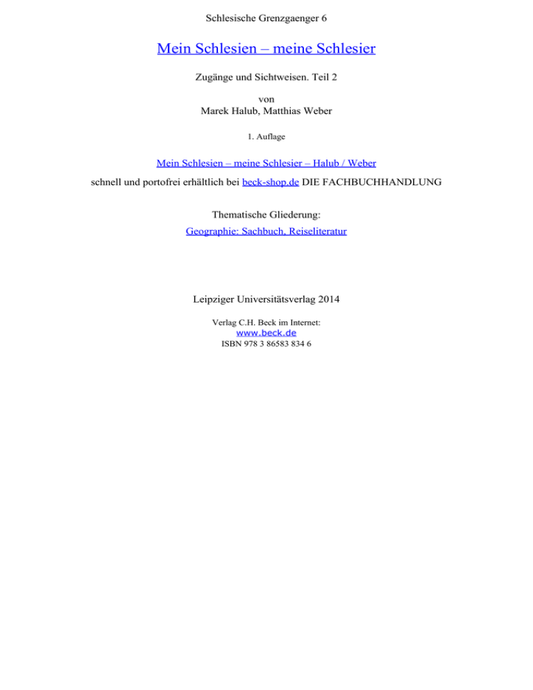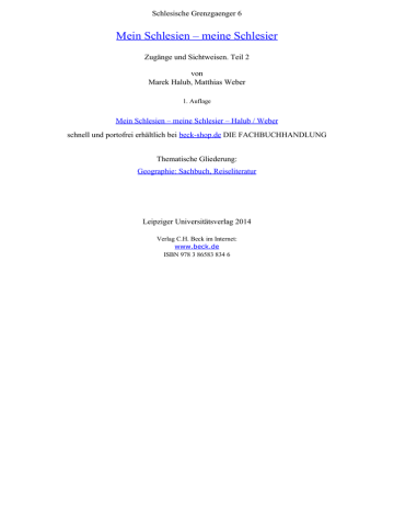 Schlesische Grenzgaenger 6 Mein Schlesien – meine Schlesier Zugänge und Sichtweisen. Teil 2 von Marek Halub, Matthias Weber 1. Auflage Mein Schlesien – meine Schlesier – Halub / Weber schnell und portofrei erhältlich bei beck-shop.de DIE FACHBUCHHANDLUNG Thematische Gliederung: Geographie: Sachbuch, Reiseliteratur Leipziger Universitätsverlag 2014 Verlag C.H. Beck im Internet: www.beck.de ISBN 978 3 86583 834 6 Spis treści Marek Hałub, Matthias Weber Przedmowa . . . . . . . . . . . . . . . . . . . . . . . . . . . . . . . . . . . . . . . . . . . . 7 Norbert Conrads Moje historyczne drogi ze Śląska i na Śląsk . . . . . . . . . . . . . . . . . . . 11 Marek Czapliński Trudna przemiana krakusa we wrocławianina . . . . . . . . . . . . . . . . . 31 Norbert Heisig Z Breslau do Wrocławia. . . . . . . . . . . . . . . . . . . . . . . . . . . . . . . . . . 45 Arno Herzig Śląsk trwa wiecznie … . . . . . . . . . . . . . . . . . . . . . . . . . . . . . . . . . . . 59 Maciej Łagiewski Nie ma jak w domu! . . . . . . . . . . . . . . . . . . . . . . . . . . . . . . . . . . . . 69 Kurt Masur Śląsk – cząstka małej ojczyzny!? . . . . . . . . . . . . . . . . . . . . . . . . . . . . 79 Kardynał Joachim Meisner Wspomnienia o ukochanej krainie . . . . . . . . . . . . . . . . . . . . . . . . . 83 Ewa Michnik Odkrywanie mojego Śląska . . . . . . . . . . . . . . . . . . . . . . . . . . . . . . . 91 Jan Miodek Śląsk w moim życiu . . . . . . . . . . . . . . . . . . . . . . . . . . . . . . . . . . . . 105 Arcybiskup Alfons Nossol Schlesien, Śląsk, Slezsko! . . . . . . . . . . . . . . . . . . . . . . . . . . . . . . . . 118 Spis treści 5 Fritz Stern Jestem bardziej związany z Wrocławiem niż z dawnym Breslau . . . . . . . . . . . . . . . . . . . . . . . . . . . . . . . . . . 124 Monika Taubitz Śląsk jest zawsze przy mnie . . . . . . . . . . . . . . . . . . . . . . . . . . . . . . 135 Wolfgang Thierse Mój krajobraz pamięci . . . . . . . . . . . . . . . . . . . . . . . . . . . . . . . . . . 151 Olga Tokarczuk Syndrom Królewny Śnieżki i inne sny dolnośląskie. . . . . . . . . . . . . . . . . . . . . . . . . . . . . . . . . . . . . . . 157 Henryk Waniek Czytanie Śląska . . . . . . . . . . . . . . . . . . . . . . . . . . . . . . . . . . . . . . . 167 Bogdan Zdrojewski Jestem Polakiem mieszkającym na Śląsku . . . . . . . . . . . . . . . . . . . 175 Autorki, Autorzy i Redaktorzy tomu . . . . . . . . . . . . . . . . . . . . . . 188 6 Spis treści