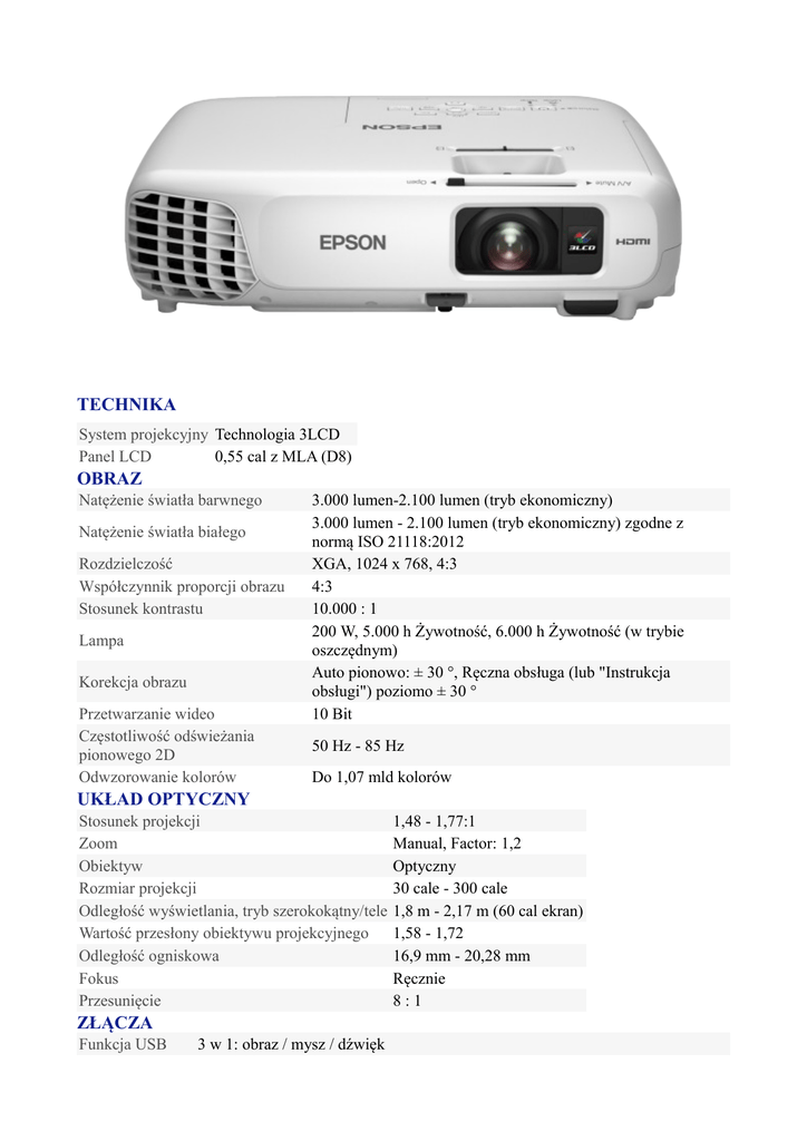 TECHNIKA System projekcyjny Technologia 3LCD Panel LCD 0,55 cal z MLA (D8) OBRAZ Natężenie światła barwnego Natężenie światła białego Rozdzielczość Współczynnik proporcji obrazu Stosunek kontrastu Lampa Korekcja obrazu Przetwarzanie wideo Częstotliwość odświeżania pionowego 2D Odwzorowanie kolorów 3.000 lumen-2.100 lumen (tryb ekonomiczny) 3.000 lumen - 2.100 lumen (tryb ekonomiczny) zgodne z normą ISO 21118:2012 XGA, 1024 x 768, 4:3 4:3 10.000 : 1 200 W, 5.000 h Żywotność, 6.000 h Żywotność (w trybie oszczędnym) Auto pionowo: ± 30 °, Ręczna obsługa (lub "Instrukcja obsługi") poziomo ± 30 ° 10 Bit 50 Hz - 85 Hz Do 1,07 mld kolorów UKŁAD OPTYCZNY Stosunek projekcji Zoom Obiektyw Rozmiar projekcji Odległość wyświetlania, tryb szerokokątny/tele Wartość przesłony obiektywu projekcyjnego Odległość ogniskowa Fokus Przesunięcie ZŁĄCZA Funkcja USB 3 w 1: obraz / mysz / dźwięk 1,48 - 1,77:1 Manual, Factor: 1,2 Optyczny 30 cale - 300 cale 1,8 m - 2,17 m (60 cal ekran) 1,58 - 1,72 16,9 mm - 20,28 mm Ręcznie 8:1 wyświetlacza Przyłącza Wejście audio typu cinch, Wejście VGA, Wejście RGB, Wejście S-Video, Wejście sygnału komponentowego, Wejście sygnału kompozytowego, Wejście HDMI, Bezprzewodowa sieć LAN IEEE 802.11b/g/n (opcja), Złącze USB 2.0 typu B, Złącze USB 2.0 typu A Połączenie ze smartfonem Ad-hoc/Infrastruktura ZAAWANSOWANE FUNKCJE Zamek Kensington, Otwór na linkę zabezpieczającą, Bezpieczeństwo bezprzewodowej sieci LAN 3D Nie Suwak wyłączania obrazu/dźwięku, Wbudowany głośnik, Włączanie/wyłączanie bezpośrednie, Kompatybilny ze skanerem dokumentów, Pozioma i pionowa Funkcje korekcja geometrii obrazu, Projekcja sieciowa, Możliwość połączenia z bezprzewodową siecią LAN Tryby kolorów Tablica, Dynamiczny, Prezentacja, Sport, sRGB, Teatr, Biała tablica Bezpieczeństwo INFORMACJE OGÓLNE Zużycie energii Napięcie zasilania Wymiary produktu Waga produktu Poziom hałasu Temperatura Wilgotność powietrza Opcje Głośniki Zawartość zestawu 270 W, 201 W (tryb ekonomiczny), 0,28 W (w trybie czuwania) AC 100 V - 240 V,50 Hz - 60 Hz 297 x 234 x 77 mm (Szerokość x Głębokość x Wysokość) 2,4 kg Tryb normalny: 37 dB (A) - Tryb ekonomiczny: 29 dB (A) Praca 5°C - 35°C, Składowanie -10°C - 60°C Praca 20% - 80%, Składowanie 10% - 90% Aparat do dokumentów, Klucz USB szybkiego połączenia bezprzewodowego, Moduł bezprzewodowej sieci LAN 2W Torba transportowa, Kabel komputerowy, Urządzenie podstawowe, Kabel zasilający, Pilot z bateriami, Kabel USB, Zestaw instrukcji obsługi, Dokumenty gwarancyjne