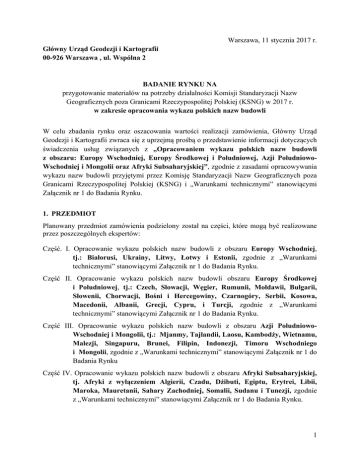 Warszawa, 11 stycznia 2017 r. Główny Urząd Geodezji i Kartografii 00-926 Warszawa , ul. Wspólna 2 BADANIE RYNKU NA przygotowanie materiałów na potrzeby działalności Komisji Standaryzacji Nazw Geograficznych poza Granicami Rzeczypospolitej Polskiej (KSNG) w 2017 r. w zakresie opracowania wykazu polskich nazw budowli W celu zbadania rynku oraz oszacowania wartości realizacji zamówienia, Główny Urząd Geodezji i Kartografii zwraca się z uprzejmą prośbą o przedstawienie informacji dotyczących świadczenia usług związanych z „Opracowaniem wykazu polskich nazw budowli z obszaru: Europy Wschodniej, Europy Środkowej i Południowej, Azji PołudniowoWschodniej i Mongolii oraz Afryki Subsaharyjskiej”, zgodnie z zasadami opracowywania wykazu nazw budowli przyjętymi przez Komisję Standaryzacji Nazw Geograficznych poza Granicami Rzeczypospolitej Polskiej (KSNG) i „Warunkami technicznymi” stanowiącymi Załącznik nr 1 do Badania Rynku. 1. PRZEDMIOT Planowany przedmiot zamówienia podzielony został na części, które mogą być realizowane przez poszczególnych ekspertów: Część. I. Opracowanie wykazu polskich nazw budowli z obszaru Europy Wschodniej, tj.: Białorusi, Ukrainy, Litwy, Łotwy i Estonii, zgodnie z „Warunkami technicznymi” stanowiącymi Załącznik nr 1 do Badania Rynku. Część II. Opracowanie wykazu polskich nazw budowli obszaru Europy Środkowej i Południowej, tj.: Czech, Słowacji, Węgier, Rumunii, Mołdawii, Bułgarii, Słowenii, Chorwacji, Bośni i Hercegowiny, Czarnogóry, Serbii, Kosowa, Macedonii, Albanii, Grecji, Cypru, i Turcji, zgodnie z „Warunkami technicznymi” stanowiącymi Załącznik nr 1 do Badania Rynku. Część III. Opracowanie wykazu polskich nazw budowli z obszaru Azji PołudniowoWschodniej i Mongolii, tj.: Mjanmy, Tajlandii, Laosu, Kambodży, Wietnamu, Malezji, Singapuru, Brunei, Filipin, Indonezji, Timoru Wschodniego i Mongolii, zgodnie z „Warunkami technicznymi” stanowiącymi Załącznik nr 1 do Badania Rynku Część IV. Opracowanie wykazu polskich nazw budowli z obszaru Afryki Subsaharyjskiej, tj. Afryki z wyłączeniem Algierii, Czadu, Dżibuti, Egiptu, Erytrei, Libii, Maroka, Mauretanii, Sahary Zachodniej, Somalii, Sudanu i Tunezji, zgodnie z „Warunkami technicznymi” stanowiącymi Załącznik nr 1 do Badania Rynku. 1 Termin realizacji planowanego przedmiotu zamówienia: do dnia 15 czerwca 2017 r. 2. TERMIN Termin nadsyłania propozycji cenowych do dnia: 18 stycznia 2017 r. 3. SZCZEGÓŁOWY OPIS USŁUGI Warunki techniczne w załączniku nr 1 do Badania Rynku. 4. CENA 1. W złożonej informacji prosimy o podanie łącznej ceny realizacji zadania (ceny netto i brutto) oddzielnie dla poszczególnych Części, zgodnie z Załącznikiem nr 2 do Badania Rynku. 2. W przypadku składania propozycji cenowej na więcej niż jedną Część przedmiotu zamówienia należy wypełnić formularz (Załącznik nr 2 do Badania Rynku) dla każdej Części osobno. 3. Wycena powinna obejmować wszystkie koszty realizacji przedmiotu zamówienia, a w przypadku praw autorskich również koszty w zakresie przeniesienia praw autorskich majątkowych do dzieła na Zamawiającego, w szczególności w następujących polach eksploatacji w zakresie: 1) utrwalania i zwielokrotniania utworu – wytwarzanie określoną techniką egzemplarzy utworu, w tym techniką drukarską, reprograficzną, zapisu magnetycznego oraz techniką cyfrową, 2) obrotu oryginałem lub egzemplarzami, na których utwór utrwalono – wprowadzanie do obrotu, użyczenie lub najem oryginału albo egzemplarzy, 3) rozpowszechniania utworu w sposób inny niż określony w pkt 2 – publiczne wykonanie, wystawienie, wyświetlanie, odtwarzanie oraz nadawanie i reemitowanie, a także publiczne udostępnianie utworu w taki sposób, aby każdy mógł mieć do niego dostęp w miejscu i czasie przez siebie wybranym, w tym za pośrednictwem sieci Internet. 4. Propozycje cenowe wykonania usługi prosimy składać na formularzu stanowiącym Załącznik 2 do Badania Rynku w wersji elektronicznej na adres: [email protected] lub faksem na numer: 22 628 34 67 5. INFORMACJE DODATKOWE Czy Wykonawca posiada: 1) wykształcenie z zakresu geografii lub kartografii lub językoznawstwa, 2) znajomość zagadnień z zakresu nazewnictwa geograficznego poza granicami Polski – potwierdzoną wykazem co najmniej 2 prac. 6. KONTAKT Wszelkich informacji udziela Pani Justyna Kacprzak, Departament Geodezji, Kartografii i Systemów Informacji Geograficznej GUGiK 2 ul. Wspólna 2, 00-926 Warszawa tel. +48 (22) 563 13 49, fax. +48 (22) 628 32 06, e-mail: [email protected] 7. UWAGA 1) W celu zapewnienia porównywalności wszystkich propozycji cenowych, Zamawiający zastrzega sobie prawo do skontaktowania się z właściwymi Wykonawcami w celu uzupełnienia lub doprecyzowania ww. propozycji. 2) Niniejsza informacja nie stanowi oferty w myśl art. 66 Kodeksu Cywilnego, jak również nie jest ogłoszeniem w rozumieniu ustawy Prawo zamówień publicznych. Informacja ta ma na celu wyłącznie rozpoznanie rynku i uzyskanie wiedzy nt. kosztów i sposobu wykonania przedmiotu zamówienia. 8. ZAŁĄCZNIKI Załącznik nr 1 - Warunki techniczne Załącznik nr 2 - Formularz szacowania kosztów ZATWIERDZAM Adam Zozula Dyrektor Departamentu Geodezji, Kartografii i Systemów Informacji Geograficznej Podpisano elektronicznie 3