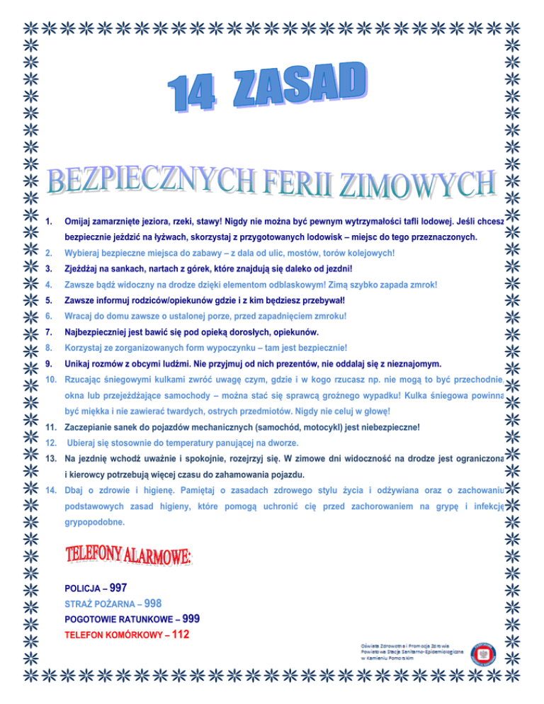 1. Omijaj zamarznięte jeziora, rzeki, stawy! Nigdy nie można być pewnym wytrzymałości tafli lodowej. Jeśli chcesz bezpiecznie jeździć na łyżwach, skorzystaj z przygotowanych lodowisk – miejsc do tego przeznaczonych. 2. Wybieraj bezpieczne miejsca do zabawy – z dala od ulic, mostów, torów kolejowych! 3. Zjeżdżaj na sankach, nartach z górek, które znajdują się daleko od jezdni! 4. Zawsze bądź widoczny na drodze dzięki elementom odblaskowym! Zimą szybko zapada zmrok! 5. Zawsze informuj rodziców/opiekunów gdzie i z kim będziesz przebywał! 6. Wracaj do domu zawsze o ustalonej porze, przed zapadnięciem zmroku! 7. Najbezpieczniej jest bawić się pod opieką dorosłych, opiekunów. 8. Korzystaj ze zorganizowanych form wypoczynku – tam jest bezpiecznie! 9. Unikaj rozmów z obcymi ludźmi. Nie przyjmuj od nich prezentów, nie oddalaj się z nieznajomym. 10. Rzucając śniegowymi kulkami zwróć uwagę czym, gdzie i w kogo rzucasz np. nie mogą to być przechodnie, okna lub przejeżdżające samochody – można stać się sprawcą groźnego wypadku! Kulka śniegowa powinna być miękka i nie zawierać twardych, ostrych przedmiotów. Nigdy nie celuj w głowę! 11. Zaczepianie sanek do pojazdów mechanicznych (samochód, motocykl) jest niebezpieczne! 12. Ubieraj się stosownie do temperatury panującej na dworze. 13. Na jezdnię wchodź uważnie i spokojnie, rozejrzyj się. W zimowe dni widoczność na drodze jest ograniczona i kierowcy potrzebują więcej czasu do zahamowania pojazdu. 14. Dbaj o zdrowie i higienę. Pamiętaj o zasadach zdrowego stylu życia i odżywiana oraz o zachowaniu podstawowych zasad higieny, które pomogą uchronić cię przed zachorowaniem na grypę i infekcję grypopodobne. POLICJA – 997 STRAŻ POŻARNA – 998 POGOTOWIE RATUNKOWE – 999 TELEFON KOMÓRKOWY – 112