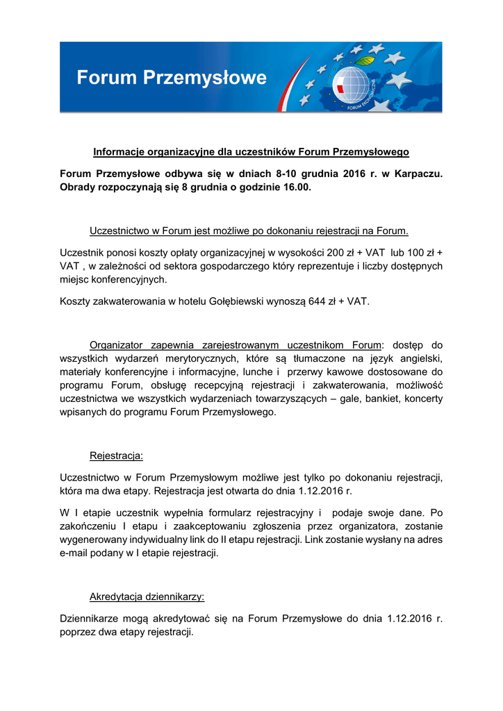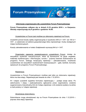 Informacje organizacyjne dla uczestników Forum Przemysłowego Forum Przemysłowe odbywa się w dniach 8-10 grudnia 2016 r. w Karpaczu. Obrady rozpoczynają się 8 grudnia o godzinie 16.00. Uczestnictwo w Forum jest możliwe po dokonaniu rejestracji na Forum. Uczestnik ponosi koszty opłaty organizacyjnej w wysokości 200 zł + VAT lub 100 zł + VAT , w zależności od sektora gospodarczego który reprezentuje i liczby dostępnych miejsc konferencyjnych. Koszty zakwaterowania w hotelu Gołębiewski wynoszą 644 zł + VAT. Organizator zapewnia zarejestrowanym uczestnikom Forum: dostęp do wszystkich wydarzeń merytorycznych, które są tłumaczone na język angielski, materiały konferencyjne i informacyjne, lunche i przerwy kawowe dostosowane do programu Forum, obsługę recepcyjną rejestracji i zakwaterowania, możliwość uczestnictwa we wszystkich wydarzeniach towarzyszących – gale, bankiet, koncerty wpisanych do programu Forum Przemysłowego. Rejestracja: Uczestnictwo w Forum Przemysłowym możliwe jest tylko po dokonaniu rejestracji, która ma dwa etapy. Rejestracja jest otwarta do dnia 1.12.2016 r. W I etapie uczestnik wypełnia formularz rejestracyjny i podaje swoje dane. Po zakończeniu I etapu i zaakceptowaniu zgłoszenia przez organizatora, zostanie wygenerowany indywidualny link do II etapu rejestracji. Link zostanie wysłany na adres e-mail podany w I etapie rejestracji. Akredytacja dziennikarzy: Dziennikarze mogą akredytować się na Forum Przemysłowe do dnia 1.12.2016 r. poprzez dwa etapy rejestracji. Zakwaterowanie: Zakwaterowania za pośrednictwem organizatora jest możliwe w 4* Hotelu Gołębiewski w Karpaczu. Rezerwacja obejmuje wyłącznie 2 noclegi w czasie trwania konferencji tj. od 8 do 10 grudnia 2016 r. W przypadku pytań dotyczących zakwaterowania, prosimy o kontakt na adres: [email protected] Transport: Możliwość skorzystania z transportu organizatora wyłącznie na trasie Wrocław lotnisko / Wrocław Dworzec Główny – Karpacz Hotel Gołębiewski – Wrocław lotnisko/ Wrocław Dworzec Główny. Transport gości możliwy jest tylko w czasie trwania konferencji tj. w dniach od 8 do 10 grudnia 2016 r. Rezerwacja transportu możliwa jest do 1.12.2016 r. W przypadku pytań dotyczących transportu, prosimy o kontakt na adres [email protected] Promocja Istnieje możliwość współpracy i prezentacji swojej firmy podczas Forum Przemysłowego. Prezentacja firmy w trakcie wydarzenia przy wykorzystaniu różnorodnych instrumentów promocji i reklamy umożliwi pozyskanie nowych klientów oraz nawiązanie cennych kontaktów biznesowych. W przypadku pytań dotyczących partnerstwa, prosimy o kontakt na adres [email protected] Warszawa, 10.10.2016 r.