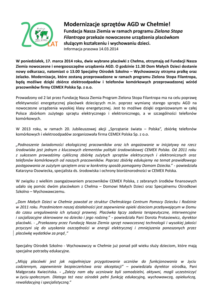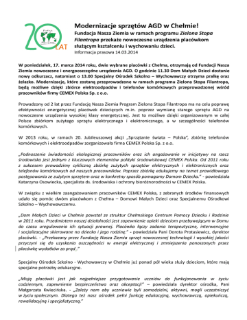 Modernizacje sprzętów AGD w Chełmie! Fundacja Nasza Ziemia w ramach programu Zielona Stopa Filantropa przekaże nowoczesne urządzenia placówkom służącym kształceniu i wychowaniu dzieci. Informacja prasowa 14.03.2014 W poniedziałek, 17. marca 2014 roku, dwie wybrane placówki z Chełma, otrzymają od Fundacji Nasza Ziemia nowoczesne i energooszczędne urządzenia AGD. O godzinie 11.30 Dom Małych Dzieci dostanie nowy odkurzacz, natomiast o 13.00 Specjalny Ośrodek Szkolno – Wychowawczy otrzyma pralkę oraz żelazko. Modernizacje, które zostaną przeprowadzone w ramach programu Zielona Stopa Filantropa, będą możliwe dzięki zbiórce elektroodpadów i telefonów komórkowych przeprowadzonej wśród pracowników firmy CEMEX Polska Sp. z o.o. Prowadzony od 2 lat przez Fundację Nasza Ziemia Program Zielona Stopa Filantropa ma na celu poprawę efektywności energetycznej placówek dziecięcych m.in. poprzez wymianę starego sprzętu AGD na nowoczesne urządzenia wysokiej klasy energetycznej. Jest to możliwe dzięki organizowanym w całej Polsce zbiórkom zużytego sprzętu elektrycznego i elektronicznego, a w szczególności telefonów komórkowych. W 2013 roku, w ramach 20. Jubileuszowej akcji „Sprzątanie świata – Polska“, zbiórkę telefonów komórkowych i elektroodpadów zorganizowała firma CEMEX Polska Sp. z o.o. „Podnoszenie świadomości ekologicznej pracowników oraz ich angażowanie w inicjatywy na rzecz środowiska jest jednym z kluczowych elementów polityki środowiskowej CEMEX Polska. Od 2011 roku z sukcesem prowadzimy cykliczną zbiórkę zużytych sprzętów elektrycznych i elektronicznych oraz telefonów komórkowych od naszych pracowników. Poprzez zbiórkę edukujemy na temat prawidłowego postępowania ze zużytym sprzętem oraz w konkretny sposób pomagamy Domom Dziecka.” - powiedziała Katarzyna Osowiecka, specjalista ds. środowiska i ochrony bioróżnorodności w CEMEX Polska. W związku z wielkim zaangażowaniem pracowników CEMEX Polska, z zebranych środków finansowych udało się pomóc dwóm placówkom z Chełma – Domowi Małych Dzieci oraz Specjalnemu Ośrodkowi Szkolno – Wychowawczemu. „Dom Małych Dzieci w Chełmie powstał ze struktur Chełmskiego Centrum Pomocy Dziecku i Rodzinie w 2011 roku. Przedmiotem naszej działalności jest zapewnienie opieki dzieciom przebywającym w Domu do czasu uregulowania ich sytuacji prawnej. Placówka łączy zadania terapeutyczne, interwencyjne i socjalizacyjne skierowane na dziecko i jego rodzinę.” - powiedziała Pani Dorota Protasiewicz, dyrektor placówki. - „Przekazany przez Fundację Nasza Ziemia sprzęt nowoczesnej technologii i wysokiej jakości przyczyni się do uzyskania oszczędności w energii elektrycznej i zmniejszenia ponoszonych przez placówkę wydatków za prąd .” Specjalny Ośrodek Szkolno - Wychowawczy w Chełmie już ponad pół wieku służy dzieciom, które mają specjalne potrzeby edukacyjne. „Misją placówki jest jak najpełniejsze przygotowanie uczniów do funkcjonowania w życiu codziennym, zapewnienie bezpieczeństwa oraz akceptacji” – powiedziała dyrektor ośrodka, Pani Małgorzata Kwiecińska. - „Zależy nam aby uczniowie byli samodzielni, aktywni, mogli uczestniczyć w życiu społecznym. Dlatego też nasz ośrodek pełni funkcję edukacyjną, wychowawczą, opiekuńczą, rewalidacyjną i specjalistyczną.” Więcej o działaniach Fundacji Nasza Ziemia na stronie: www.naszaziemia.pl www.facebook.com/naszaziemia Fundacja Nasza Ziemia jest organizacją pozarządową, która już od 20 lat realizuje cele mające status pożytku publicznego, specjalizując się w edukacji ekologicznej i obywatelskiej, ochronie środowiska oraz podnoszeniu świadomości środowiskowej społeczeństwa. Od początku swego istnienia koordynuje w Polsce kampanię Sprzątanie świata, będącą częścią międzynarodowego ruchu na rzecz ochrony środowiska Clean up the World. W ruchu tym uczestniczy blisko 40 mln wolontariuszy na całym świecie. Fundacja prowadzi również - wspólnie z partnerami - całoroczne programy na rzecz ochrony środowiska i przyrody, promocji zasad zrównoważonego rozwoju, selektywnej zbiórki odpadów itp. Więcej www.naszaziemia.pl Zielona Stopa Filantropa to program, który propaguje zwiększanie efektywności energetycznej w placówkach służących wychowaniu i edukacji dzieci, poprzez modernizację sprzętu AGD. Nowoczesny sprzęt nabywany jest za środki zgromadzone podczas zbiórek starych telefonów komórkowych i zużytego sprzętu elektrycznego i elektronicznego. Więcej informacji: www.teledar.pl CEMEX jest globalną, dynamicznie rozwijającą się firmą z branży materiałów budowlanych. Swoim klientom i społecznościom lokalnym w ponad 50 krajach na całym świecie zapewnia najwyższej jakości usługi oraz materiały budowlane, takie jak cement, beton towarowy oraz kruszywa. Firma należy do krajowej czołówki producentów cementu, betonu towarowego, kruszyw i chemii budowlanej. Posiada 2 cementownie, 1 przemiałownię klinkieru, 8 kopalni kruszyw oraz sieć 40 wytwórni betonu towarowego. Więcej o firmie: www.cemex.pl