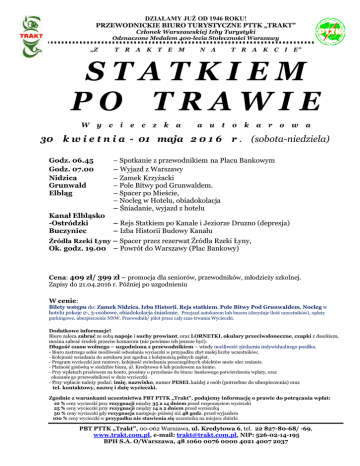 DZIAŁAMY JUŻ OD 1946 ROKU! PRZEWODNICKIE BIURO TURYSTYCZNE PTTK „TRAKT” Członek Warszawskiej Izby Turystyki Odznaczone Medalem 400-lecia Stołeczności Warszawy „Z T R A K T E M N A T R A K C I E’’ STATKIEM PO TRAWIE W 30 y c i e c z k a a u t k w i e t n i a - 01 maja 2 0 1 6 Godz. 06.45 Godz. 07.00 Nidzica Grunwald Elbląg Kanał Elbląsko -Ostródzki Buczyniec o k a r o w a r . (sobota-niedziela) – Spotkanie z przewodnikiem na Placu Bankowym – Wyjazd z Warszawy – Zamek Krzyżacki – Pole Bitwy pod Grunwaldem. – Spacer po Mieście, – Nocleg w Hotelu, obiadokolacja – Śniadanie, wyjazd z hotelu – Rejs Statkiem po Kanale i Jeziorze Druzno (depresja) – Izba Historii Budowy Kanału Źródła Rzeki Łyny – Spacer przez rezerwat Źródła Rzeki Łyny, Ok. godz. 19.00 – Powrót do Warszawy (Plac Bankowy) Cena: 409 zł/ 399 zł – promocja dla seniorów, przewodników, młodzieży szkolnej. Zapisy do 21.04.2016 r. Później po uzgodnieniu W cenie: Bilety wstępu do: Zamek Nidzica, Izba Historii, Rejs statkiem, Pole Bitwy Pod Grunwaldem, Nocleg w hotelu pokoje 2-, 3-osobowe, obiadokolacja śniadanie, Przejazd autokarem lub busem (decyduje ilość uczestników), opłaty parkingowe, ubezpieczenie NNW. Przewodnik/ pilot przez cały czas trwania Wycieczki. Dodatkowe informacje! Biuro zaleca zabrać ze sobą napoje i suchy prowiant, oraz LORNETKI, okulary przeciwsłoneczne, czapki z daszkiem, można zabrać środek przeciw komarom (nie powinno ich jeszcze być). Długość czasu wolnego – uzgodniona z przewodnikiem – wtedy możliwość zjedzenia indywidualnego posiłku. - Biuro zastrzega sobie możliwość odwołania wycieczki w przypadku zbyt małej liczby uczestników, - Kolejność wsiadania do autokaru jest zgodna z kolejnością pełnych zapłat. - Program wycieczki jest ramowy, kolejność zwiedzania poszczególnych obiektów może ulec zmianie. - Płatność gotówką w siedzibie biura, ul. Kredytowa 6 lub przelewem na konto. - Przy wpłatach przelewem na konto, prosimy o przysłanie do biura: bankowego potwierdzenia wpłaty, oraz okazanie go przewodnikowi w dniu wycieczki. - Przy wpłacie należy podać: imię, nazwisko, numer PESEL każdej z osób (potrzebne do ubezpieczenia) oraz tel. kontaktowy, nazwę i datę wycieczki. Zgodnie z warunkami uczestnictwa PBT PTTK „Trakt”, podajemy informację o prawie do potrącania wpłat: 10 % ceny wycieczki przy rezygnacji między 35 a 14 dniem przed rozpoczęciem wycieczki 25 % ceny wycieczki przy rezygnacji między 14 a 2 dniem przed wycieczką 50 % ceny wycieczki gdy rezygnacja następuje później niż 48 godz. przed wyjazdem 100 % ceny wycieczki w przypadku nie stawienia się uczestnika na miejsce zbiórki PBT PTTK „Trakt”, 00-062 Warszawa, ul. Kredytowa 6, tel. 22 827-80-68/ -69, www.trakt.com.pl, e-mail: [email protected], NIP: 526-02-14-195 BPH S.A. O/Warszawa, 48 1060 0076 0000 4021 4007 2037