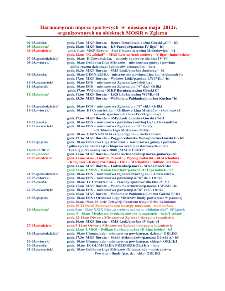 Harmonogram imprez sportowych w miesiącu maju 2012r. organizowanych na obiektach MOSiR w Zgierzu 02.05./środa/ 05.05./sobota/ 06.05./niedziela/ 07.05./poniedziałek/ 08.05./wtorek/ 09.05./środa/ 10.05./czwartek/ 11.05./piątek/ 12.05./sobota/ 14.05./poniedziałek/ 15.05./wtorek/ 16.05./środa/ 17.05./czwartek/ 18.05./piątek/ 18-20.05.2012. 19.05./sobota/ 20.05./niedziela/ 21.05./poniedziałek/ 22.05./wtorek/ 23.05./środa/ 24.05./czwartek/ 25.05./piątek/ 26.05./sobota/ 27.05./niedziela/ 28.05./poniedziałek/ 29.05./wtorek/ 30.05./środa/ 31.05./czwartek/ godz.17.oo MKP Boruta – Bzura Ozorków/p.nożna Górski „C”/ - b3 godz.16.oo MKP Boruta – KS Paradyż/p.nożna IV liga/ - b1 godz.11.oo MKP Boruta – Stal Głowno /p.nożna Michałowicz/ - b1 godz.12.oo TG „Sokół” – MKS Łowicz /tenis stołowy – V liga/ - hala/1sektor godz. 10.oo II Czwartek l.a. – zawody sportowe dla klas IV-VI godz. 10.oo Orlikowa Liga Mistrzów- mistrzostwa gminy i powiatu /piłka ręczna dziewcząt i chłopców gimnazjów/ - hala godz.16.3o MKP Boruta – SMS Łódź/p.nożna Juniorzy/ - b1 godz. 10.oo GIMNAZJDA– mistrzostwa powiatu/Liga l.a./-Aleksandrów godz.17.oo MKP Boruta – Widzew Łódź/p.nożna ŁWJMŁ./ -b1 godz. 10.oo IMS – mistrzostwa Zgierza/czwórbój l.a./ godz. 10.oo IMS – mistrzostwa Zgierza/p.n.”6” dz./- Orliki godz.17.oo Włókniarz - MKP Boruta/p.nożna Górski C/ godz.11.oo MKP Boruta – ŁKS Łódź/p.nożna WJMł./-b1 godz.13.3o MKP Boruta – Włókniarz Pabianice/p.nożna Kuchar/-b1 godz. 10.oo IMS – mistrzostwa Zgierza/p.n.”6” chł./- Orliki godz. 10.oo III Czwartek l.a. – Orlikowa Liga Mistrzów – skok wzwyż zawody sportowe dla klas IV-VI/gimnazja godz.17.oo MKP Boruta – SMS Łódź /p.nożna Górski C/-b3 godz. 10.oo IMS – mistrzostwa powiatu/czwórbój l.a./ - Aleksandrów godz. 10.oo IMS – mistrzostwa Zgierza/p.n.”6” finały – Orlikowa Liga Mistrzów/- Orliki godz. 10.oo GIMNAZJADA- rejon/liga la./ - Aleksandrów godz.17.3o MKP Boruta – Poggoń Zduńska Wola/p.nożna Górski E/- b2 godz. 10.oo Orlikowa Liga Mistrzów - mistrzostwa gminy i powiatu / piłka ręczna dziewcząt i chłopców szkół podstawowych/ - hala `Turniej piłki nożnej rocz.2000 „MAŁE EURO” godz.11.oo MKP Boruta – Sokół Aleksandrów/p.nożna juniorzy/-b2 godz.11.oo-14.oo „Tour de Powiat” - Wyścig Kolarski – ul.Wschodnia – Kolejowa – Kuropatwińskiej – Orla – Wschodnia / 1600m/ -stadion godz.11.oo MKP Boruta – Łodzianka/p.nożna- MIchałowicz/-b2 godz.13.oo UMKS – Kotan Ozorków/p.nożna III Liga kobiet/ - b3 godz. 10.oo IMS – mistrzostwa rejonu/czwórbój l.a./- Aleksandrów godz. 10.oo IMS – mistrzostwa powiatu/p.n.”6” dz./- Orliki godz. 10.oo IV Czwartek l.a. – zawody sportowe dla klas IV-VI godz.17.oo MKP Boruta – Widok Skierniewice/p.nożna LWJMł./-b1 godz. 10.oo IMS – mistrzostwa powiatu/p.n.”6” chł./- Orliki godz.15.oo MKP Boruta – Włókniarz Pabianice/p.nożna Górski E/-b3 godz. 10.oo IMS : Orlikowa Liga Mistrzów finały powiatowe w p.nożnej godz.16.oo-19.oo 20-lecie Telewizji Centrum festyn/Orlik Leśmiana/ godz.16-22 Dzień Samorządowca występy muzyczne - stadion/hala godz.9.oo -13.oo XXIX Bieg „o srebrne czółenko włókniarskie”–SP1,park godz. 9 - 16.oo Międzywojewódzkie zawody w zapasach – hala/1 sektor/ godz.12-18.oo Otwarte Mistrzostwa Zgierza i okręgu w łucznictwie godz.16.oo MKP Boruta – SMS Łódź/p.nożna IV liga/-b1 godz.9-14.oo Otwarte Mistrzostwa Zgierza i okręgu w łucznictwie godz.13.oo UMKS – Pelikan Łowicz/p.nożna III Liga kobiet/ - b3 godz. 10.oo Gimnazjada– mistrzostwa powiatu/p.n. dziew./- ORLIKI godz.17.3o MKP Boruta – Sokół Aleksandrów/p.nożna Górski A/- b3 godz. 10.oo Gimnazjada– mistrzostwa powiatu/p.n. chłop./- ORLIKI godz. 10.oo IX OLIMPIADA PRZEDSZKOLAKA - hala godz. 10.oo Orlikowa Liga Mistrzów /Gimnazjada – mistrzostwa Powiatu – finały /p.n. dz. i chł./- ORLIKI