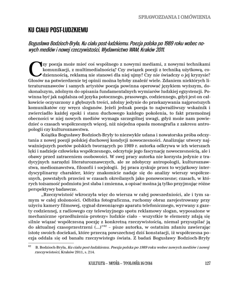 SPRAWOZDANIA I OMÓWIENIA KU CIAŁU POST-LUDZKIEMU Bogusława Bodzioch-Bryła, Ku ciału post-ludzkiemu. Poezja polska po 1989 roku wobec nowych mediów i nowej rzeczywistości, Wydawnictwo WAM, Kraków 2011. C zy poezja może mieć coś wspólnego z nowymi mediami, z nowymi technikami komunikacji, z multimedialnością? Czy związek poezji z techniką użytkową, codziennością, reklamą nie stanowi dla niej ujmy? Czy nie świadczy o jej kryzysie? Głosów na potwierdzenie tej opinii można byłoby znaleźć wiele. Zdaniem niektórych literaturoznawców i samych artystów poezja powinna operować językiem wyższym, doskonalszym, zdolnym do opisania fundamentalnych wymiarów ludzkiej egzystencji. Powinna być jak najdalsza od języka potocznego, prasowego, codziennego, gdyż jest on całkowicie oczyszczony z głębszych treści, zdolny jedynie do przekazywania najprostszych komunikatów czy wręcz sloganów. Jeżeli jednak poezja to najwrażliwszy wskaźnik i zwierciadło każdej epoki i stanu duchowego każdego pokolenia, to fakt przemożnej obecności w niej nowych mediów wymaga szczególnej uwagi, gdyż może nam powiedzieć o czasach współczesnych więcej, niż niejedna opasła monografia z zakresu antropologii czy kulturoznawstwa. Książka Bogusławy Bodzioch-Bryły to niezwykle udana i nowatorska próba odczytania z nowej poezji polskiej duchowej kondycji nowoczesności. Analizując utwory najważniejszych poetów polskich tworzących po 1989 r. autorka odkrywa w ich wierszach lęki i nadzieje człowieka współczesnego, odczytuje jego fascynację nowoczesnością, ale i obawy przed zatraceniem osobowości. W swej pracy autorka nie korzysta jedynie z tradycyjnych narzędzi literaturoznawczych, ale ze zdobyczy antropologii, kulturoznawstwa, medioznawstwa, filozofii i socjologii. Jej praca zyskuje przez to wyjątkowy interdyscyplinarny charakter, który znakomicie nadaje się do analizy wierszy współczesnych, powstałych przecież w czasach określanych jako ponowoczesne; czasach, w których tożsamość podmiotu jest słaba i zmienna, a opisać można ją tylko przyjmując różne perspektywy badawcze. „Rzeczywistość wkroczyła więc do wiersza w całej powszedniości, ale i tym samym w całej złożoności. Odbitka fotograficzna, ruchomy obraz zarejestrowany przy użyciu kamery filmowej, sygnał dzwoniącego aparatu telefonicznego, wyrwany z gazety codziennej, z radiowego czy telewizyjnego spotu reklamowy slogan, wyposażone w mechaniczne »przedłużenia–protezy« ludzkie ciało – wszystkie te elementy zdają się silnie wiązać współczesną poezję z konkretną rzeczywistością, niemal przyszpilać ją do aktualnej czasoprzestrzeni (...)” 62 – pisze autorka, w ostatnim zdaniu zawierając istotę swoich dociekań, które przeczą powszechnej dziś konstatacji, iż współczesna po ezja oddala się od banału rzeczywistego świata. Z badań Bogusławy Bodzioch-Bryły 62 B. Bodzioch-Bryła, Ku ciału post-ludzkiemu. Poezja polska po 1989 roku wobec nowych mediów i nowej rzeczywistości, Kraków 2011, s. 214. Kultura – Media – Teologia 16/2014 127 SPRAWOZDANIA I OMÓWIENIA wynika bowiem, że poezja nie tylko od tego banału nie ucieka, ale po niego świadomie sięga, aby go odbanalizować i uczynić punktem wyjścia oraz inspiracją dla wyrażenia ważnych ludzkich doświadczeń. Jednym z ważniejszych zjawisk obecnych w poezji polskiej po 1989 r. jest depersonalizacja osoby, ze szczególnym naciskiem na daleko idącą modyfikację cielesności, aż po rodzaj tęsknoty do cyborgizacji człowieka, co wyraża dziś nurt transhumanizmu. Rozwój inżynierii biologicznej, transplantologii, robotyki, badań nad sztuczną inteligencją, przemożna obecność w życiu ludzkim rzeczywistości wirtualnej sprawiają, iż granica między człowiekiem, jego ciałem a resztą świata jest płynna. Przekroczenie tej granicy, czyli dualizmu między tym, co ludzkie a tym, co sztuczne, jawi się jako jedna z największych nadchodzących rewolucji, która może całkowicie zmienić kondycję ludzką. Młodzi poeci nie traktują człowieka jako integralnej całości, nie uznają ciała za nieprzekraczalny ludzki horyzont, ale widzą w nim raczej element do przekroczenia i wyzwolenia. Sam człowiek jawi się im jako automat, mechanizm podobny do najnowszych tworów techniki, jego tożsamość jest problematyczna, niespójna, „pochłonięta przez interfejs”. Człowiek postrzega siebie jako użytkownika ciała, jako byt dodany sztucznie do ciała, aby nim zarządzać. „idę & podziwiam jak precyzyjnie to jest zrobione Nacisk na podeszwę dokładnie w chwili Kiedy spód nogi spotyka się z chodnikiem Trochę przekręcę głowę i oglądam trochę inny Fragment obrazu. (...) Kurz, wirowanie – bardzo Realistycznie oddane. (...) Ci sami hipisi na bębnach, co zeszłej wiosny Nawet ten sam rytm. Może jednak krew – tylko Usłużny procesor podsuwa obrazy (...).” (M.I. Biedrzycki, Virtual reality) Panowanie nad wirtualną przestrzenią wydaje się dawać człowiekowi nieograniczone demiurgiczne właściwości, z których nie waha się on korzystać, aby powoływać do życia nowe światy. „to ja sprowadzam na miasto i niszczę potwory. jestem źródłem rozrywki i pracy. mecenasem sztuki. to jest mój świat, więc nie mieszaj mi w głowie. nie rozmawiaj ze mną o motywie boga w poezji współczesnej. nigdy nie strasz mnie śmiercią. znam wszystkie kody na nieśmiertelność. enter.” (P. Lekszycki, sim city; w: Wiersze przygodowe i dokumentalne) 128 Kultura – Media – Teologia 16/2014 SPRAWOZDANIA I OMÓWIENIA Na wiersz współczesny, jak wykazuje autorka, przemożny wpływ ma kultura masowa i to do tego stopnia, iż można mówić o jego wymiarze paramultimedialnym. Młodzi poeci odpowiadając w wierszach na szum informacyjny, migawkowość obrazów i fragmentaryczność informacji konstytuują swoje utwory jako ciąg pojęć-obrazów, co ma oddać współczesny 