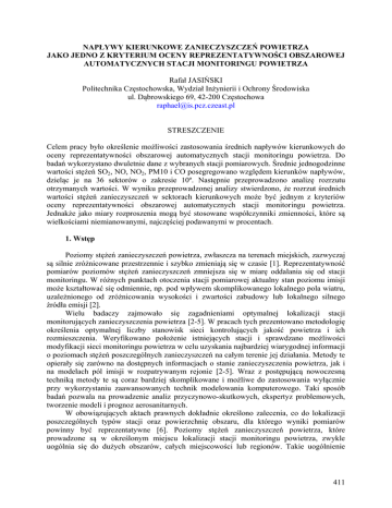 NAPŁYWY KIERUNKOWE ZANIECZYSZCZEŃ POWIETRZA JAKO JEDNO Z KRYTERIUM OCENY REPREZENTATYWNOŚCI OBSZAROWEJ AUTOMATYCZNYCH STACJI MONITORINGU POWIETRZA Rafał JASIŃSKI Politechnika Częstochowska, Wydział Inżynierii i Ochrony Środowiska ul. Dąbrowskiego 69, 42-200 Częstochowa [email protected] STRESZCZENIE Celem pracy było określenie możliwości zastosowania średnich napływów kierunkowych do oceny reprezentatywności obszarowej automatycznych stacji monitoringu powietrza. Do badań wykorzystano dwuletnie dane z wybranych stacji pomiarowych. Średnie jednogodzinne wartości stężeń SO2, NO, NO2, PM10 i CO posegregowano względem kierunków napływów, dzieląc je na 36 sektorów o zakresie 10º. Następnie przeprowadzono analizę rozrzutu otrzymanych wartości. W wyniku przeprowadzonej analizy stwierdzono, że rozrzut średnich wartości stężeń zanieczyszczeń w sektorach kierunkowych może być jednym z kryteriów oceny reprezentatywności obszarowej automatycznych stacji monitoringu powietrza. Jednakże jako miary rozproszenia mogą być stosowane współczynniki zmienności, które są wielkościami niemianowanymi, najczęściej podawanymi w procentach. 1. Wstęp Poziomy stężeń zanieczyszczeń powietrza, zwłaszcza na terenach miejskich, zazwyczaj są silnie zróżnicowane przestrzennie i szybko zmieniają się w czasie [1]. Reprezentatywność pomiarów poziomów stężeń zanieczyszczeń zmniejsza się w miarę oddalania się od stacji monitoringu. W różnych punktach otoczenia stacji pomiarowej aktualny stan poziomu imisji może kształtować się odmiennie, np. pod wpływem skomplikowanego lokalnego pola wiatru, uzależnionego od zróżnicowania wysokości i zwartości zabudowy lub lokalnego silnego źródła emisji [2]. Wielu badaczy zajmowało się zagadnieniami optymalnej lokalizacji stacji monitorujących zanieczyszczenia powietrza [2-5]. W pracach tych prezentowano metodologię określenia optymalnej liczby stanowisk sieci kontrolujących jakość powietrza i ich rozmieszczenia. Weryfikowano położenie istniejących stacji i sprawdzano możliwości modyfikacji sieci monitoringu powietrza w celu uzyskania najbardziej wiarygodnej informacji o poziomach stężeń poszczególnych zanieczyszczeń na całym terenie jej działania. Metody te opierały się zarówno na dostępnych informacjach o stanie zanieczyszczenia powietrza, jak i na modelach pól imisji w rozpatrywanym rejonie [2-5]. Wraz z postępującą nowoczesną techniką metody te są coraz bardziej skomplikowane i możliwe do zastosowania wyłącznie przy wykorzystaniu zaawansowanych technik modelowania komputerowego. Taki sposób badań pozwala na prowadzenie analiz przyczynowo-skutkowych, ekspertyz problemowych, tworzenie modeli i prognoz aerosanitarnych. W obowiązujących aktach prawnych dokładnie określono zalecenia, co do lokalizacji poszczególnych typów stacji oraz powierzchnię obszaru, dla którego wyniki pomiarów powinny być reprezentatywne [6]. Poziomy stężeń zanieczyszczeń powietrza, które prowadzone są w określonym miejscu lokalizacji stacji monitoringu powietrza, zwykle uogólnia się do dużych obszarów, całych miejscowości lub regionów. Takie uogólnienie 411 często jest bezpodstawne. Dla przedstawienia wiarygodności pomiarów przyjmuje się pewną cechę fizyczną, która charakteryzuje wielkość obszaru, dla którego wyniki pomiarów można uznać za reprezentatywne. Za cechę tę przyjęto tzw. skalę przestrzennej reprezentatywności wyników. Związana jest ona ze średnią odległością (dr) między skrajnymi punktami obszaru, w którym stężenia zanieczyszczeń nie różnią się znacznie od wartości pomierzonych na stacji monitoringu. Różnica ta nie powinna przekraczać 20% stężenia zmierzonego na stanowisku pomiarowym w odniesieniu do wartości średniorocznych lub też sezonowych. Reprezentatywność punktu pomiarowego zależna jest od gradientu stężeń średnich w jego otoczeniu [7-8]. Reprezentatywność stanowiska pomiarowego możliwa jest do określenia za pomocą obliczeniowych rozkładów średnich stężeń zanieczyszczeń na wybranym obszarze, które uzyskuje się dzięki wykorzystaniu modeli matematycznych. Jest to również możliwe dzięki prowadzeniu okresowych pomiarów na danym obszarze przy zastosowaniu prostych technik lub stacji mobilnych oraz analizie lokalizacji źródeł emisji i warunków dyspersji zanieczyszczeń w wybranym rejonie [7-8]. Do tej pory jednak nie sprecyzowano jednoznacznie, w jaki sposób można obiektywnie ocenić reprezentatywność obszarową już istniejących stacji monitoringu powietrza metodami modelowymi. Wstępne badania potwierdziły tezę, że informacja o reprezentatywności obszarowej danej stacji zawarta jest w danych pomiarowych pochodzących z sieci monitoringu powietrza [9]. Zaobserwowano, że jeśli na niewielkim obszarze o jednolitych warunkach klimatycznych zlokalizowanych jest kilka automatycznych stacji monitoringu powietrza, czynniki globalne i regionalne powodują ten sam efekt zmienności stężeń na wszystkich tych stacjach, natomiast różnice w przebiegach zmienności stężeń poszczególnych zanieczyszczeń, powodowane są przez czynniki lokalne. Większe rozbieżności w przebiegach stężeń danego zanieczyszczenia odnotowanych na poszczególnych stacjach, od przebiegów uśrednionych dla całego obszaru, wskazują na zwiększony wpływ lokalnych czynników, wpływających na poziomy tych stężeń. Przekłada się to bezpośrednio na stopień reprezentatywności obszarowej poszczególnych stacji. Jeśli czynniki lokalne w małym stopniu oddziałują na poziomy stężeń poszczególnych zanieczyszczeń, to wzajemna zgodność tych przebiegów stężeń na wszystkich stacjach w danym obszarze będzie duża. Dalsze badania wskazywały, że w przypadku zastosowania prostych metod statystycznych podobną informację można otrzymać wykorzystując dane tylko z jednej stacji zlokalizo