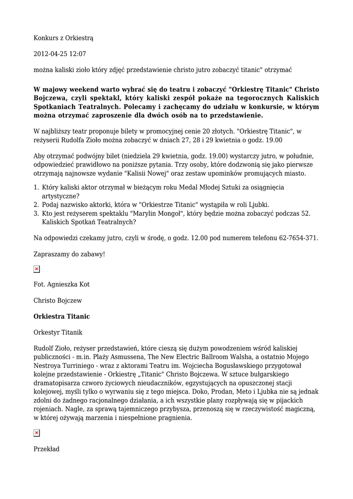 Konkurs z Orkiestrą 2012-04-25 12:07 można kaliski zioło który zdjęć przedstawienie christo jutro zobaczyć titanic" otrzymać W majowy weekend warto wybrać się do teatru i zobaczyć "Orkiestrę Titanic" Christo Bojczewa, czyli spektakl, który kaliski zespół pokaże na tegorocznych Kaliskich Spotkaniach Teatralnych. Polecamy i zachęcamy do udziału w konkursie, w którym można otrzymać zaproszenie dla dwóch osób na to przedstawienie. W najbliższy teatr proponuje bilety w promocyjnej cenie 20 złotych. "Orkiestrę Titanic", w reżyserii Rudolfa Zioło można zobaczyć w dniach 27, 28 i 29 kwietnia o godz. 19.00 Aby otrzymać podwójny bilet (niedziela 29 kwietnia, godz. 19.00) wystarczy jutro, w południe, odpowiedzieć prawidłowo na poniższe pytania. Trzy osoby, które dodzwonią się jako pierwsze otrzymają najnowsze wydanie "Kalisii Nowej" oraz zestaw upominków promujących miasto. 1. Który kaliski aktor otrzymał w bieżącym roku Medal Młodej Sztuki za osiągnięcia artystyczne? 2. Podaj nazwisko aktorki, która w "Orkiestrze Titanic" wystąpiła w roli Ljubki. 3. Kto jest reżyserem spektaklu "Marylin Mongoł", który będzie można zobaczyć podczas 52. Kaliskich Spotkań Teatralnych? Na odpowiedzi czekamy jutro, czyli w środę, o godz. 12.00 pod numerem telefonu 62-7654-371. Zapraszamy do zabawy! Fot. Agnieszka Kot Christo Bojczew Orkiestra Titanic Orkestyr Titanik Rudolf Zioło, reżyser przedstawień, które cieszą się dużym powodzeniem wśród kaliskiej publiczności - m.in. Plaży Asmussena, The New Electric Ballroom Walsha, a ostatnio Mojego Nestroya Turriniego - wraz z aktorami Teatru im. Wojciecha Bogusławskiego przygotował kolejne przedstawienie - Orkiestrę „Titanic" Christo Bojczewa. W sztuce bułgarskiego dramatopisarza czworo życiowych nieudaczników, egzystujących na opuszczonej stacji kolejowej, myśli tylko o wyrwaniu się z tego miejsca. Doko, Prodan, Meto i Ljubka nie są jednak zdolni do żadnego racjonalnego działania, a ich wszystkie plany rozpływają się w pijackich rojeniach. Nagle, za sprawą tajemniczego przybysza, przenoszą się w rzeczywistość magiczną, w której ożywają marzenia i niespełnione pragnienia. Przekład Hanna Karpińska Reżyseria Rudolf Zioło Scenografia Robert Rumas Muzyka Bolesław Rawski Projekt plakatu Maciej Chodziński i Robert Rumas Autor zdjęć Agnieszka Kot Autor zdjęć z próby Piotr St. Walendowski Asystent reżysera Izabela Piątkowska Inspicjent Nikola Brojerska Obsada Izabela Piątkowska Zbigniew Antoniewicz Szymon Mysłakowski Marcin Trzęsowski Lech Wierzbowski Premiera Styczeń 2012 Czas trwania spektaklu 120 min Autor: Iwona Cieślak Przeczytano: 136 razy Źródło: http://www.kalisz.pl/portal.php?aid=news&news…