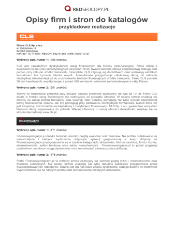 Opisy firm i stron do katalogów przykładowe realizacje Firma: CLS Sp. z o.o. ul. Odolańska 17 02-562 Warszawa NIP: 897-16-71-675 | REGON: 932791365 | KRS: 0000110127 Wybrany opis numer 1: (595 znaków) CLS jest niezależnym dystrybutorem usług finansowych dla branży motoryzacyjnej. Firma działa z sukcesami na na rynku motoryzacyjnym od ponad 10 lat. Swoim klientom oferuje kompleksową obsługę oraz pomoc przy zakupie środka transportu. Specjaliści CLS zajmują się doradztwem oraz realizacją wszelkich formalności. Na życzenie klienta zespół konsultantów przygotowuje całościową ofertę, od zebrania niezbędnej dokumentacji aż do uruchomienia środków finansujących środek transportu. Firma CLS posiada 39 biur handlowych, współpracując z ponad 350 komisami i salonami samochodowymi w całej Polsce. Wybrany opis numer 2: (651 znaków) Wiemy ile formalności potrzeba przy zakupie pojazdu ponieważ zajmujemy się tym od 10 lat. Firma CLS działa w branży usług finansowych dla motoryzacji od początku istnienia. W naszej ofercie znajdują się kredyty na zakup środka transportu oraz leasingi. Nasi doradcy pomagają nie tylko wybrać odpowiednią formę finansowania zakupu, ale też pomagają przy załatwieniu niezbędnych formalności. Nasza firma nie jest związana, ani formalnie ani kapitałową z instytucjami finansowymi. CLS Sp. z o.o. gwarantuje wszystkim klientom ofertę dopasowaną do potrzeb. Więcej informacji o naszej ofercie i działalności znajduje się na stronie internetowej www.cls.pl. Wybrany opis numer 1: (471 znaków) Finansowymagazyn.pl dotyka tematyki szeroko pojętej ekonomii oraz finansów. Na portalu publikowane są najważniejsze i bieżące wydarzenia dotyczące sytuacji gospodarczej w kraju. Artykuły na Finansowymagazyn.pl pogrupowane są w sześciu kategoriach: aktualności, finanse osobiste, firma i biznes, makroekonomia, sektor bankowy oraz sektor nieruchomości. Finansowymagazyn.pl to portal przyjazny czytelnikom, na którym mogą dyskutować oraz komentować zamieszczone publikacje. Wybrany opis numer 2: (378 znaków) Portal Finansowymagazyn.pl to rzetelny serwis zajmujący się szeroko pojętą mikro i makroekonomii oraz finansów publicznych. Na naszej stronie znajdują się tylko aktualne publikacje przygotowane przez wyspecjalizowanych redaktorów. Ważne jest dla nas także zdanie czytelników, dlatego dajemy im możliwość wypowiedzenia się na naszym portalu oraz komentowania bieżących materiałów.