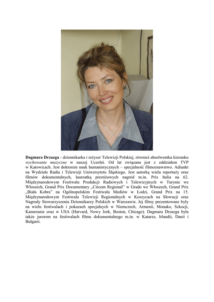 Dagmara Drzazga - dziennikarka i reŜyser Telewizji Polskiej, równieŜ absolwentka kierunku wychowanie muzyczne w naszej Uczelni. Od lat związana jest z oddziałem TVP w Katowicach. Jest doktorem nauk humanistycznych – specjalność filmoznawstwo. Adiunkt na Wydziale Radia i Telewizji Uniwersytetu Śląskiego. Jest autorką wielu reportaŜy oraz filmów dokumentalnych, laureatką prestiŜowych nagród m.in. Prix Italia na 62. Międzynarodowym Festiwalu Produkcji Radiowych i Telewizyjnych w Turynie we Włoszech, Grand Prix Documentary „Circom Regional” w Grado we Włoszech, Grand Prix „Biała Kobra” na Ogólnopolskim Festiwalu Mediów w Łodzi, Grand Prix na 15. Międzynarodowym Festiwalu Telewizji Regionalnych w Koszycach na Słowacji oraz Nagrody Stowarzyszenia Dziennikarzy Polskich w Warszawie. Jej filmy prezentowane były na wielu festiwalach i pokazach specjalnych w Niemczech, Armenii, Monako, Szkocji, Kamerunie oraz w USA (Harvard, Nowy Jork, Boston, Chicago). Dagmara Drzazga była takŜe jurorem na festiwalach filmu dokumentalnego m.in. w Katarze, Irlandii, Danii i Bułgarii.