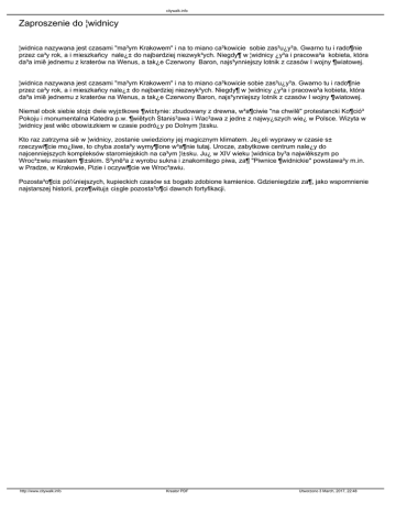 citywalk.info Zaproszenie do ¦widnicy ¦widnica nazywana jest czasami "ma³ym Krakowem" i na to miano ca³kowicie sobie zas³u¿y³a. Gwarno tu i rado¶nie przez ca³y rok, a i mieszkañcy nale¿± do najbardziej niezwyk³ych. Niegdy¶ w ¦widnicy ¿y³a i pracowa³a kobieta, która da³a imiê jednemu z kraterów na Wenus, a tak¿e Czerwony Baron, najs³ynniejszy lotnik z czasów I wojny ¶wiatowej. ¦widnica nazywana jest czasami "ma³ym Krakowem" i na to miano ca³kowicie sobie zas³u¿y³a. Gwarno tu i rado¶nie przez ca³y rok, a i mieszkañcy nale¿± do najbardziej niezwyk³ych. Niegdy¶ w ¦widnicy ¿y³a i pracowa³a kobieta, która da³a imiê jednemu z kraterów na Wenus, a tak¿e Czerwony Baron, najs³ynniejszy lotnik z czasów I wojny ¶wiatowej. Niemal obok siebie stoj± dwie wyj±tkowe ¶wi±tynie: zbudowany z drewna, w³a¶ciwie "na chwilê" protestancki Ko¶ció³ Pokoju i monumentalna Katedra p.w. ¶wiêtych Stanis³awa i Wac³awa z jedn± z najwy¿szych wie¿ w Polsce. Wizyta w ¦widnicy jest wiêc obowi±zkiem w czasie podró¿y po Dolnym ¦l±sku. Kto raz zatrzyma siê w ¦widnicy, zostanie uwiedziony jej magicznym klimatem. Je¿eli wyprawy w czasie s± rzeczywi¶cie mo¿liwe, to chyba zosta³y wymy¶lone w³a¶nie tutaj. Urocze, zabytkowe centrum nale¿y do najcenniejszych kompleksów staromiejskich na ca³ym ¦l±sku. Ju¿ w XIV wieku ¦widnica by³a najwiêkszym po Wroc³±wiu miastem ¶l±skim. S³ynê³a z wyrobu sukna i znakomitego piwa, za¶ "Piwnice ¶widnickie" powstawa³y m.in. w Pradze, w Krakowie, Pizie i oczywi¶cie we Wroc³awiu. Pozosta³o¶ci± pó¼niejszych, kupieckich czasów s± bogato zdobione kamienice. Gdzieniegdzie za¶, jako wspomnienie najstarszej historii, prze¶wituj± ci±gle pozosta³o¶ci dawnch fortyfikacji. http://www.citywalk.info Kreator PDF Utworzono 3 March, 2017, 22:48