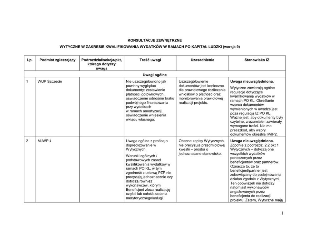 KONSULTACJE ZEWNĘTRZNE WYTYCZNE W ZAKRESIE KWALIFIKOWANIA WYDATKÓW W RAMACH PO KAPITAŁ LUDZKI (wersja 9) Lp. Podmiot zgłaszający Podrozdział/sekcja/pkt, którego dotyczy uwaga Treść uwagi Uzasadnienie Stanowisko IZ Uwagi ogólne 1 2 WUP Szczecin MJWPU Nie uszczegółowiono jak powinny wyglądać dokumenty: zestawienie płatności gotówkowych, oświadczenie odnośnie braku podwójnego finansowania przy wydatkach w ramach amortyzacji, oświadczenie wniesienia wkładu własnego. Uszczegółowienie dokumentów jest konieczne dla prawidłowego rozliczania wniosków o płatność oraz monitorowania prawidłowej realizacji projektu. Uwaga ogólna z prośbą o doprecyzowanie w Wytycznych. Obecne zapisy Wytycznych nie precyzują przedmiotowej kwestii – prośba o jednoznaczne stanowisko. Warunki ogólnych / podstawowych zasad kwalifikowania wydatków w ramach PO KL, w tym zgodność z ustawą PZP nie precyzują jednoznacznie czy dotyczą równieŜ wykonawców, którym Beneficjent zleca realizację części lub całość zadania merytorycznego/usługi. Uwaga nieuwzględniona. Wytyczne zawierają ogólne regulacje dotyczące kwalifikowania wydatków w ramach PO KL. Określanie wzorca dokumentów wymienionych w uwadze jest poza regulacją IZ PO KL. WaŜne jest, aby dokumenty były czytelne, zrozumiałe i zawierały wymagane treści. Nie ma przeszkód, aby wzory dokumentów określiła IP/IP2. Uwaga nieuwzględniona. Zgodnie z podrozdz. 2.2 pkt 1 Wytycznych – dotyczą one wszystkich wydatków ponoszonych przez beneficjentów oraz partnerów. Oznacza to, Ŝe to beneficjent/partner jest zobowiązany do podejmowania działań zgodnie z Wytycznymi. Ten obowiązek nie dotyczy natomiast wykonawców angaŜowanych przez beneficjenta do realizacji projektu. Zatem, Wytyczne mają 1 W związku z powyŜszym, czy w przypadku gdy wykonawca (jednostka samorządowa) zleca dalej (np. w trybie in house) podwykonawcy naleŜącemu do sektora finansów publicznych część lub całość zadania do realizacji, czy wykonawca w takim przypadku zobowiązany jest do zlecenia tego zadania w trybie zgodnym z PZP, oraz czy stanowi to warunek kwalifikowania wydatków, a w dalszej konsekwencji czy instytucja kontrolująca ma obowiązek/prawo skontrolowania sposobu wyłonienia podwykonawcy w drodze PZP? zastosowanie w sytuacji, gdy beneficjent angaŜuje wykonawcę danego zamówienia/usługi (beneficjent ma obowiązek przestrzegać zapisy Wytycznych), natomiast nie mają zastosowania w sytuacji, gdy wykonawca angaŜuje podwykonawcę (wykonawca nie ma obowiązku przestrzegania Wytycznych). Zdaniem IZ PO KL Wytyczne są jednoznaczne w tej kwestii. Jednocześnie biorąc to pod uwagę, jeśli warunkiem kwalifikowania wydatków jest wybór podwykonawców w trybie zgodnym z PZP (co powinno być odpowiednio uregulowane w umowie przekazującej realizację usługi) to czy definicja wydatku faktycznie poniesionego, o którym mowa w Wytycznych nie powinna uwzględniać w przypadku podzlecania zadań-równieŜ ponoszenia wydatków przez wykonawcę. 2 Podrozdział 3.1.1 3 WUP Szczecin 3.1.1 Sekcja 1 – Wydatek faktycznie poniesiony, pkt 2 Zasadne jest wskazanie dokumentu na podstawie, którego Projektodawca moŜe rozliczać wkład niepienięŜny. Na etapie rozliczania pojawiają się wątpliwości Beneficjentów w jaki sposób mają potwierdzać poniesienie wkładu niepienięŜnego. Uwaga nieuwzględniona. IZ w piśmie z dn. 22.11.2012r. znak: DZF-IV82252-582-KP, NK 143940/12 doprecyzowała kwestię stosowania zasady konkurencyjności: „(...) w przypadku stosowania w projektach PO KL uproszczonych metod rozliczania wydatków, tj. stawek jednostkowych lub kwot ryczałtowych, beneficjent nie ma obowiązku stosowania zasady konkurencyjności, ani zasady efektywnego zarządzania finansami per se”. Uwaga nieuwzględniona. Zdaniem IZ PO KL nie ma potrzeby zawierania szczegółowych zapisów w Wytycznych. Wytyczne zawierają ogólne regulacje dotyczące kwalifikowania wydatków w ramach PO KL. Ponadto, sposób udokumentowania wniesienia wkładu niepienięŜnego zaleŜy od rodzaju tego wkładu. Podrozdział 3.1.3.1 4 Wojewódzki Urząd Pracy w Olsztynie Podrozdział 3.1.3.1 Podsekcja 1 – Zasada konkurencyjności, str. 12. Brak wskazania w Wytycznych w zakresie kwalifikowania wydatków w ramach PO KL wprost, Ŝe do wydatków rozliczanych ryczałtem, tj. koszty bezpośrednie rozliczane w oparciu o kwoty ryczałtowe, stawki jednostkowe oraz koszty pośrednie rozliczane ryczałtem, nie ma obowiązku stosowania zasady konkurencyjności. Stanowisko IZ zawarte w ww. piśmie jest interpretacją całokształtu zapisów zawartych w Wytycznych i jako takie nie powinno być wprowadzane do treści Wytycznych. Brak obowiązku stosowania zasady konkurencyjności i zasady efektywnego zarządzania finansami jest oczywisty w kontekście brzmienia podrozdz. 4.2 pkt 2 zdanie pierwsze Wytycznych. Podkreślić naleŜy, Ŝe brak obowiązku stosowania zasady konkurencyjności wynika z treści wzoru minimalnego zakresu umowy o dofinansowanie projektu (kwoty ryczałtowe) stanowiącego załącznik nr 3 do Zasad finansowania PO KL. 3 Ponadto, powyŜsza kwestia jest wyjaśniona w Zasadach finansowania PO KL (rozdz. 2.1.1.5). 5 UM WSL 3.1.3 Sekcja 3 – Przejrzystość i konkurencyjność wydatków pkt 3) str.12 jest: W przypadku naruszenia przez Beneficjenta zasad określonych w pkt 1, podmiot będący stroną umowy lub inny uprawniony organ kontrolny ma prawo zastosować taryfikator korekt określony w umowie o dofinansowanie projektu. propozycja: W przypadku naruszenia przez Beneficjenta zasad określonych w pkt 1, podmiot będący stroną umowy lub inny uprawniony organ kontrolny ma prawo zastosować taryfikator korekt określony w umowie o dofinansowanie projektu. Taryfikator korekt moŜe zostać zastosowany równieŜ w przypadku, gdy pomimo braku takiej konieczności, Beneficjent zastosował ustawę Prawo zamówień publicznych, a zastosowanie ustawy PZP zos