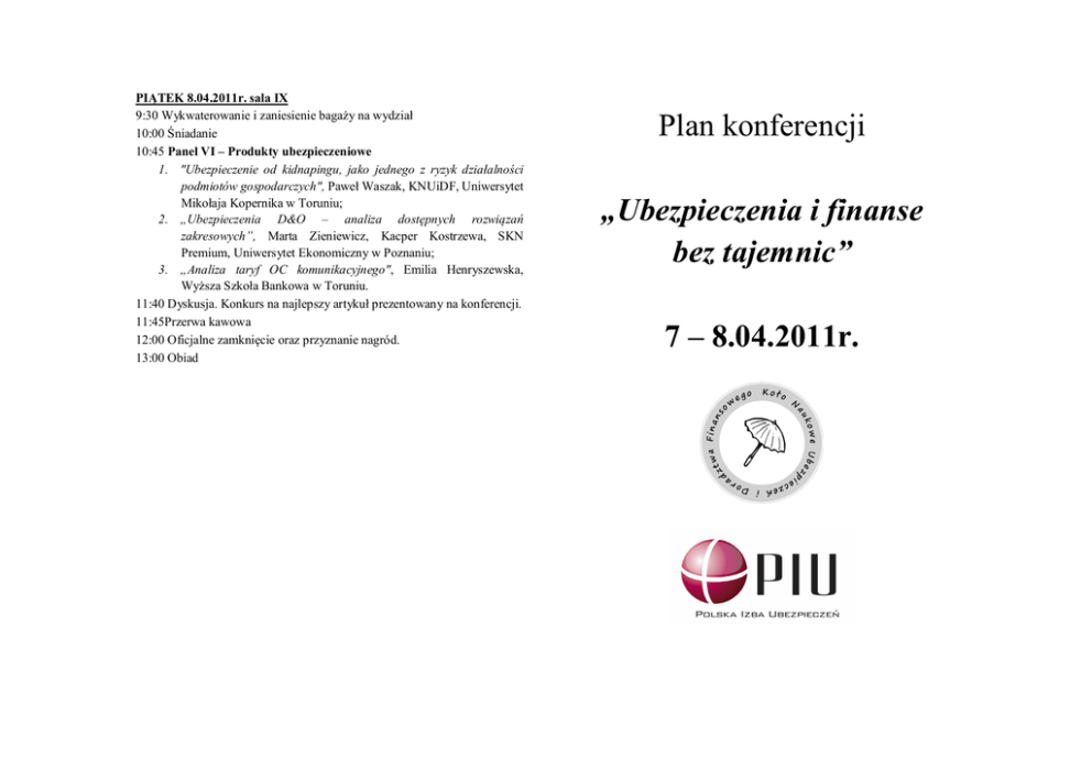PIĄTEK 8.04.2011r. sala IX 9:30 Wykwaterowanie i zaniesienie bagaży na wydział 10:00 Śniadanie 10:45 Panel VI – Produkty ubezpieczeniowe 1. "Ubezpieczenie od kidnapingu, jako jednego z ryzyk działalności podmiotów gospodarczych", Paweł Waszak, KNUiDF, Uniwersytet Mikołaja Kopernika w Toruniu; 2. „Ubezpieczenia D&O – analiza dostępnych rozwiązań zakresowych”, Marta Zieniewicz, Kacper Kostrzewa, SKN Premium, Uniwersytet Ekonomiczny w Poznaniu; 3. „Analiza taryf OC komunikacyjnego", Emilia Henryszewska, Wyższa Szkoła Bankowa w Toruniu. 11:40 Dyskusja. Konkurs na najlepszy artykuł prezentowany na konferencji. 11:45Przerwa kawowa 12:00 Oficjalne zamknięcie oraz przyznanie nagród. 13:00 Obiad Plan konferencji „Ubezpieczenia i finanse bez tajemnic” 7 – 8.04.2011r. CZWARTEK 7.04.2011 sala Rada Wydziału WNEiZ 10:00 Otwarcie konferencji przez dziekana wydziału prof. Józefa Stawickiego 10:15 Wystąpienie Dyrektora Oddziału Aviva Sp. z o.o. Piotra Domerackiego 11:15 Panel I – OFE – tykająca bomba emerytalna? 1. ”Reformy emerytalne w wybranych krajach po transformacji systemowej w obliczu kryzysu gospodarczego - przesłanki, przebieg i wnioski dla Polski”, Mariusz Kapuściński, KNUiDF, Uniwersytet Mikołaja Kopernika w Toruniu; 2. „Private Equity jako klasa aktywów w portfelach OFE”, Andrzej Paczkowski, KNUiDF, Uniwersytet Mikołaja Kopernika w Toruniu; 3. „Indywidualne konta emerytalne - założenia i realizacja”, Beata Lewicka, Studenckie Koło Naukowe Finansistów, Uniwersytet Marii Curie-Skłodowskiej w Lublinie. 12:00 Dyskusja 12:15 Przerwa kawowa 12:30 Panel II – IT w finansach i ubezpieczeniach 1. „Szacowanie indywidualnej inflacji przy użyciu oprogramowania do zarządzania finansami osobistymi”, Krzysztof Grzymała, KNUiDF, Uniwersytet Mikołaja Kopernika w Toruniu; 2. „Technologia biometryczna w działalności banku”, Agnieszka Żołądkiewicz, KNUiDF, Uniwersytet Mikołaja Kopernika w Toruniu; 3. „Świadomość studentów Uniwersytetu Marii Curie – Skłodowskiej w Lublinie na temat zabezpieczeń stosowanych w bankowości internetowej”, Katarzyna Polakowska, Studenckie Koło Naukowe Finansistów, Uniwersytet Marii Curie-Skłodowskiej w Lublinie; 4. „Sprzedaż ubezpieczeń przez Internet”, Anna Chęcińska, SKN Premium, Uniwersytet Ekonomiczny w Poznaniu. 13:30 Dyskusja 13:45 Obiad 14:30 Panel III – Systemy ubezpieczeń 1. „Różnice pomiędzy polskim a włoskim rynkiem ubezpieczeń życiowych”, Miłosz Mager, SKN Premium, Uniwersytet Ekonomiczny w Poznaniu; 2. „Solvency II – założenia i skutki dla polskich zakładów ubezpieczeń”, Dagmara Pogorzelska, Karolina Jaworska, SKN Premium, Uniwersytet Ekonomiczny w Poznaniu. 15:00 Dyskusja 15:15 Panel IV – Inwestowanie alternatywne 1. „Wino jako alternatywny sposób inwestowania kapitału”, Piotr Kordula, Studenckie Koło Naukowe Finansistów, Uniwersytet Marii Curie-Skłodowskiej w Lublinie; 2. „Alternatywne sposoby inwestowania na przykładzie inwestowania w dzieła sztuki”, Piotr Przybylski, KNUiDF, Uniwersytet Mikołaja Kopernika w Toruniu; 3. „Produkty strukturyzowane jako alternatywna forma inwestowania. Analiza na przykładzie polisy ubezpieczeniowej oraz polisy na życie z ubezpieczeniowym funduszem kapitałowym”, Agnieszka Potorska, Małgorzata Lewkowicz, Naukowe Finansów i Bankowości HOSSA, Wydział Zarządzania Uniwersytet Gdański, 16:00 Dyskusja 16:15 Przerwa kawowa 16:30 Panel V – Zarządzanie ryzykiem i underwriting 1. „Ubezpieczenia w zarządzaniu ryzykiem uprawnień do emisji gazów cieplarnianych”, Rafał Reszotarski, SKN Premium, Uniwersytet Ekonomiczny w Poznaniu; 2. „Underwriting w ubezpieczeniach mienia klientów korporacyjnych na przykładzie Wielkopolski”, Piotr Olszewski, SKN Premium, Uniwersytet Ekonomiczny w Poznaniu. 17:00 Dyskusja 17:15 Podsumowanie pierwszego dnia konferencji 17:30 Kolacja 18:00 Przejście do Domu studenckiego i zakwaterowanie 20:30 Spotkanie integracyjne w klubie Paparazzo (ul. Szczytna 2/4, Toruń)