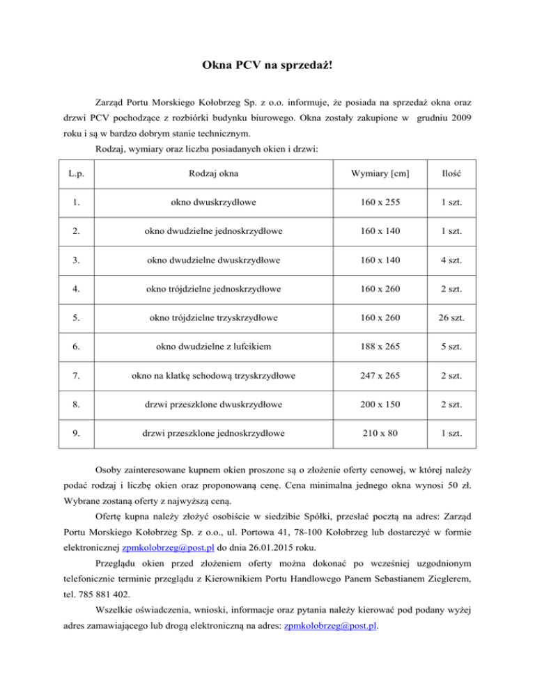 Okna PCV na sprzedaż! Zarząd Portu Morskiego Kołobrzeg Sp. z o.o. informuje, że posiada na sprzedaż okna oraz drzwi PCV pochodzące z rozbiórki budynku biurowego. Okna zostały zakupione w grudniu 2009 roku i są w bardzo dobrym stanie technicznym. Rodzaj, wymiary oraz liczba posiadanych okien i drzwi: L.p. Rodzaj okna Wymiary [cm] Ilość 1. okno dwuskrzydłowe 160 x 255 1 szt. 2. okno dwudzielne jednoskrzydłowe 160 x 140 1 szt. 3. okno dwudzielne dwuskrzydłowe 160 x 140 4 szt. 4. okno trójdzielne jednoskrzydłowe 160 x 260 2 szt. 5. okno trójdzielne trzyskrzydłowe 160 x 260 26 szt. 6. okno dwudzielne z lufcikiem 188 x 265 5 szt. 7. okno na klatkę schodową trzyskrzydłowe 247 x 265 2 szt. 8. drzwi przeszklone dwuskrzydłowe 200 x 150 2 szt. 9. drzwi przeszklone jednoskrzydłowe 210 x 80 1 szt. Osoby zainteresowane kupnem okien proszone są o złożenie oferty cenowej, w której należy podać rodzaj i liczbę okien oraz proponowaną cenę. Cena minimalna jednego okna wynosi 50 zł. Wybrane zostaną oferty z najwyższą ceną. Ofertę kupna należy złożyć osobiście w siedzibie Spółki, przesłać pocztą na adres: Zarząd Portu Morskiego Kołobrzeg Sp. z o.o., ul. Portowa 41, 78-100 Kołobrzeg lub dostarczyć w formie elektronicznej [email protected] do dnia 26.01.2015 roku. Przeglądu okien przed złożeniem oferty można dokonać po wcześniej uzgodnionym telefonicznie terminie przeglądu z Kierownikiem Portu Handlowego Panem Sebastianem Zieglerem, tel. 785 881 402. Wszelkie oświadczenia, wnioski, informacje oraz pytania należy kierować pod podany wyżej adres zamawiającego lub drogą elektroniczną na adres: [email protected].