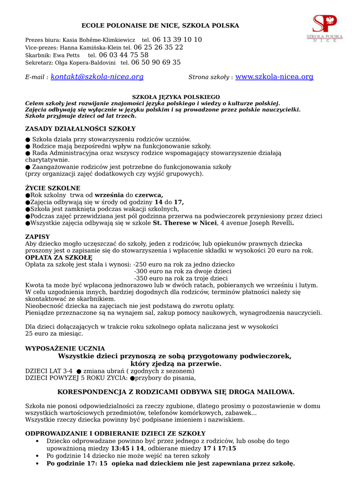 ECOLE POLONAISE DE NICE, SZKOLA POLSKA Prezes biura: Kasia Bohême-Klimkiewicz tel. 06 13 39 10 Vice-prezes: Hanna Kamińska-Klein tel. 06 25 26 35 22 Skarbnik: Ewa Petts tel. 06 03 44 75 58 Sekretarz: Olga Kopera-Baldovini tel. 06 50 90 69 35 E-mail : [email protected] 10 Strona szkoły : www.szkola-nicea.org SZKOŁA JĘZYKA POLSKIEGO Celem szkoły jest rozwijanie znajomości języka polskiego i wiedzy o kulturze polskiej. Zajęcia odbywają się wyłącznie w języku polskim i są prowadzone przez polskie nauczycielki. Szkoła przyjmuje dzieci od lat trzech. ZASADY DZIAŁALNOŚCI SZKOŁY ● Szkoła działa przy stowarzyszeniu rodziców uczniów. ● Rodzice mają bezpośredni wpływ na funkcjonowanie szkoły. ● Rada Administracyjna oraz wszyscy rodzice wspomagający stowarzyszenie działają charytatywnie. ● Zaangażowanie rodziców jest potrzebne do funkcjonowania szkoły (przy organizacji zajęć dodatkowych czy wyjść grupowych). ŻYCIE SZKOLNE ●Rok szkolny trwa od września do czerwca, ●Zajęcia odbywają się w środy od godziny 14 do 17, ●Szkoła jest zamknięta podczas wakacji szkolnych, ●Podczas zajęć przewidziana jest pól godzinna przerwa na podwieczorek przyniesiony przez dzieci ●Wszystkie zajęcia odbywają się w szkole St. Therese w Nicei, 4 avenue Joseph Revelli. ZAPISY Aby dziecko mogło uczęszczać do szkoły, jeden z rodziców, lub opiekunów prawnych dziecka proszony jest o zapisanie się do stowarzyszenia i wpłacenie składki w wysokości 20 euro na rok. OPŁATA ZA SZKOŁĘ Opłata za szkołę jest stała i wynosi: -250 euro na rok za jedno dziecko -300 euro na rok za dwoje dzieci -350 euro na rok za troje dzieci Kwota ta może być wpłacona jednorazowo lub w dwóch ratach, pobieranych we wrześniu i lutym. W celu uzgodnienia innych, bardziej dogodnych dla rodziców, terminów płatności należy się skontaktować ze skarbnikiem. Nieobecność dziecka na zajęciach nie jest podstawą do zwrotu opłaty. Pieniądze przeznaczone są na wynajem sal, zakup pomocy naukowych, wynagrodzenia nauczycieli. Dla dzieci dołączających w trakcie roku szkolnego opłata naliczana jest w wysokości 25 euro za miesiąc. WYPOSAŻENIE UCZNIA Wszystkie dzieci przynoszą ze sobą przygotowany podwieczorek, który zjedzą na przerwie. DZIECI LAT 3-4 ● zmiana ubrań ( zgodnych z sezonem) DZIECI POWYZEJ 5 ROKU ZYCIA: ●przybory do pisania, KORESPONDENCJA Z RODZICAMI ODBYWA SIĘ DROGA MAILOWA. Szkoła nie ponosi odpowiedzialności za rzeczy zgubione, dlatego prosimy o pozostawienie w domu wszystkich wartościowych przedmiotów, telefonów komórkowych, zabawek... Wszystkie rzeczy dziecka powinny być podpisane imieniem i nazwiskiem. ODPROWADZANIE I ODBIERANIE DZIECI ZE SZKOŁY Dziecko odprowadzane powinno być przez jednego z rodziców, lub osobę do tego upoważnioną miedzy 13:45 i 14, odbierane miedzy 17 i 17:15 Po godzinie 14 dziecko nie może wejść na teren szkoły Po godzinie 17: 15 opieka nad dzieckiem nie jest zapewniana przez szkołę. FORMULARZ PROSIMY WYPEŁNIAC DRUKOWANYMI LITERAMI ECOLE POLONAISE DE NICE,SZKOLA POLSKA INSCRIPTION Année scolaire 2016 / 2017 ELEVE Nom et prénom ……………………………………………………………………………………….…….. Date de naissance …………………………………………………………………………………..……… Nationalité ………………………………………………………………………………………………..….. Adresse de la famille ……………………………………………………………………............................ …………………................................................................................................................................... Téléphone ………………………………………………………………………………………..………….. Adresse email de contact ................................................................................................................. PERE Nom et prénom …………………………………………………………………………………………… Nationalité ………………………………………………………………………………………………… Profession …………………………………………………………………………………………………. Adresse du travail ………………………………………………………………………………………… Téléphone du travail ……………………………………………………………………………………… MERE Nom et prénom …………………………………………………………………………………………… Nationalité ………………………………………………………………………………………………… Profession …………………………………………………………………………………………………. Adresse du travail ………………………………………………………………………………………… Téléphone du travail ……………………………………………………………………………………… Frères et soeurs (nombre) ……………………………………………………………………………..... Personnes à joindre en cas d’absence des parents : Nom et téléphone …........................................................................................................................................ Nom et téléphone …........................................................................................................................................ Nom et téléphone …......................................................................................................................................... Personnes habilitées à v