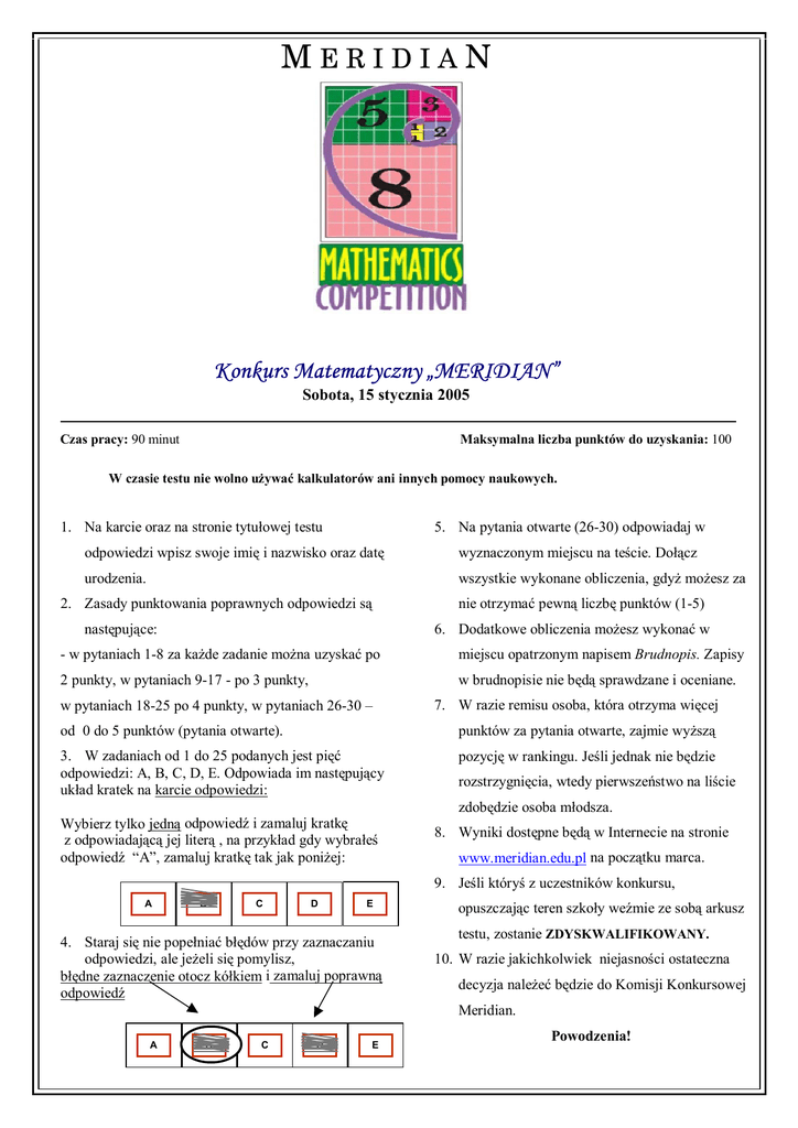 MERIDIAN Konkurs Matematyczny „MERIDIAN” Sobota, 15 stycznia 2005 Czas pracy: 90 minut Maksymalna liczba punktów do uzyskania: 100 W czasie testu nie wolno używać kalkulatorów ani innych pomocy naukowych. 5. Na pytania otwarte (26-30) odpowiadaj w 1. Na karcie oraz na stronie tytułowej testu odpowiedzi wpisz swoje imię i nazwisko oraz datę wyznaczonym miejscu na teście. Dołącz urodzenia. wszystkie wykonane obliczenia, gdyż możesz za 2. Zasady punktowania poprawnych odpowiedzi są nie otrzymać pewną liczbę punktów (1-5) 6. Dodatkowe obliczenia możesz wykonać w następujące: - w pytaniach 1-8 za każde zadanie można uzyskać po miejscu opatrzonym napisem Brudnopis. Zapisy 2 punkty, w pytaniach 9-17 - po 3 punkty, w brudnopisie nie będą sprawdzane i oceniane. w pytaniach 18-25 po 4 punkty, w pytaniach 26-30 – 7. W razie remisu osoba, która otrzyma więcej od 0 do 5 punktów (pytania otwarte). punktów za pytania otwarte, zajmie wyższą 3. W zadaniach od 1 do 25 podanych jest pięć odpowiedzi: A, B, C, D, E. Odpowiada im następujący układ kratek na karcie odpowiedzi: pozycję w rankingu. Jeśli jednak nie będzie rozstrzygnięcia, wtedy pierwszeństwo na liście zdobędzie osoba młodsza. Wybierz tylko jedną odpowiedź i zamaluj kratkę z odpowiadającą jej literą , na przykład gdy wybrałeś odpowiedź “A”, zamaluj kratkę tak jak poniżej: 8. Wyniki dostępne będą w Internecie na stronie www.meridian.edu.pl na początku marca. 9. Jeśli któryś z uczestników konkursu, A B C D E 4. Staraj się nie popełniać błędów przy zaznaczaniu odpowiedzi, ale jeżeli się pomylisz, błędne zaznaczenie otocz kółkiem i zamaluj poprawną odpowiedź opuszczając teren szkoły weźmie ze sobą arkusz testu, zostanie ZDYSKWALIFIKOWANY. 10. W razie jakichkolwiek niejasności ostateczna decyzja należeć będzie do Komisji Konkursowej Meridian. A B C D E Powodzenia! Brudnopis CZĘŚĆ I (Każde pytanie 1-8 za 2 pkt) 1. 940 – 879 =? a) 41 2. d) 71 e) 81 b) 15 c) 20 d) 25 e) 30 Jedna druga stanowi jedną trzecią szukanej liczby. Jaka to liczba? a) 1 4. c) 61 Jeśli kopiarka w ciągu minuty wykonuje 150 kopii to ile kopii wykona w ciągu 10 sekund? a) 10 3. b) 51 b) 1 2 c) 1 3 d) 2 3 e) 3 2 Jeżeli „►” oznacza następującą operację matematyczną: x ► y = x - y + 2xy , to ile wyniesie a jeśli: 5 ► a = 2 ► 4 a) 0 5. b) 1 c) 2 d) 4 e) 6 W pogodny dzień dźwięk pokonuje 335 metrów w ciągu sekundy. Paulina, stojąc na szczycie klifu, wydaje okrzyk w kierunku doliny i spostrzega, że jego echo powraca po 6 sekundach. Jak daleko jest dolina? a) 335m b) 670m c) 1005m d) 2010m e) 2345m Brudnopis 6. Jeżeli x = -0,13 , y = -0,135 , z = -0,1035 to które wyrażenie jest prawdziwe? a) x<y<z 7. b) z<y<x c) y<x<z d) y<z<x e) x<z<y Rysunek przedstawia zacieniowany prostokąt wpisany w równoległobok. Ile wynosi pole tego prostokąta? 3 cm a) 12 b) 20 c) 24 d) 32 e) 36 4 cm 8 cm 8. Jeśli na jednej szalce wagi umieścisz 1 kostkę mydła a na drugiej 3/4 kostki mydła oraz 3/4 kg odważnik to szalki pozostaną w równowadze. Ile waży kostka mydła? a) 1 kg b) 2 kg c) 3 kg d) 4 kg e) 8 kg 3 Brudnopis CZĘŚĆ II (Każde pytanie 9-17 za 3 pkt) 9. Pewnemu człowiekowi, gdy w jedną stronę jedzie na rowerze, a spowrotem idzie na piechotę, droga do pracy zabiera półtorej godziny. Jeśli w obie strony jedzie na rowerze wtedy droga ta trwa 30 minut. W jakim czasie pokonałby trasę idąc w obie strony piechotą? a) 2 godz. b) 2 ½ godz. c) 2 ¼ godz. 10. 1 − a) -3 2 2 2 2− 2 b) -1 d) 3 godz. e) 3 ½ godz. =? c) 1 d) 2 e) 3 2 11. Promień opony samochodowej wynosi 30 cm. Ile obrotów wykonuje koło jeśli wiadomo, że samochód pokonał dystans 90 km? (Przyjmij, że π = 3) a) 45000 b) 48000 c) 50000 d) 51000 e)53000 12. Gdy pewną liczbę zmniejszymy o 7, a resztę pomnożymy przez 7 to wynik będzie taki sam jak byśmy tę samą liczbę zmniejszyli o 11 i resztę pomnożyli przez 11. Jaka to liczba? a) 20 b) 19 c) 18 d) 17 e) 16 4 Brudnopis 13. 1 − [a + 1 − [a + 2 − (a + 3)]] − 3a = 11 , znajdź a=? a) -7 b) -1 c) -3 d) 3 e) 7 14. Budzik późni się 4 minuty w ciągu jednej godziny. Został on ustawiony 3½ godziny temu. W tej chwili inny zegar, który działa prawidłowo, wskazuje południe. Za ile minut budzik wskaże południe? a) około 9 min b) około 10 min d) około 14 min c) około 12min e) około 15 min 15. Najpopularniejszą przeglądarką jest obecnie www.google.com. Wszystkie zasoby Internetu są nieustannie zgrywane na komputery Google, gdzie są gromadzone, katalogowane i przygotowywane do przeszukiwania. Katalog Google jest największym katalogiem na świecie i zawiera zbiór 3 miliardów stron internetowych, przeszukiwanych w czasie krótszym niż pół sekundy. Jeśli te 3 miliardy stron wydrukowalibyśmy po czym ułożyli w stos to jaka byłaby wysokość tego stosu w kilometrach. Zakładamy, że każda strona mieści się na kartce formatu A4 (Grubość jednej kartki wynosi w przybliżeniu 0,1mm) a) 0.3km 16. a) -1 1 + 2 b) 3km 1 1+ b) − c) 30km d) 300km e) 3000km = 1, x=? 3 2− 1 x 1 2 c) 1 d) 2 e) 3 5 Brudnopis 17. Z każdym użyciem kostka mydła zmniejsza swoją objętość o 10%. Jaka jest najmniejsza liczba użyć, po których zostanie mniej niż połowa kostki? a) 5 b) 6 c) 7 d) 8 e) 9 CZĘŚĆ III (Każde pytanie 18-25 za 4 pkt) 18. Dziesięć osób postanowiło założyć klub. Gdyby w grupie tej było pięć osób więcej wtedy wydatki przypadające na jednego członka byłyby o 1000 zł mniejsze. Jaki był początkowy koszt przypadający na jedną osobę? a) 3000 zł b) 5000 zł c) 7000 zł d) 8000 zł e) 9000 zł 19. Marcin ma 1.35 zł w monetach 10 i 5 groszowych. W sumie posiada 15 monet. Ile monet każdego rodzaju posiada Marcin? 10 gr 5 gr (a) 10 5 (b) 11 4 (c) 12 3 (d) 13 2 (e) 14 1 6 Brudnopis 20. Pociąg jadący z prędkością 45 km/godz. spotyka, pociąg jadący w przeciwną stronę z prędkością 