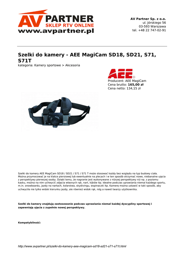 AV Partner Sp. z o.o. ul. Jórskiego 56 03-593 Warszawa tel. +48 22 747-02-91 Szelki do kamery - AEE MagiCam SD18, SD21, S71, S71T kategoria: Kamery sportowe > Akcesoria Producent: AEE MagiCam Cena brutto: 165,00 zł Cena netto: 134,15 zł Szelki do kamery AEE MagiCam SD18 / SD21 / S71 / S71 T może stosować każdy bez względu na typ budowy ciała. Można przymocować je na klatce piersiowej lub ewentualnie na plecach i w ten sposób otrzymać nowe, niebanalne ujęcia z perspektywy pierwszej osoby. Dzięki temu, że nagranie jest wykonywane z niższej perspektywy niż np. z poziomu kasku, można na nim uchwycić zdjęcia własnych rąk, nart, kijków itp. Idealne podczas uprawiania niemal każdego sportu, m.in. snowboardu, jazdy na nartach, kolarstwa, skydivingu, wspinaczki itp. Kamerę można ustawić w taki sposób, aby uchwyciła nie tylko widok kierunku jazdy, ale również widok rąk, nóg a nawet twarzy użytkownika. Szelki do kamery znajdują zastosowanie podczas uprawiania niemal każdej dyscypliny sportowej i zapewniają ujęcia z zupełnie nowej perspektywy. Kompatybilność: http://www.avpartner.pl/szelki-do-kamery-aee-magicam-sd18-sd21-s71-s71t.html AEE MagiCam SD18, SD21, S71, S71T inne popularne kamery sportowe (np. GoPro) http://www.avpartner.pl/szelki-do-kamery-aee-magicam-sd18-sd21-s71-s71t.html