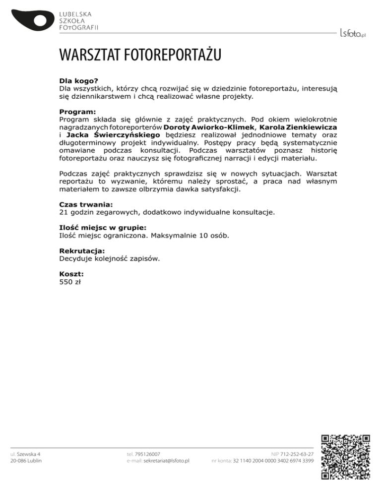 WARSZTAT FOTOREPORTAŻU Dla kogo? Dla wszystkich, którzy chcą rozwijać się w dziedzinie fotoreportażu, interesują się dziennikarstwem i chcą realizować własne projekty. Program: Program składa się głównie z zajęć praktycznych. Pod okiem wielokrotnie nagradzanych fotoreporterów Doroty Awiorko-Klimek, Karola Zienkiewicza i Jacka Świerczyńskiego będziesz realizował jednodniowe tematy oraz długoterminowy projekt indywidualny. Postępy pracy będą systematycznie omawiane podczas konsultacji. Podczas warsztatów poznasz historię fotoreportażu oraz nauczysz się fotograficznej narracji i edycji materiału. Podczas zajęć praktycznych sprawdzisz się w nowych sytuacjach. Warsztat reportażu to wyzwanie, któremu należy sprostać, a praca nad własnym materiałem to zawsze olbrzymia dawka satysfakcji. Czas trwania: 21 godzin zegarowych, dodatkowo indywidualne konsultacje. Ilość miejsc w grupie: Ilość miejsc ograniczona. Maksymalnie 10 osób. Rekrutacja: Decyduje kolejność zapisów. Koszt: 550 zł ul. Szewska 4 20-086 Lublin tel. 795126007 e-mail: [email protected] NIP 712-252-63-27 nr konta: 32 1140 2004 0000 3402 6974 3399 WARSZTAT FOTOREPORTAŻU Szczegółowy program zajęć: Zajęcia teoretyczne: -- Historia i mistrzowie reportażu fotograficznego -- Rodzaje fotoreportażu: street photo, fotografia prasowa, eseje fotograficzne -- Fotografia reportażowa a fotografia dokumentalna -- Aspekty techniczne w fotoreportażu – dobór sprzętu, znaczenie ogniskowej obiektywu -- Reportaż a estetyzacja obrazu – znaczenie takich walorów jak ziarno, kompozycja, gra światła -- Kompozycja i plany zdjęciowe w reportażu -- Zdjęcia pojedyncze a narracje wielozdjęciowe -- Konstrukcja dramaturgiczna i budowa pełnego fotoreportażu -- Analiza wykonywanych prac -- Edycja własnego materiału zdjęciowego – selekcja i kolejność zdjęć -- Sposób poszukiwania tematów do zdjęć -- Rynek prasowy i promocja własnej twórczości Zajęcia praktyczne: -- Praca nad zadanymi tematami jednodniowymi oraz nad jednym długoterminowym projektem -- Bieżąca analiza wykonanych fotografii -- Ocena postępów i kierowanie rozwojem uczestników ul. Szewska 4 20-086 Lublin tel. 795126007 e-mail: [email protected] NIP 712-252-63-27 nr konta: 32 1140 2004 0000 3402 6974 3399