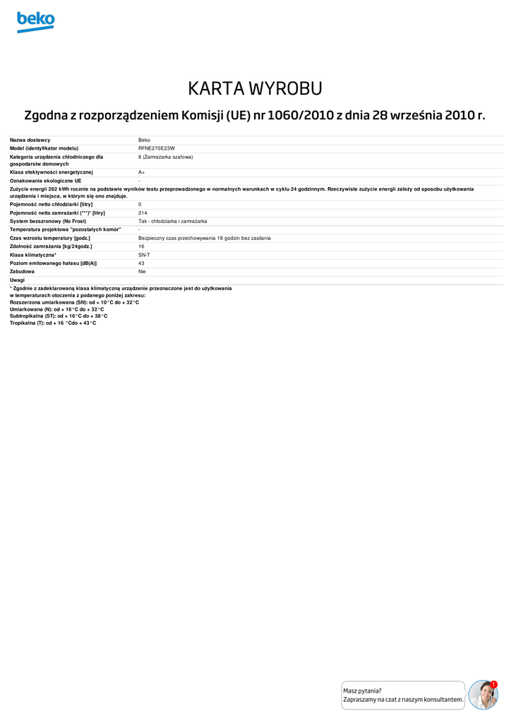 KARTA WYROBU Zgodna z rozporządzeniem Komisji (UE) nr 1060/2010 z dnia 28 września 2010 r. Nazwa dostawcy Beko Model (identyfikator modelu) RFNE270E23W Kategoria urządzenia chłodniczego dla gospodarstw domowych 8 (Zamrażarka szafowa) Klasa efektywności energetycznej A+ Oznakowanie ekologiczne UE - Zużycie energii 282 kWh rocznie na podstawie wyników testu przeprowadzonego w normalnych warunkach w cyklu 24 godzinnym. Rzeczywiste zużycie energii zależy od sposobu użytkowania urządzenia i miejsca, w którym się ono znajduje. Pojemność netto chłodziarki [litry] 0 Pojemność netto zamrażarki (***)* [litry] 214 System bezszronowy (No Frost) Tak - chłodziarka i zamrażarka Temperatura projektowa "pozostałych komór" - Czas wzrostu temperatury [godz.] Bezpieczny czas przechowywania 18 godzin bez zasilania Zdolność zamrażania [kg/24godz.] 16 Klasa klimatyczna* SN-T Poziom emitowanego hałasu [dB(A)] 43 Zabudowa Nie Uwagi * Zgodnie z zadeklarowaną klasa klimatyczną urządzenie przeznaczone jest do użytkowania w temperaturach otoczenia z podanego poniżej zakresu: Rozszerzona umiarkowana (SN): od + 10°C do + 32°C Umiarkowana (N): od + 16°C do + 32°C Subtropikalna (ST): od + 16°C do + 38°C Tropikalna (T): od + 16 °Cdo + 43°C Masz pytania? Zapraszamy na czat z naszym konsultantem. 1