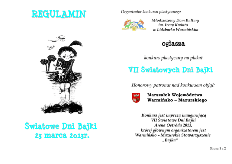 Organizator konkursu plastycznego Młodzieżowy Dom Kultury im. Ireny Kwinto w Lidzbarku Warmińskim konkurs plastyczny na plakat Honorowy patronat nad konkursem objął: Marszałek Województwa Warmińsko – Mazurskiego Konkurs jest imprezą inaugurującą VII Światowe Dni Bajki Arena Ostróda 2013, której głównym organizatorem jest Warmińsko – Mazurskie Stowarzyszenie „Bajka” Strona 1 z 2 Mija już siódmy rok odkąd zachęcamy Was do uczestnictwa w naszym konkursie plastycznym na plakat. Zapraszamy wszystkich młodych artystów pędzla, kredki, pióra, myszki i innych akcesoriów wspomagających artystyczne dusze do podjęcia wyzwania. Niech polem Waszych twórczych działań będzie kartka papieru i puszczone wolno wodze bajkowej fantazji. Życzymy sukcesów Zasady uczestnictwa uczestnikami konkursu mogą być dzieci i młodzież od 5 do 19 lat; technika dowolna (bez prac wykonanych z materiałów sypkich i spożywczych); format prac nie większy niż A3 (duży blok); rysunek wykonany grafiką komputerową – format A4; prace rolowane, składane nie będą brane pod uwagę; nie należy oprawiać prac w passe-partout; komisja dokona wyboru jednego najciekawszego plakatu, który zostanie wydrukowany jako plakat imprezy oraz 5 wyróżnień; do wystawy kwalifikowanych jest 10 najciekawszych prac; autor nagrodzonej pracy oraz osoby wyróżnione otrzymają dyplomy i atrakcyjne nagrody. Informacje dodatkowe termin nadsyłania prac na konkurs: prace wykonane zgodnie z regulaminem należy dostarczyć do dnia 22.02.2013r. na adres: Młodzieżowy Dom Kultury im. Ireny Kwinto ul. Poniatowskiego 3 11-100 Lidzbark Warmiński przesłane prace przechodzą na własność organizatora; organizatorzy zastrzegają sobie prawo publikowania i reprodukowania prac konkursowych bez wypłacania honorariów autorskich; informacje o konkursie dostępne są na stronie internetowej www.mdklw.pl ; nieodebrane nagrody będą wysyłane na życzenie i koszt nagrodzonego; udział w konkursie jest równoznaczny z akceptacją Regulaminu oraz wyrażeniem zgody na przetwarzanie danych osobowych uczestnika przez Organizatora do celów organizacyjnych i promocyjnych konkursu. Uroczyste zakończenie konkursu połączone z wystawą prac oraz wręczeniem laureatom atrakcyjnych nagród odbędzie się w Warmińskiej Galerii Młodego Artysty w Młodzieżowym Domu Kultury w Lidzbarku Warmińskim 23 marca 2013r. o godz. 1100 Strona 2 z 2