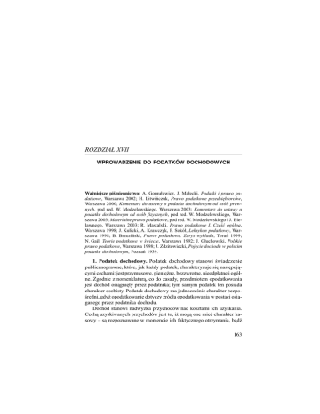 ROZDZIA£ XVII WPROWADZENIE DO PODATKÓW DOCHODOWYCH Wa¿niejsze pimiennictwo: A. Gomu³owicz, J. Ma³ecki, Podatki i prawo podatkowe, Warszawa 2002; H. Litwiñczuk, Prawo podatkowe przedsiêbiorców, Warszawa 2000; Komentarz do ustawy o podatku dochodowym od osób prawnych, pod red. W. Modzelewskiego, Warszawa 2003; Komentarz do ustawy o podatku dochodowym od osób fizycznych, pod red. W. Modzelewskiego, Warszawa 2003; Materialne prawo podatkowe, pod red. W. Modzelewskiego i J. Bielawnego, Warszawa 2003; R. Mastalski, Prawo podatkowe I. Czêæ ogólna, Warszawa 1998; J. Kulicki, A. Krawczyk, P. Sokó³, Leksykon podatkowy, Warszawa 1998; B. Brzeziñski, Prawo podatkowe. Zarys wyk³adu, Toruñ 1999; N. Gajl, Teorie podatkowe w wiecie, Warszawa 1992; J. G³uchowski, Polskie prawo podatkowe, Warszawa 1998; J. Zdzitowiecki, Pojêcie dochodu w polskim podatku dochodowym, Poznañ 1939. 1. Podatek dochodowy. Podatek dochodowy stanowi wiadczenie publicznoprawne, które, jak ka¿dy podatek, charakteryzuje siê nastêpuj¹cymi cechami: jest przymusowe, pieniê¿ne, bezzwrotne, nieodp³atne i ogólne. Zgodnie z nomenklatur¹, co do zasady, przedmiotem opodatkowania jest dochód osi¹gniêty przez podatnika; tym samym podatek ten posiada charakter osobisty. Podatek dochodowy ma jednoczenie charakter bezporedni, gdy¿ opodatkowanie dotyczy ród³a opodatkowania w postaci osi¹ganego przez podatnika dochodu. Dochód stanowi nadwy¿ka przychodów nad kosztami ich uzyskania. Cech¹ uzyskiwanych przychodów jest to, i¿ mog¹ one mieæ charakter kasowy s¹ rozpoznawane w momencie ich faktycznego otrzymania, b¹d 163 memoria³owy rozpoznawane w chwili, kiedy staj¹ siê nale¿ne, niezale¿nie od ich otrzymania. Ostateczna wysokoæ dochodu za dany rok podatkowy, stanowi¹cego podstawê opodatkowania, jest uzale¿niona od nastêpuj¹cych elementów: wydatków nie stanowi¹cych kosztów uzyskania przychodów (zwiêkszaj¹ podstawê opodatkowania); fakultatywnych ulg (pomniejszaj¹ podstawê opodatkowania b¹d nale¿ny podatek po spe³nieniu cis³ych uwarunkowañ); zwolnieñ dochodu od podatku o charakterze podmiotowym; ewentualnej straty (strat) z poprzednich lat podatkowych, pomniejszaj¹cej dochód danego roku podatkowego w ustawowych granicach. Dla potrzeb okrelenia przedmiotu i podstawy opodatkowania kumulowany jest ogó³ opodatkowanych przychodów i ogó³ kosztów ich uzyskania. Od tej zasady przewidziane s¹ okrelone wyj¹tki (opodatkowanie indywidualne), polegaj¹ce na odrêbnym opodatkowaniu dochodów (przychodów), których nie ³¹czy siê z pozosta³ymi kumulowanymi dochodami (przychodami) z innych róde³. Przyk³adem takiego opodatkowania jest np. opodatkowanie dywidend lub odsetek od po¿yczek. Funkcjonuj¹ca w polskim systemie prawa podatkowego ustawa o podatku dochodowym od osób fizycznych przewiduje, i¿ nie stosuje siê jej przepisów do: 1) przychodów z dzia³alnoci rolniczej, z wyj¹tkiem przychodów z dzia³ów specjalnych produkcji rolnej, 2) przychodów z gospodarki lenej w rozumieniu ustawy o lasach oraz ustawy o przeznaczeniu gruntów rolnych do zalesienia, 3) przychodów podlegaj¹cych przepisom o podatku od spadków i darowizn, 4) przychodów wynikaj¹cych z czynnoci, które nie mog¹ byæ przedmiotem prawnie skutecznej umowy, 5) przychodów z tytu³u podzia³u wspólnego maj¹tku ma³¿onków w wyniku ustania lub ograniczenia ma³¿eñskiej wspólnoci maj¹tkowej. Z kolei w zakresie podatku dochodowego od osób prawnych wy³¹czenia dotycz¹: 1) przychodów z dzia³alnoci rolniczej, z wyj¹tkiem dochodów z dzia³ów specjalnych produkcji rolnej, chyba ¿e ustalenie przychodów jest wymagane dla celów okrelenia dochodów wolnych od podatku dochodowego, 2) przychodów z gospodarki lenej w rozumieniu ustawy o lasach, 3) przychodów wynikaj¹cych z czynnoci, które nie mog¹ byæ przedmiotem prawnie skutecznej umowy. 164 Ustawy podatkowe zawieraj¹ szereg zwolnieñ dochodu od opodatkowania zarówno o charakterze podmiotowym, jak i przedmiotowym. W polskim prawie podatkowym wyró¿nia siê tak¿e specyficzne formy opodatkowania, w których przedmiotem opodatkowania nie jest dochód rozumiany jako nadwy¿ka sumy osi¹gniêtych przychodów nad kosztami ich uzyskania. Szczególn¹ konstrukcjê prawnopodatkow¹ stanowi opodatkowanie w postaci rycza³tu od przychodów ewidencjonowanych, w którym nie wystêpuj¹ koszty uzyskania przychodów. Rycza³towe stawki procentowe odnosz¹ siê wy³¹cznie do kategorii osi¹gniêtych przychodów. Odmienne rozwi¹zanie stanowi opodatkowanie w formie karty podatkowej, które przewiduje opodatkowanie wed³ug stawek kwotowych. W tym przypadku kategorie przychodów, kosztów ich uzyskania oraz dochodu nie wystêpuj¹ (analogiczne zasady opodatkowania odnosz¹ siê do osób pe³ni¹cych funkcje duszpasterskie wysokoæ nale¿nego rycza³tu uzale¿niona jest od liczby mieszkañców w danej parafii). 2. Przychody. Opodatkowanie podatkiem dochodowym odnosi siê do dochodów osi¹gniêtych ze róde³ przychodów, z wyj¹tkiem tych przychodów, które ustawodawca wy³¹cza z zakresu opodatkowania podatkiem dochodowym. W zakresie polskiego podatku dochodowego od osób fizycznych ród³a przychodów s¹ sklasyfikowane rodzajowo (art. 10 ust. 1), przy czym lista ta nie ma charakteru zamkniêtego, bowiem ustawodawca przewiduje opodatkowanie dochodów uzyskanych z tzw. innych róde³ (art. 10 ust. 1 pkt 9), których definicja w ustawie ma charakter otwarty. I tak, zgodnie z ustaw¹ o podatku dochodowym od osób fizycznych, wyró¿nia siê nastêpuj¹ce ród³a przychodów: 1) stosunek s³u¿bowy, stosunek pracy, w tym spó³dzielczy stosunek pracy, cz³onkostwo w rolniczej spó³dzielni produkcyjnej lub innej spó³dzielni zajmuj¹cej siê produkcj¹ roln¹, praca nak³adcza, emerytura lub renta, 2) dzia³alnoæ wykonywana osobicie, 3) pozarolnicza dzia³alnoæ gospodarcza, 4) dzia³y specjalne produkcji rolnej, 5) nieruchomoci lub ich czêci, 6) najem, podnaj