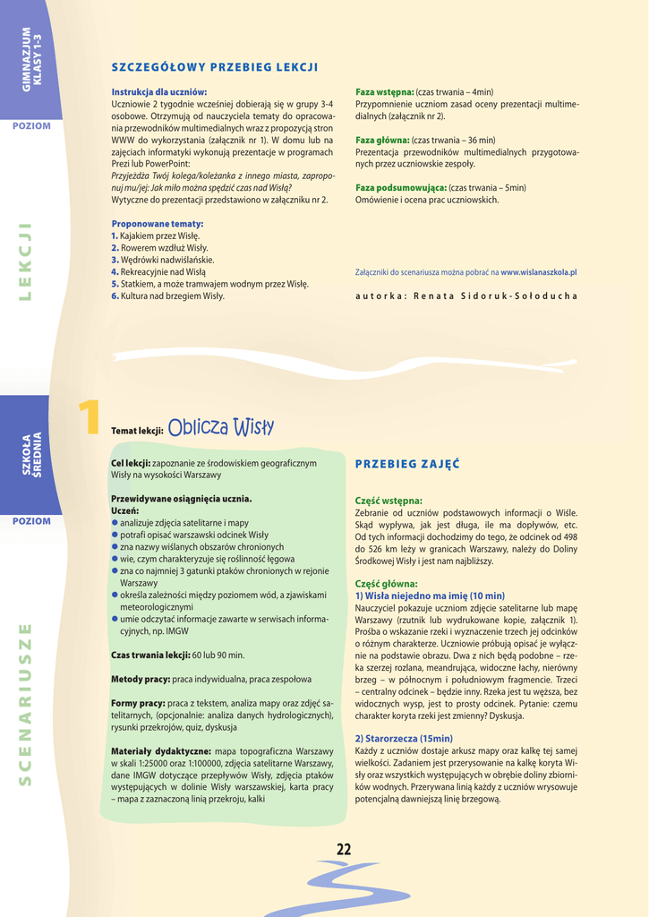 GIMNAZJUM KLASy 1-3 S ZC Z E G ó ŁO W y P R Z E b I E G L E KC J I POZIOM Faza główna: (czas trwania – 36 min) Prezentacja przewodników multimedialnych przygotowanych przez uczniowskie zespoły. Faza podsumowująca: (czas trwania – 5min) Omówienie i ocena prac uczniowskich. Proponowane tematy: 1. Kajakiem przez Wisłę. 2. Rowerem wzdłuż Wisły. 3. Wędrówki nadwiślańskie. 4. Rekreacyjnie nad Wisłą 5. Statkiem, a może tramwajem wodnym przez Wisłę. 6. Kultura nad brzegiem Wisły. LEKCJI SZKOŁA ŚREDNIA SCENARIUSZE POZIOM Faza wstępna: (czas trwania – 4min) Przypomnienie uczniom zasad oceny prezentacji multimedialnych (załącznik nr 2). Instrukcja dla uczniów: Uczniowie 2 tygodnie wcześniej dobierają się w grupy 3-4 osobowe. Otrzymują od nauczyciela tematy do opracowania przewodników multimedialnych wraz z propozycją stron WWW do wykorzystania (załącznik nr 1). W domu lub na zajęciach informatyki wykonują prezentacje w programach Prezi lub PowerPoint: Przyjeżdża Twój kolega/koleżanka z innego miasta, zaproponuj mu/jej: Jak miło można spędzić czas nad Wisłą? Wytyczne do prezentacji przedstawiono w załączniku nr 2. 1 Załączniki do scenariusza można pobrać na www.wislanaszkola.pl autorka: Renata Sidoruk-Sołoducha Oblicza Wisły Temat lekcji: Cel lekcji: zapoznanie ze środowiskiem geograficznym Wisły na wysokości Warszawy PRZEbIEG ZAJęć Przewidywane osiągnięcia ucznia. Uczeń: l analizuje zdjęcia satelitarne i mapy l potrafi opisać warszawski odcinek Wisły l zna nazwy wiślanych obszarów chronionych l wie, czym charakteryzuje się roślinność łęgowa l zna co najmniej 3 gatunki ptaków chronionych w rejonie Warszawy l określa zależności między poziomem wód, a zjawiskami meteorologicznymi l umie odczytać informacje zawarte w serwisach informacyjnych, np. IMGW Część wstępna: Zebranie od uczniów podstawowych informacji o Wiśle. Skąd wypływa, jak jest długa, ile ma dopływów, etc. Od tych informacji dochodzimy do tego, że odcinek od 498 do 526 km leży w granicach Warszawy, należy do Doliny Środkowej Wisły i jest nam najbliższy. Część główna: 1) Wisła niejedno ma imię (10 min) Nauczyciel pokazuje uczniom zdjęcie satelitarne lub mapę Warszawy (rzutnik lub wydrukowane kopie, załącznik 1). Prośba o wskazanie rzeki i wyznaczenie trzech jej odcinków o różnym charakterze. Uczniowie próbują opisać je wyłącznie na podstawie obrazu. Dwa z nich będą podobne – rzeka szerzej rozlana, meandrująca, widoczne łachy, nierówny brzeg – w północnym i południowym fragmencie. Trzeci – centralny odcinek – będzie inny. Rzeka jest tu węższa, bez widocznych wysp, jest to prosty odcinek. Pytanie: czemu charakter koryta rzeki jest zmienny? Dyskusja. Czas trwania lekcji: 60 lub 90 min. Metody pracy: praca indywidualna, praca zespołowa Formy pracy: praca z tekstem, analiza mapy oraz zdjęć satelitarnych, (opcjonalnie: analiza danych hydrologicznych), rysunki przekrojów, quiz, dyskusja 2) Starorzecza (15min) Materiały dydaktyczne: mapa topograficzna Warszawy w skali 1:25000 oraz 1:100000, zdjęcia satelitarne Warszawy, dane IMGW dotyczące przepływów Wisły, zdjęcia ptaków występujących w dolinie Wisły warszawskiej, karta pracy – mapa z zaznaczoną linią przekroju, kalki Każdy z uczniów dostaje arkusz mapy oraz kalkę tej samej wielkości. Zadaniem jest przerysowanie na kalkę koryta Wisły oraz wszystkich występujących w obrębie doliny zbiorników wodnych. Przerywana linią każdy z uczniów wrysowuje potencjalną dawniejszą linię brzegową. 22 5) Ile wody w Wiśle? (20min) SZKOŁA ŚREDNIA pospolitej, rybitwy białoczelnej, sieweczki obrożnej, sieweczki rzecznej, rybitwy rzecznej, ale również wielu innych gatunków ptaków wodnych. Dolina Wisły od Dęblina do Płocka należy również do europejskiej sieci ekologicznej Natura 2000. Obszary objęte ochroną charakteryzuje również roślinność łęgowa. Wisła jest rzeką meandrującą. Na obszarze, gdzie jej bieg nie został uregulowany, układ koryta na bieżąco się zmienia. Nurt nanosi nowe pokłady materiału akumulacyjnego i jednocześnie podcina coraz bardziej drugi brzeg. Z czasem zakola zostają odcięte od głównego koryta. Podłużne jeziora w obrębie doliny rzeki są dowodem na inny przebieg koryta w przeszłości. W Warszawie występuje kilka takich starorzeczy: na prawym brzegu są to jeziora Sporne i Żabie na wawerskich Zbytkach, Jezioro Gocławskie, Jezioro Kamionkowskie w Parku Skaryszewskim, na lewym brzegu to jeziora Powsinkowskie, Wilanowskie oraz Czerniakowskie. POZIOM 3) Czym w zasadzie jest dolina? (20min) Odcinek centralny. Na podstawie fragmentu mapy każdy wykonuje przekrój doliny (załącznik 2) – powinna nam wyjść wyraźnie zaznaczona skarpa na lewym brzegu i o wiele niższy brzeg prawy. Wspólne omówienie rysunków. Czy patrząc na mapę fizyczną Polski można odpowiedzieć na pytanie, skąd ta asymetria? Jakie to miało dawniej, a jakie ma dziś znaczenie dla osadnictwa? Badania poziomu wody przeprowadza Instytut Meteorologii i Gospodarki Wodnej. W Warszawie są dwa punkty pomiarowe: Warszawa – Nadwilanówka i Warszawa – Port Praski. Codziennie w serwisie IMGW podawane są między innymi takie dane, jak stan wody (w cm) oraz przepływ wody (w cm3/s). Dane całoroczne publikowane są w roczniku hydrologicznym. Przyjmuje się, że średnia wartość przepływu wody w Warszawie to 600 cm3/s, wartości w okolicach 100cm3/s uznawane są za stany niskiej wody, powyżej 3000 cm3/s jako powódź. Stan alarmowy to wg IMGW 650 cm W Porcie Praskim i 800 cm w punkcie Nadwilanówka. Największe powodzie ostatnich lat to te z 1997 r. (650 cm), 2001 r. (705 cm), 2010 r.(780 cm). Warszawa leży na obszarze dwóch głównych jednostek geomorfologicznych. Są to Równina (Wysoczyzna) Warszawska oraz Równina Wołomińska powstałe w wyniku działalności akumulacyjnej lądolodu podczas zlodowacenia 