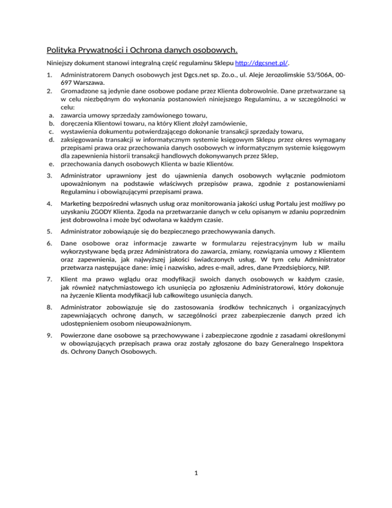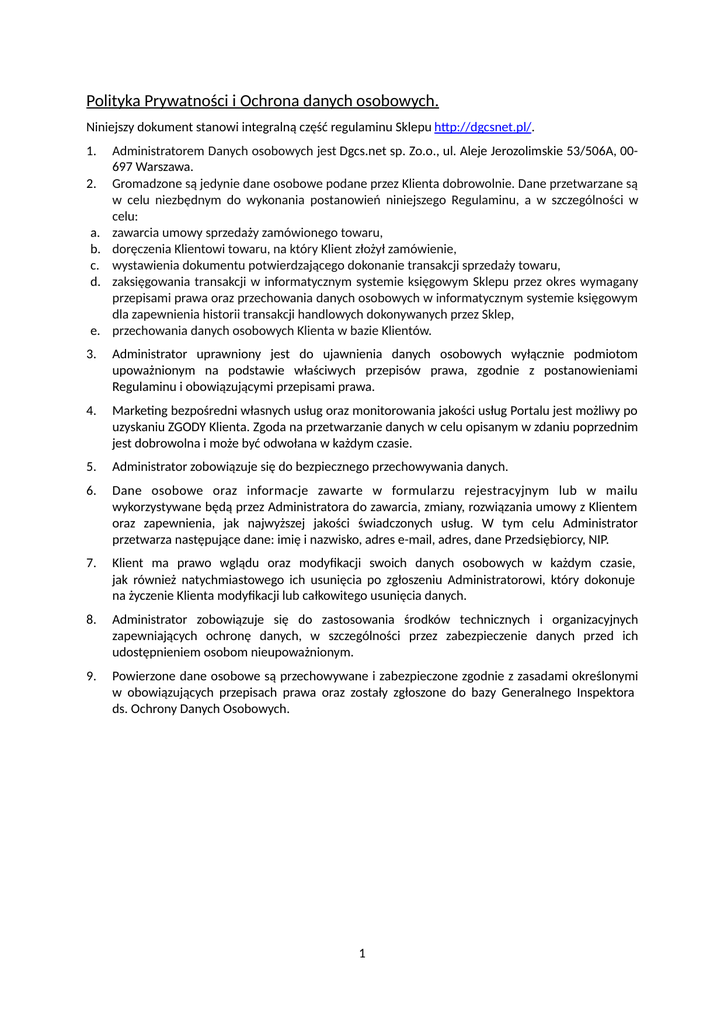 Polityka Prywatności i Ochrona danych osobowych. Niniejszy dokument stanowi integralną część regulaminu Sklepu http://dgcsnet.pl/. 1. 2. a. b. c. d. e. Administratorem Danych osobowych jest Dgcs.net sp. Zo.o., ul. Aleje Jerozolimskie 53/506A, 00697 Warszawa. Gromadzone są jedynie dane osobowe podane przez Klienta dobrowolnie. Dane przetwarzane są w celu niezbędnym do wykonania postanowień niniejszego Regulaminu, a w szczególności w celu: zawarcia umowy sprzedaży zamówionego towaru, doręczenia Klientowi towaru, na który Klient złożył zamówienie, wystawienia dokumentu potwierdzającego dokonanie transakcji sprzedaży towaru, zaksięgowania transakcji w informatycznym systemie księgowym Sklepu przez okres wymagany przepisami prawa oraz przechowania danych osobowych w informatycznym systemie księgowym dla zapewnienia historii transakcji handlowych dokonywanych przez Sklep, przechowania danych osobowych Klienta w bazie Klientów. 3. Administrator uprawniony jest do ujawnienia danych osobowych wyłącznie podmiotom upoważnionym na podstawie właściwych przepisów prawa, zgodnie z postanowieniami Regulaminu i obowiązującymi przepisami prawa. 4. Marketing bezpośredni własnych usług oraz monitorowania jakości usług Portalu jest możliwy po uzyskaniu ZGODY Klienta. Zgoda na przetwarzanie danych w celu opisanym w zdaniu poprzednim jest dobrowolna i może być odwołana w każdym czasie. 5. Administrator zobowiązuje się do bezpiecznego przechowywania danych. 6. Dane osobowe oraz informacje zawarte w formularzu rejestracyjnym lub w mailu wykorzystywane będą przez Administratora do zawarcia, zmiany, rozwiązania umowy z Klientem oraz zapewnienia, jak najwyższej jakości świadczonych usług. W tym celu Administrator przetwarza następujące dane: imię i nazwisko, adres e-mail, adres, dane Przedsiębiorcy, NIP. 7. Klient ma prawo wglądu oraz modyfikacji swoich danych osobowych w każdym czasie, jak również natychmiastowego ich usunięcia po zgłoszeniu Administratorowi, który dokonuje na życzenie Klienta modyfikacji lub całkowitego usunięcia danych. 8. Administrator zobowiązuje się do zastosowania środków technicznych i organizacyjnych zapewniających ochronę danych, w szczególności przez zabezpieczenie danych przed ich udostępnieniem osobom nieupoważnionym. 9. Powierzone dane osobowe są przechowywane i zabezpieczone zgodnie z zasadami określonymi w obowiązujących przepisach prawa oraz zostały zgłoszone do bazy Generalnego Inspektora ds. Ochrony Danych Osobowych. 1