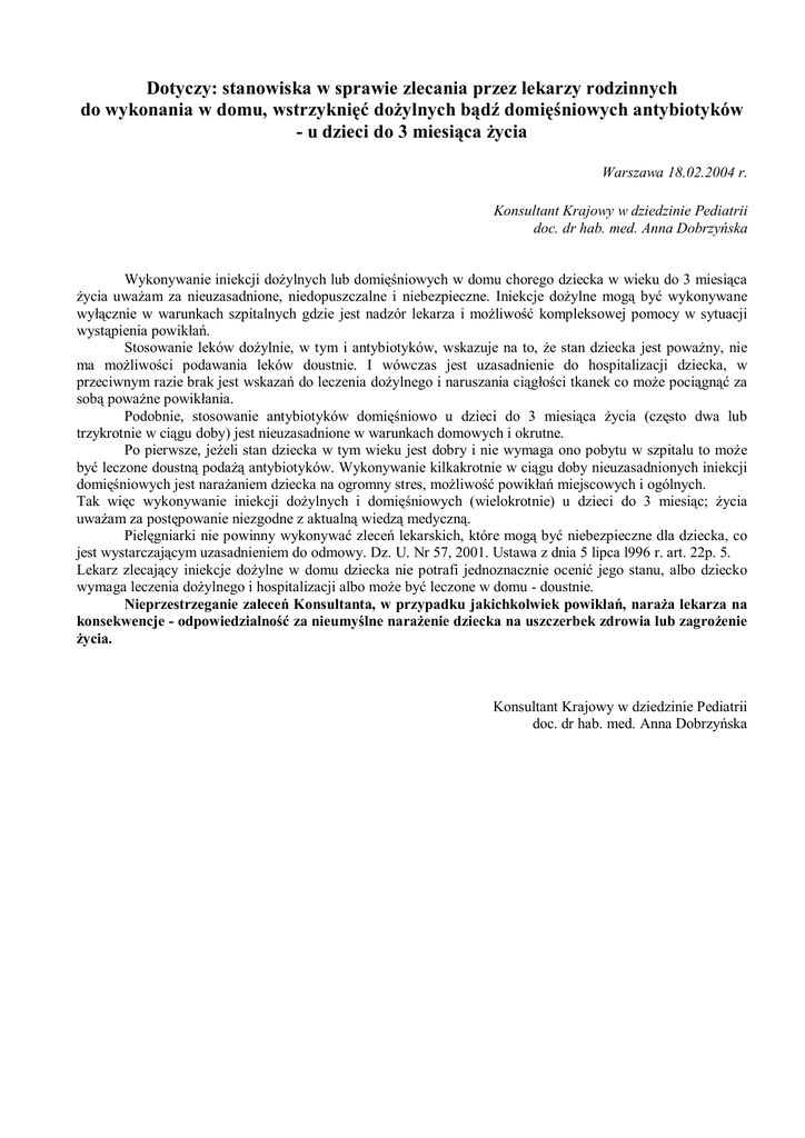 Dotyczy: stanowiska w sprawie zlecania przez lekarzy rodzinnych do wykonania w domu, wstrzyknięć dożylnych bądź domięśniowych antybiotyków - u dzieci do 3 miesiąca życia Warszawa 18.02.2004 r. Konsultant Krajowy w dziedzinie Pediatrii doc. dr hab. med. Anna Dobrzyńska Wykonywanie iniekcji dożylnych lub domięśniowych w domu chorego dziecka w wieku do 3 miesiąca życia uważam za nieuzasadnione, niedopuszczalne i niebezpieczne. Iniekcje dożylne mogą być wykonywane wyłącznie w warunkach szpitalnych gdzie jest nadzór lekarza i możliwość kompleksowej pomocy w sytuacji wystąpienia powikłań. Stosowanie leków dożylnie, w tym i antybiotyków, wskazuje na to, że stan dziecka jest poważny, nie ma możliwości podawania leków doustnie. I wówczas jest uzasadnienie do hospitalizacji dziecka, w przeciwnym razie brak jest wskazań do leczenia dożylnego i naruszania ciągłości tkanek co może pociągnąć za sobą poważne powikłania. Podobnie, stosowanie antybiotyków domięśniowo u dzieci do 3 miesiąca życia (często dwa lub trzykrotnie w ciągu doby) jest nieuzasadnione w warunkach domowych i okrutne. Po pierwsze, jeżeli stan dziecka w tym wieku jest dobry i nie wymaga ono pobytu w szpitalu to może być leczone doustną podażą antybiotyków. Wykonywanie kilkakrotnie w ciągu doby nieuzasadnionych iniekcji domięśniowych jest narażaniem dziecka na ogromny stres, możliwość powikłań miejscowych i ogólnych. Tak więc wykonywanie iniekcji dożylnych i domięśniowych (wielokrotnie) u dzieci do 3 miesiąc; życia uważam za postępowanie niezgodne z aktualną wiedzą medyczną. Pielęgniarki nie powinny wykonywać zleceń lekarskich, które mogą być niebezpieczne dla dziecka, co jest wystarczającym uzasadnieniem do odmowy. Dz. U. Nr 57, 2001. Ustawa z dnia 5 lipca l996 r. art. 22p. 5. Lekarz zlecający iniekcje dożylne w domu dziecka nie potrafi jednoznacznie ocenić jego stanu, albo dziecko wymaga leczenia dożylnego i hospitalizacji albo może być leczone w domu - doustnie. Nieprzestrzeganie zaleceń Konsultanta, w przypadku jakichkolwiek powikłań, naraża lekarza na konsekwencje - odpowiedzialność za nieumyślne narażenie dziecka na uszczerbek zdrowia lub zagrożenie życia. Konsultant Krajowy w dziedzinie Pediatrii doc. dr hab. med. Anna Dobrzyńska