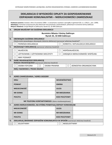 WYPEŁNIAĆ KOMPUTEROWO LUB RĘCZNIE, DUŻYMI DRUKOWANYMI LITERAMI, CZARNYM LUB NIEBIESKIM KOLOREM DEKLARACJA O WYSOKOŚCI OPŁATY ZA GOSPODAROWANIE ODPADAMI KOMUNALNYMI – NIERUCHOMOŚCI ZAMIESZKAŁE Podstawa prawna: Ustawa z dnia 13 września 1996 r. o utrzymaniu czystości i porządku w gminach (Dz. U. z 2013 r., poz. 1399). Składający: Formularz przeznaczony dla właścicieli nieruchomości zamieszkałych, położonych na terenie Gminy Zakliczyn. Miejsce składania: Urząd Miejski w Zakliczynie, Rynek 32, 32-840 Zakliczyn. A. ORGAN WŁAŚCIWY DO ZŁOŻENIA DEKLARACJI Burmistrz Miasta i Gminy Zakliczyn Rynek 32, 32-840 Zakliczyn B. OBOWIĄZEK ZŁOŻENIA DEKLARACJI Okoliczności powodujące obowiązek złożenia deklaracji (zaznaczyć właściwy kwadrat)* ☐ C. D. ☐ PIERWSZA DEKLARACJA KOREKTA / AKTUALIZACJA DEKLARACJI SKŁADAJĄCY DEKLARACJĘ (zaznaczyć właściwy kwadrat) ☐ WŁAŚCICIEL ☐ WSPÓŁWŁAŚCICIEL ☐ UŻYTKOWNIK / UŻYTKOWNIK WIECZYSTY ☐ ZARZĄDCA NIERUCHOMOŚCI WSPÓLNEJ ☐ INNY PODMIOT DANE SKŁADAJĄCEGO DEKLARACJĘ RODZAJ SKŁADAJĄCEGO (zaznaczyć właściwy kwadrat) ☐ OSOBA FIZYCZNA ☐ OSOBA PRAWNA ☐ JEDNOSTKA ORGANIZACYJNA IMIĘ I NAZWISKO / PEŁNA NAZWA E. ADRES ZAMIESZKANIA / ADRES SIEDZIBY KRAJ WOJEWÓDZTWO POWIAT GMINA MIEJSCOWOŚĆ ULICA NR DOMU NR MIESZKANIA POCZTA KOD POCZTOWY NR TELEFONU KONTAKTOWEGO: (dane nieobowiązkowe) F. G. ADRES NIERUCHOMOŚCI, NA KTÓREJ POWSTAJĄ ODPADY KOMUNALNE MIEJSCOWOŚĆ ULICA NR DOMU NR MIESZKANIA POCZTA KOD POCZTOWY DEKLARUJĘ ZBIERANIE ODPADÓW KOMUNALNYCH W SPOSÓB (zaznaczyć właściwy kwadrat) ☐ SELEKTYWNY ☐ NIESELEKTYWNY Strona 1 / 2 WYPEŁNIAĆ KOMPUTEROWO LUB RĘCZNIE, DUŻYMI DRUKOWANYMI LITERAMI, CZARNYM LUB NIEBIESKIM KOLOREM H. OBLICZENIE WYSOKOŚCI OPŁAT ZA GOSPODAROWANIE ODPADAMI KOMUNALNYMI Liczba osób w gospodarstwie domowym (zaznaczyć właściwe pola) Lp. Miesiąc 1-2 3-4 5 i więcej 1 styczeń ☐ ☐ ☐ 2 luty ☐ ☐ ☐ 3 marzec ☐ ☐ ☐ 4 kwiecień ☐ ☐ ☐ 5 maj ☐ ☐ ☐ 6 czerwiec ☐ ☐ ☐ 7 lipiec ☐ ☐ ☐ 8 sierpień ☐ ☐ ☐ 9 wrzesień ☐ ☐ ☐ 10 październik ☐ ☐ ☐ 11 listopad ☐ ☐ ☐ 12 grudzień ☐ ☐ ☐ Należna opłata RAZEM – WYSOKOŚĆ ROCZNEJ OPŁATY ZA GOSPODAROWANIE ODPADAMI KOMUNALNYMI I. DANE UZUPEŁNIAJĄCE / WYJAŚNIENIA J. PODPIS SKŁADAJĄCEGO DEKLARACJĘ / OSOBY REPREZENTUJĄCEJ SKŁADAJĄCEGO DEKLARACJĘ MIEJSCOWOŚĆ K. DATA CZYTELNY PODPIS ADNOTACJE ORGANU Pouczenie: Niniejsza deklaracja stanowi podstawę do wystawienia tytułu wykonawczego, zgodnie z przepisami ustawy z dnia 17 czerwca 1966 r. o postępowaniu egzekucyjnym w administracji (Dz. U. z 2012 r., poz. 1015 z późn. zm.). * Objaśnienia: 1. Właściciel nieruchomości jest obowiązany złożyć deklarację do Burmistrza Miasta i Gminy Zakliczyn o wysokości opłaty za gospodarowanie odpadami komunalnymi w terminie 14 dni od dnia zamieszkania na danej nieruchomości pierwszego mieszkańca. 2. W przypadku zmiany danych będących podstawą ustalenia wysokości należnej opłaty za gospodarowanie odpadami komunalnymi lub określonej w deklaracji ilości odpadów komunalnych powstających na danej nieruchomości właściciel nieruchomości jest obowiązany złożyć nową deklarację do Burmistrza Miasta i Gminy Zakliczyn w terminie 14 dni od dnia nastąpienia zmiany. Opłatę za gospodarowanie odpadami komunalnymi w zmienionej wysokości uiszcza się za miesiąc, w którym nastąpiła zmiana. Strona 2 / 2