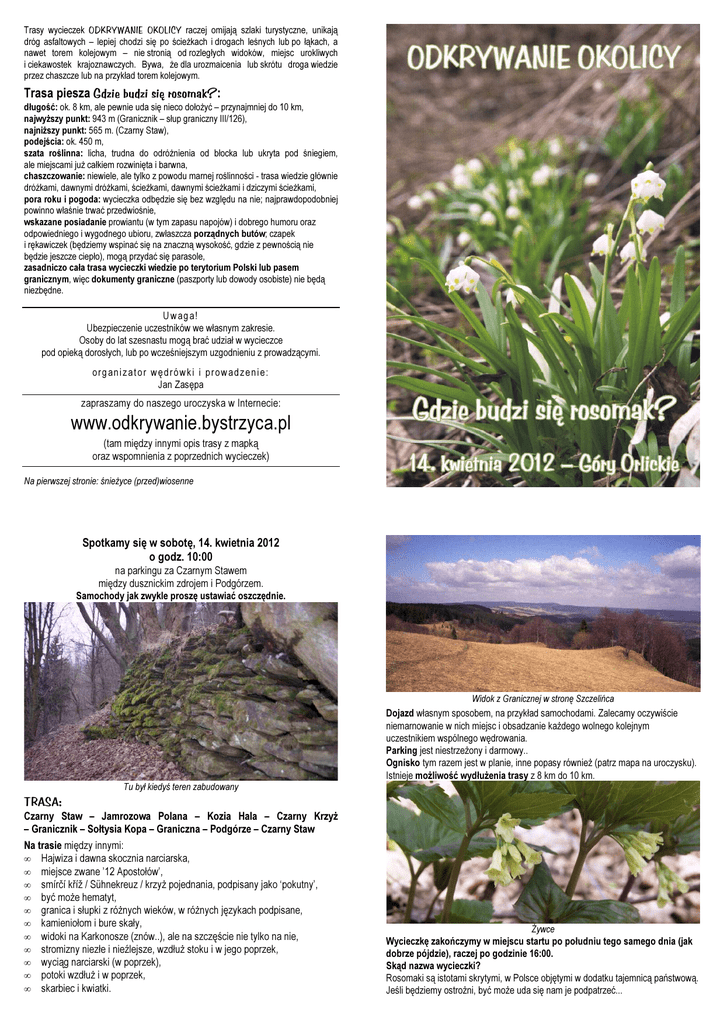 Trasy wycieczek ODKRYWANIE OKOLICY raczej omijają szlaki turystyczne, unikają dróg asfaltowych – lepiej chodzi się po ścieŜkach i drogach leśnych lub po łąkach, a nawet torem kolejowym – nie stronią od rozległych widoków, miejsc urokliwych i ciekawostek krajoznawczych. Bywa, Ŝe dla urozmaicenia lub skrótu droga wiedzie przez chaszcze lub na przykład torem kolejowym. Trasa piesza Gdzie budzi się rosomak?: długość: ok. 8 km, ale pewnie uda się nieco dołoŜyć – przynajmniej do 10 km, najwyŜszy punkt: 943 m (Granicznik – słup graniczny III/126), najniŜszy punkt: 565 m. (Czarny Staw), podejścia: ok. 450 m, szata roślinna: licha, trudna do odróŜnienia od błocka lub ukryta pod śniegiem, ale miejscami juŜ całkiem rozwinięta i barwna, chaszczowanie: niewiele, ale tylko z powodu marnej roślinności - trasa wiedzie głównie dróźkami, dawnymi dróŜkami, ścieŜkami, dawnymi ścieŜkami i dziczymi ścieŜkami, pora roku i pogoda: wycieczka odbędzie się bez względu na nie; najprawdopodobniej powinno właśnie trwać przedwiośnie, wskazane posiadanie prowiantu (w tym zapasu napojów) i dobrego humoru oraz odpowiedniego i wygodnego ubioru, zwłaszcza porządnych butów; czapek i rękawiczek (będziemy wspinać się na znaczną wysokość, gdzie z pewnością nie będzie jeszcze ciepło), mogą przydać się parasole, zasadniczo cała trasa wycieczki wiedzie po terytorium Polski lub pasem granicznym, więc dokumenty graniczne (paszporty lub dowody osobiste) nie będą niezbędne. Uwaga! Ubezpieczenie uczestników we własnym zakresie. Osoby do lat szesnastu mogą brać udział w wycieczce pod opieką dorosłych, lub po wcześniejszym uzgodnieniu z prowadzącymi. organizator wędrówki i prowadzenie: Jan Zasępa zapraszamy do naszego uroczyska w Internecie: www.odkrywanie.bystrzyca.pl (tam między innymi opis trasy z mapką oraz wspomnienia z poprzednich wycieczek) Na pierwszej stronie: śnieŜyce (przed)wiosenne Spotkamy się w sobotę, 14. kwietnia 2012 o godz. 10:00 na parkingu za Czarnym Stawem między dusznickim zdrojem i Podgórzem. Samochody jak zwykle proszę ustawiać oszczędnie. Widok z Granicznej w stronę Szczelińca Dojazd własnym sposobem, na przykład samochodami. Zalecamy oczywiście niemarnowanie w nich miejsc i obsadzanie kaŜdego wolnego kolejnym uczestnikiem wspólnego wędrowania. Parking jest niestrzeŜony i darmowy.. Ognisko tym razem jest w planie, inne popasy równieŜ (patrz mapa na uroczysku). Istnieje moŜliwość wydłuŜenia trasy z 8 km do 10 km. Tu był kiedyś teren zabudowany TRASA: Czarny Staw – Jamrozowa Polana – Kozia Hala – Czarny KrzyŜ – Granicznik – Sołtysia Kopa – Graniczna – Podgórze – Czarny Staw Na trasie między innymi: • Hajwiza i dawna skocznia narciarska, • miejsce zwane ’12 Apostołów’, • smírčí kříž / Sühnekreuz / krzyŜ pojednania, podpisany jako ‘pokutny’, • być moŜe hematyt, • granica i słupki z róŜnych wieków, w róŜnych językach podpisane, • kamieniołom i bure skały, • widoki na Karkonosze (znów..), ale na szczęście nie tylko na nie, • stromizny niezłe i nieźlejsze, wzdłuŜ stoku i w jego poprzek, • wyciąg narciarski (w poprzek), • potoki wzdłuŜ i w poprzek, • skarbiec i kwiatki. śywce Wycieczkę zakończymy w miejscu startu po południu tego samego dnia (jak dobrze pójdzie), raczej po godzinie 16:00. Skąd nazwa wycieczki? Rosomaki są istotami skrytymi, w Polsce objętymi w dodatku tajemnicą państwową. Jeśli będziemy ostroŜni, być moŜe uda się nam je podpatrzeć...