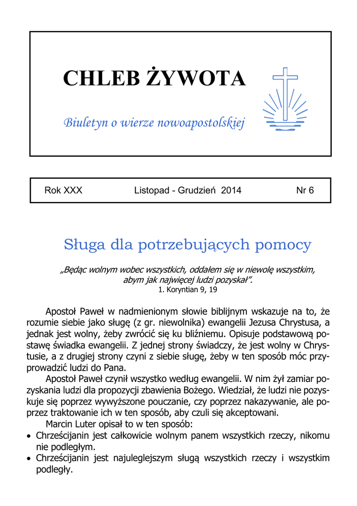 CHLEB ŻYWOTA Biuletyn o wierze nowoapostolskiej Rok XXX Listopad - Grudzień 2014 Nr 6 Sługa dla potrzebujących pomocy „Będąc wolnym wobec wszystkich, oddałem się w niewolę wszystkim, abym jak najwięcej ludzi pozyskał”. 1. Koryntian 9, 19 Apostoł Paweł w nadmienionym słowie biblijnym wskazuje na to, że rozumie siebie jako sługę (z gr. niewolnika) ewangelii Jezusa Chrystusa, a jednak jest wolny, żeby zwrócić się ku bliźniemu. Opisuje podstawową postawę świadka ewangelii. Z jednej strony świadczy, że jest wolny w Chrystusie, a z drugiej strony czyni z siebie sługę, żeby w ten sposób móc przyprowadzić ludzi do Pana. Apostoł Paweł czynił wszystko według ewangelii. W nim żył zamiar pozyskania ludzi dla propozycji zbawienia Bożego. Wiedział, że ludzi nie pozyskuje się poprzez wywyższone pouczanie, czy poprzez nakazywanie, ale poprzez traktowanie ich w ten sposób, aby czuli się akceptowani. Marcin Luter opisał to w ten sposób: Chrześcijanin jest całkowicie wolnym panem wszystkich rzeczy, nikomu nie podległym. Chrześcijanin jest najuleglejszym sługą wszystkich rzeczy i wszystkim podległy. To, co w powyższym wydaje się sprzecznością, tworzy całość. Wolność w Chrystusie skłania do bycia sługą Jego i bliźniego. Także wobec niezbawionych dusz na tamtym świecie ważne jest, abyśmy mieli w sobie takie „usposobienie sługi”. Na tamtym świecie stan dusz jest różnorodny: U jednych występuje strach przed sądem, u innych nienawiść z powodu doznanych zranień czy zniewag. Niektórzy znajdują się w niedoli, z której nie mogą się wydostać. Pomyślmy o ich pragnieniu, abyśmy zwrócili się ku nim i o nich nie zapomnieli, pomyślmy o ich pragnieniu wspólnoty. Brak pocieszenia i pokoju także oznacza wielką niedolę. W jaki sposób możemy pomóc tym duszom? Przykładem tu jest Apostoł Paweł: On był wolny i służył jako sługa. Tylko ten, kto jest wolny, może być pomocą dla innych! Wolność ta nie pochodzi z naszego wysiłku, lecz jest działaniem Boga przy nas. Kiedy się nad tym zastanawiamy, wtenczas czujemy wewnętrzną potrzebę radosnego rozsławiania daru wolności. Właśnie to jest znakiem dla niezbawionych dusz! Kiedy Panu służy się z serca, a więc jest się Jego sługą, wtedy wyraźniejsza staje się nasza wdzięczność wobec Boga. Wdzięczność ta również może być znakiem dla niezbawionych dusz! Taki „wolny sługa” nikogo nie osądza. Ma otwarte serce i chętnie przebacza. Współczuje duszom i zawsze wstawia się za nimi. Odczuwa wręcz duchowy ból z powodu tego, że są zniewolone. Można powiedzieć, że miłuje potrzebujących całym sercem! Tylko ten, kto jest wolny, może być pomocą dla innych i służyć całym sercem. Życie z Boga „Ja przyszedłem, aby miały życie i obfitowały”. Ew. Jana 10, 10 Zanim Pan przytoczył podobieństwo o Dobrym Pasterzu, mówił o sobie jako o drzwiach. Kto przez te drzwi przechodzi, będzie zbawiony. „Obfitowanie” oznacza „pełnię”: Ci, którzy przechodzą przez drzwi, którymi jest Jezus Chrystus, mają mieć pełnię życia (wiecznego). Jezus prawdopodobnie odnosi się do Psalmu 118, 20, który nadmienia Bożą bramę czasu końcowego. 2 Życie z Boga jest jednocześnie Bożym darem i zadaniem. Boże Narodzenie jest świętem radości, życzeń i prezentów. Niech szczególnym naszym życzeniem będzie to, żeby w naszych zborach było jeszcze więcej wzajemnej serdeczności i jeszcze więcej poczucia radości i miłości. Patrząc wstecz na narodziny Jezusa Chrystusa dostrzegamy, jak wielki jest ten Boży podarunek. Miłość Boża objawiła się w Nim w jednorazowy i niepowtarzalny sposób. Pan przyszedł, aby darować nam życie i by to życie w pełni się objawiło. Nie chodzi tu o naturalne życie, lecz o życie z Boga, które wprowadza do życia wiecznego, a zostało nam darowane poprzez nowonarodzenie z wody i z Ducha Świętego. Życie z Boga z jednej strony jest darem Bożym, z drugiej zaś zadaniem, aby niezmiennie opowiadać się za Panem. Ufajmy Jemu i wszelkie nasze sprawy wkładajmy do Jego rąk. Jest to nasza cząstka, którą musimy wnieść. Opis narodzin Jezusa wskazuje, że już wówczas należało podejmować decyzje. Józef był zaręczony z Marią i chciał się z nią ożenić. Wtedy się dowiedział, że Maria spodziewa się dziecka. Nie chcąc jej narazić na wstyd i hańbę, myślał o tym, żeby potajemnie ją opuścić. Wtenczas zaingerował Pan. Pojawił się anioł we śnie i powiedział do Józefa, że dziecko zostało poczęte z Ducha Świętego. Józef musiał podjąć decyzję. Przemyślał swój dotychczasowy zamiar i pozostał z Marią. A więc opowiedział się za Panem. (por. Ew. Mateusza 1, 18-25) Przebywający na polu pasterze usłyszeli poselstwo anioła: „Dziś narodził się wam Zbawiciel, którym jest Chrystus Pan, w mieście Dawidowym”. W reakcji na zapowiedź, iż ujrzą dzieciątko leżące w żłobie, powiedzieli: „Pójdźmy zaraz aż do Betlejemu i oglądajmy to, co się stało i co nam objawił Pan”. To również była decyzja, którą musieli podjąć. Pasterze udali się w drogę i znaleźli wypełnienie tego, co zostało im zapowiedziane przez aniołów. (por. Ew. Łukasza 2, 8-18) Każdego dnia na nowo należy podjąć decyzję, czyją wolę chcemy wypełniać – naszą własną czy wolę Bożą. Dawajmy przestrzeń bodźcom Ducha Świętego i podejmujmy właściwe decyzje! Duch Święty zawsze objawia nam wolę Bożą. Kto wciąż na nowo opowiada się za Panem, ten doświadczy spełnienia się wypowiedzi Jezusa: „Ja przyszedłem, abyście mieli życie i obfitowali”. Obfitowanie – to również bogactwo pokoju, radości i błogosławieństwa. Pan wciąż na nowo nam to wszystko daruje, jeśli się za Nim opowiadamy i wypełniamy wolę Bożą. 3 Dział duszpasterski dla dzieci Z wizytą u Fiony w Tiranie, w Albanii Na imię mam Fiona i mam 11 lat. Mieszkam w 