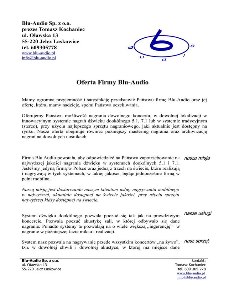 Blu-Audio Sp. z o.o. prezes Tomasz Kochaniec ul. Oławska 13 55-220 Jelcz Laskowice tel. 609305778 www.blu-audio.pl [email protected] Oferta Firmy Blu-Audio Mamy ogromną przyjemność i satysfakcję przedstawić Państwu firmę Blu-Audio oraz jej ofertę, która, mamy nadzieję, spełni Państwa oczekiwania. Oferujemy Państwu możliwość nagrania dowolnego koncertu, w dowolnej lokalizacji w innowacyjnym systemie nagrań dźwięku dookólnego 5.1, 7.1 lub w systemie tradycyjnym (stereo), przy użyciu najlepszego sprzętu nagraniowego, jaki aktualnie jest dostępny na rynku. Nasza oferta obejmuje również późniejszy mastering nagrania oraz archiwizację nagrań na dowolnych nośnikach. Firma Blu Audio powstała, aby odpowiedzieć na Państwa zapotrzebowanie na nasza misja najwyższej jakości nagrania dźwięku w systemach dookólnych 5.1 i 7.1. Jesteśmy jedyną firmą w Polsce oraz jedną z trzech na świecie, które realizują i nagrywają w tych systemach, w takiej jakości, będąc jednocześnie firmą w pełni mobilną. Naszą misją jest dostarczanie naszym klientom usług nagrywania mobilnego w najwyższej, aktualnie dostępnej na świecie jakości, przy użyciu sprzętu najwyższej klasy dostępnej na świecie. System dźwięku dookólnego pozwala poczuć się tak jak na prawdziwym koncercie. Pozwala poczuć akustykę sali, w której odbywało się dane nagranie. Ponadto systemy te pozwalają na o wiele większą „ingerencję” w nagranie w późniejszej fazie miksu i realizacji. nasze usługi System nasz pozwala na nagrywanie przede wszystkim koncertów „na żywo”, nasz sprzęt tzn. w dowolnej chwili i dowolnej akustyce, w której ma miejsce dane Blu-Audio Sp. z o.o. ul. Oławska 13 55-220 Jelcz Laskowice kontakt: Tomasz Kochaniec tel. 609 305 778 www.blu-audio.pl [email protected] nagranie. Do realizacji nagrania nie jest konieczne nagłośnienie. Posiadamy własną bazę Hi-End-owych mikrofonów (Neuman, DPA) oraz najwyższej klasy przetworników analogowo-cyfrowych firmy RME. Wykonane nagranie możemy przekazać klientowi w postaci gotowych ścieżek audio (możemy nagrywać jednocześnie 64 ścieżki w jakości 192 kHz, 24 bit) do późniejszego miksu lub archiwizacji. Możemy również od razu wykonać dla niego miks w systemie 7.1 do wydania na płycie Blu-Ray. Możemy jednocześnie wydać to na płycie DVD lub CD. Mobilność pozwala nam obsłużyć wiele koncertów w ciągu jednego tygodnia, a nawet dnia. nasze Firmę założył i prowadzi mgr inż. Tomasz Kochaniec, absolwent Politechniki Wrocławskiej (1999), specjalność akustyka. Pracował w Teatrze Muzycznym kompetencje i Capitol, współpracował z Telewizją Wrocław i innymi telewizjami doświadczenie prywatnymi w zakresie realizacji dźwięku. Współpracował przy realizacjach kilku PPA (2001-2006) oraz z wrocławską Fundacją „Opus Organi” przy nagraniach koncertów „Ziemi Wrocławskiej”. Nagrywał i realizował koncerty dla takich firm jak GMB pro, Pogo Art. Będziemy wdzięczni za odpowiedź na naszą ofertę. W razie jakichkolwiek pytań służymy pomocą. Z poważaniem, Tomasz Kochaniec Prezes Blu-Audio Sp. zo.o. Blu-Audio Sp. z o.o. ul. Oławska 13 55-220 Jelcz Laskowice kontakt: Tomasz Kochaniec tel. 609 305 778 www.blu-audio.pl [email protected]