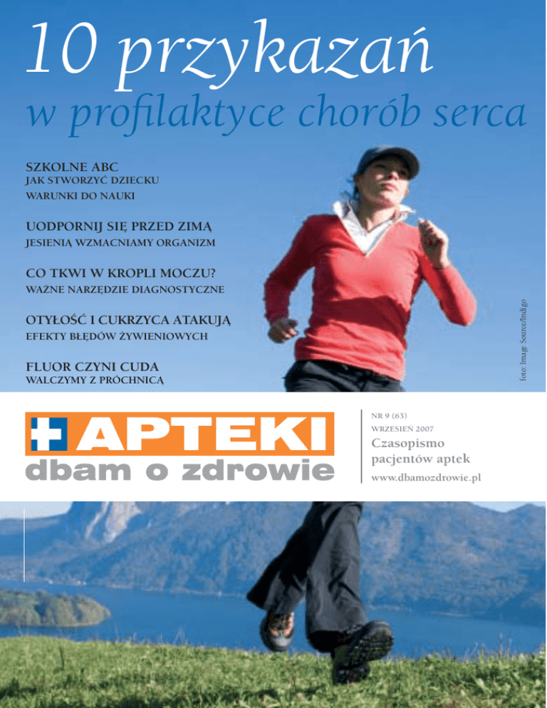 10 przykazań w profilaktyce chorób serca SZKOLNE ABC JAK STWORZYĆ DZIECKU WARUNKI DO NAUKI UODPORNIJ SIĘ PRZED ZIMĄ JESIENIĄ WZMACNIAMY ORGANIZM CO TKWI W KROPLI MOCZU? foto: Image Source/Indigo WAŻNE NARZĘDZIE DIAGNOSTYCZNE OTYŁOŚĆ I CUKRZYCA ATAKUJĄ EFEKTY BŁĘDÓW ŻYWIENIOWYCH FLUOR CZYNI CUDA WALCZYMY Z PRÓCHNICĄ NR 9 7/8 (63) (61/62) LIPIEC/SIERPIEŃ WRZESIEŃ 2007 2007 Czasopismo pacjentów aptek www.dbamozdrowie.pl infolinia: 0-800 APTEKI [278-354] www.dbamozdrowie.pl 1 2 reklama infolinia: 0-800 APTEKI [278-354] www.dbamozdrowie.pl 1 Aktualności ZMIANY W PROGRAMIE APTEKI DBAM O ZDROWIE! Szanowni Państwo, Z dniem 1 sierpnia 2007 program Apteki Dbam o Zdrowie wprowadza nowy system naliczania punktów. W świetle nowych przepisów w prawie farmaceutycznym nie będzie możliwości naliczania punktów za leki refundowane. Za pozostałe produkty zakupione w aptece a nie objęte refundacją będziemy naliczać punkty według nowych zasad: 4 zł. = 1 punkt Jeśli będą mieli Państwo pytania i wątpliwości prosimy o kontakt z infolinią 0800 278 354 Zespół programu Apteki Dbam o Zdrowie ZAPRASZAMY DO KSIĘGARNI WYSYŁKOWEJ DBAM O ZDROWIE! W TYM NUMERZE POLECAMY NOWOŚCI: • „CHEMIOTERAPIA I RADIOTERAPIA” – to książka, która porusza temat najczęściej stosowanych metod leczenia chorób nowotworowych oraz odpowiada na pytania dotyczące trybu życia podczas leczenia i po zakończonej terapii. • „DZIECKO Z ZESPOŁEM DOWNA” – to poradnik, w którym rodzice znajdą omówienie najważniejszych problemów, z którymi spotykają się na co dzień, oraz rady, jak zaplanować życie z dzieckiem z zespołem Downa i jak zaakceptować jego odmienność. • „LICZMY WAPŃ W DIECIE” - Niniejsza publikacja ma ułatwić dokonywanie prawidłowego wyboru produktów, które są źródłem wapnia, i innych składników odżywczych, wpływających korzystnie na jego przyswajanie z diety. • „ŻYWIENIE KOBIET W CIĄŻY” - Lekarze i dietetycy są zgodni, że brak dostatecznej liczby korzystnych składników w diecie zagraża zdrowiu nie tylko kobiety ciężarnej, ale i oczekiwanego przez nią dziecka. Poradnik odpowiada na pytania, jakie są to składniki i gdzie je znaleźć. Zamówienia prosimy przesyłać na formularzu zamieszczonym wewnątrz gazetki lub na stronie internetowej www.dbamozdrowie.pl 2 Od redakcji SPIS TREŚCI Z OKŁADKI: SZANOWNI CZYTELNICY Od kilku lat we wrześniu obchodzimy Światowy Dzień Serca - dzień, którego celem jest przypominanie nam jak ważna jest profilaktyka chroniąca przed rozwojem chorób serca. I my nie zapominamy o tym ważnym temacie. W artykule „10 przykazań w profilaktyce chorób serca” udowadniamy, że profilaktyka chorób serca i układu krążenia będzie skuteczna, jeśli oprze się na trwałych zmianach w stylu naszego życia. Wraz z nadejściem jesieni powracają dolegliwości związane z tą porą roku. Czujemy się wiecznie zmęczeni, śpiący. Jesteśmy także bardziej narażeni na choroby górnych dróg oddechowych. Wczesna jesień to idealny czas na wzmocnienie swojego organizmu. Sprawny układ odpornościowy pomoże szybciej pokonać nabytą chorobę lub całkowicie się od niej ustrzec. Więcej informacji o tym, jak się zabezpieczyć przed chorobami znajdziecie Państwo w artykule „Uodpornij się przed zimą”. Wrzesień to także czas powrotu do szkoły naszych pociech. Aby mogły one jak najlepiej przyswajać wiedzę - zarówno w domu, jak i w szkole - konieczna jest dbałość o higieniczny tryb życia uczniów. Jak dbać o ucznia piszemy w artykule „Szkolne ABC”. W tym numerze znajdziecie Państwo także stałe rubryki – Poradnia DOZ, w której odpowiedzi na pytania Czytelników udziela lekarz medycyny i doktor nauk farmaceutycznych Jacek Owczarek z Zakładu Biofarmacji Uniwersytetu Medycznego w Łodzi oraz kącik rozrywkowy z krzyżówką. Zapraszamy do lektury Redakcja Przewodnik po aptece „Dbam o zdrowie” - czasopismo pacjentów aptek Wydawca: Bez Recepty Sp. z o.o. (spółka Polskiej Grupy Farmaceutycznej), 91-342 Łódź, ul. Zbąszyńska 3, tel. (0 42) 613 34 44. Prezes wydawnictwa: Wojciech Rosicki. Redakcja: adres jak wyżej, redaguje zespół: Redaktor Naczelny: Krzysztof Chrzanowski, Sekretarz Redakcji: Grzegorz Dróżdż, Redaktor Graficzny: Izabela Raduszewska. Dział Reklamy: Tomasz Cieślak, tel. (0 42) 613 35 83, 0 601 075 736, e-mail: [email protected], Sebastian Stanisławski, tel. (0 42) 613 35 89, e-mail: [email protected]. Skład: JURCZYK DESIGN, www.jurczykdesign.com. Zdjęcia: FPM, Indigo. Nadzór farmaceutyczny: Jerzy Stasiak, Druk: Drukarnia Prasowa SA, Łódź Redakcja nie odpowiada za treść reklam. Nie zwraca materiałów niezamówionych. Zastrzega sobie prawo do dokonywania skrótów redakcyjnych, nadawania tytułów i śródtytułów. Za treść opisów preparatów odpowiedzialność ponoszą Zleceniodawcy. infolinia: 0-800 APTEKI [278-354] www.dbamozdrowie.pl 10 PRZYKAZAŃ W PROFILAKTYCE CHORÓB SERCA 6 OTYŁOŚĆ I CUKRZYCA JAKO EFEKT BŁĘDÓW ŻYWIENIOWYCH 20 UODPORNIJ SIĘ PRZED ZIMĄ 30 FLUOR I NASZE ZĘBY 48 CO TKWI W KROPLI MOCZU 52 SZKOLNE ABC 60 PROBLEMOWA SKÓRA 12 JESIEŃ - CZAS KATARU 38 LISTA LAUREATÓW 59 WYBIERAMY LEKARZA 66 PIERWSZEGO KONTAKTU KRZYŻÓWKA 74 PORADNIA 76 KSIĘGARNIA 80 3 4 Wyrób medyczny sugerowana cena w aptece 174 99 CIŚNIENIOMIERZ NADGARSTKOWY BC08 • nowa, niepowtarzalna szata graficzna • pomiar na nadgarstku • zapamiętuje 2 x 50 pomiarów z datą i godziną pomiaru • średnia pomiarów • sygnał wizualny • duży wyświetlacz z jednoczesnym wskaźnikiem wszystkich wartości danego pomiaru • automatyczne załączanie po wyskalowaniu • bardzo szybki pomiar • baterie na wyposażeniu • eleganckie etui GRATIS! TERMOMETR ELEKTRONICZNY FT09 • termometr elektroniczny do pomiaru temperatury ciała • wodoodporny • nie ma elementów szklanych • szybki pomiar • pamięć • sygnał dźwiękowy • w