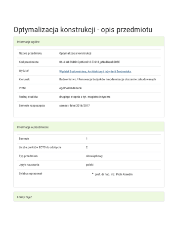 Optymalizacja konstrukcji - opis przedmiotu Informacje ogólne Nazwa przedmiotu Optymalizacja konstrukcji Kod przedmiotu 06.4-WI-BUDD-OptKon01ć-Ć-S13_pNadGenB205E Wydział Wydział Budownictwa, Architektury i Inżynierii Środowiska Kierunek Budownictwo / Renowacja budynków i modernizacja obszarów zabudowanych Profil ogólnoakademicki Rodzaj studiów drugiego stopnia z tyt. magistra inżyniera Semestr rozpoczęcia semestr letni 2016/2017 Informacje o przedmiocie Semestr 1 Liczba punktów ECTS do zdobycia 2 Typ przedmiotu obowiązkowy Język nauczania polski Sylabus opracował Formy zajęć prof. dr hab. inż. Piotr Alawdin Forma Liczba godzin w Liczba godzin w Liczba godzin w Liczba godzin w Forma zajęć semestrze tygodniu semestrze tygodniu zaliczenia (stacjonarne) (stacjonarne) (niestacjonarne) (niestacjonarne) 15 1 9 ,6 Ćwiczenia Zaliczenie na ocenę Wykład 15 1 9 ,6 Zaliczenie na ocenę Cel przedmiotu Celem przedmiotu jest poznanie podstaw metod optymalizacji konstrukcji budowlanych co do ich kształtu, sztywności i wytrzymałości. Wymagania wstępne Matematyka. Metody komputerowe. Wytrzymałość materiałów. Mechanika budowli. Zakres tematyczny Wykład Podstawy metodologii projektowania technicznego. Miary niezawodności i bezpieczeństwa konstrukcji. Kryteria optymalności konstrukcji. Optymalne kształtowanie łuków i słupów równej wytrzymałości. Optymalizacja wielokryterialna. Optymalne projektowanie belek i słupów. Optymalne projektowanie belek i ram według teorii nośności granicznej i przystosowania. Zadanie programowania kwadratowego. Dualność zasad energetycznych dla metod sił i przemieszczeń. Ekstremum funkcji na zbiorze wypukłym i warunki konieczne ekstremum. Warunki Karusha-Kuhna-Tuckera (KKT) dla zagadnień sprężysto-plastycznych. Metoda mnożników Lagrange’a. Teoria sterowania w problemach optymalizacji konstrukcji. Polioptymalizacja belek. Metody kształcenia Wykład - wykład konwencjonalny. Efekty kształcenia i metody weryfikacji osiągania efektów kształcenia Opis efektu Symbole Metody weryfikacji Forma zajęć efektów Wiedza - Student nabywa podstawową wiedzę w K_W01 kolokwium zakresie rozumienia i stosowania metod i Kolokwium algorytmów optymalizacji matematycznej do testowe z progami zaawansowanych problemów kształtowania punktowymi Wykład konstrukcji, co do ich kształtu i wykorzystania nośności Kompetencje społeczne - Rozumie potrzebę K_K05 egzamin - ustny, uczenia się przez całe życie. Potrafi organizować opisowy, testowy i proces uczenia się innych osób inne Warunki zaliczenia Wykład Zaliczenie na podstawie kolokwium z progami punktowymi: 56% - 65% pozytywnych odpowiedzi – dst 66% - 75% dst plus 76% - 85% db 86% - 93% db+ Wykład 94% - 100% bdb. Zaliczenie przedmiotu: Ocena końcowa jest ocena z wykładu. Obciążenie pracą Obciążenie pracą Studia Studia niestacjonarne stacjonarne (w godz.) (w godz.) Godziny kontaktowe (udział w zajęciach; konsultacjach; egzaminie, itp.) 30 30 Samodzielna praca studenta (przygotowanie do: zajęć, kolokwium, 30 30 Łącznie 60 60 Punkty ECTS Studia Studia niestacjonarne egzaminu; studiowanie literatury przygotowanie: pracy pisemnej, projektu, prezentacji, raportu, wystąpienia; itp.) stacjonarne Zajęcia z udziałem nauczyciela akademickiego 1 1 Zajęcia bez udziału nauczyciela akademickiego 1 1 Łącznie 2 2 Literatura podstawowa 1. Bochenek B., Krużelecki J., Optymalizacja stateczności konstrukcji: współczesne problemy, Kraków: Wydaw. Politechniki Krakowskiej im. Tadeusza Kościuszki, 2007. 2. Brandt A.M.(red.), Kryteria i Metody Optymalizacji Konstrukcji. PWN, Warszawa 1977. 3. Brandt A.M. (red.), Podstawy Optymalizacji Elementów Budowlanych. PWN, Warszawa 1978. 4. Majid K.I., Optymalne projektowanie konstrukcji. PWN, Warszawa 1981. 5. Ostwald M., Podstawy optymalizacji konstrukcji. Wyd. PP, Poznań 2005. 6. Szymczak C., Elementy teorii projektowania. PWN, Warszawa 1998. 7. Wasiutyński Z., Pisma, tom II: O zagadnieniach optymalizacji konstrukcyj i o rozwijaniu tych zagadnień. PWN, Warszawa 1978. Literatura uzupełniająca 1. Borkowski A., Statyczna analiza układów prętowych w zakresach sprężystym i plastycznym. IPPT PAN, Warszawa – Poznań 1985. 2. Mikulski L., Teoria sterowania w problemach optymalizacji konstrukcji i systemów, Wydawnictwo Politechniki Krakowskiej, 2007. 3. Findeisen W., Szymanowski J., Wierzbicki A., Teoria i metody obliczeniowe optymalizacji. PWN, Warszawa 1980. 4. Stadnicki J.: Teoria i praktyka rozwiązywania zadań optymalizacji. WNT, Warszawa 2006. Uwagi Zmodyfikowane przez prof. dr hab. inż. Piotr Alawdin (ostatnia modyfikacja: 30-08-2016 19:27)