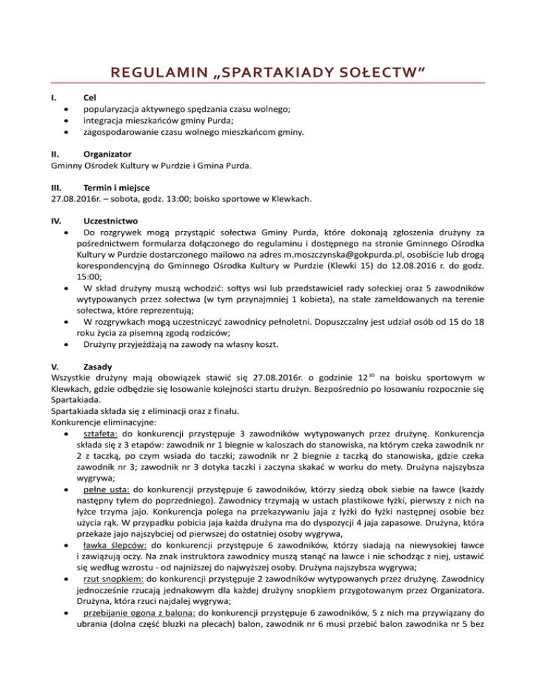 REGULAMIN „SPARTAKIADY SOŁECTW” I. Cel popularyzacja aktywnego spędzania czasu wolnego; integracja mieszkańców gminy Purda; zagospodarowanie czasu wolnego mieszkańcom gminy. II. Organizator Gminny Ośrodek Kultury w Purdzie i Gmina Purda. III. Termin i miejsce 27.08.2016r. – sobota, godz. 13:00; boisko sportowe w Klewkach. IV. Uczestnictwo Do rozgrywek mogą przystąpić sołectwa Gminy Purda, które dokonają zgłoszenia drużyny za pośrednictwem formularza dołączonego do regulaminu i dostępnego na stronie Gminnego Ośrodka Kultury w Purdzie dostarczonego mailowo na adres [email protected], osobiście lub drogą korespondencyjną do Gminnego Ośrodka Kultury w Purdzie (Klewki 15) do 12.08.2016 r. do godz. 15:00; W skład drużyny muszą wchodzić: sołtys wsi lub przedstawiciel rady sołeckiej oraz 5 zawodników wytypowanych przez sołectwa (w tym przynajmniej 1 kobieta), na stałe zameldowanych na terenie sołectwa, które reprezentują; W rozgrywkach mogą uczestniczyć zawodnicy pełnoletni. Dopuszczalny jest udział osób od 15 do 18 roku życia za pisemną zgodą rodziców; Drużyny przyjeżdżają na zawody na własny koszt. V. Zasady Wszystkie drużyny mają obowiązek stawić się 27.08.2016r. o godzinie 12 30 na boisku sportowym w Klewkach, gdzie odbędzie się losowanie kolejności startu drużyn. Bezpośrednio po losowaniu rozpocznie się Spartakiada. Spartakiada składa się z eliminacji oraz z finału. Konkurencje eliminacyjne: sztafeta: do konkurencji przystępuje 3 zawodników wytypowanych przez drużynę. Konkurencja składa się z 3 etapów: zawodnik nr 1 biegnie w kaloszach do stanowiska, na którym czeka zawodnik nr 2 z taczką, po czym wsiada do taczki; zawodnik nr 2 biegnie z taczką do stanowiska, gdzie czeka zawodnik nr 3; zawodnik nr 3 dotyka taczki i zaczyna skakać w worku do mety. Drużyna najszybsza wygrywa; pełne usta: do konkurencji przystępuje 6 zawodników, którzy siedzą obok siebie na ławce (każdy następny tyłem do poprzedniego). Zawodnicy trzymają w ustach plastikowe łyżki, pierwszy z nich na łyżce trzyma jajo. Konkurencja polega na przekazywaniu jaja z łyżki do łyżki następnej osobie bez użycia rąk. W przypadku pobicia jaja każda drużyna ma do dyspozycji 4 jaja zapasowe. Drużyna, która przekaże jajo najszybciej od pierwszej do ostatniej osoby wygrywa, ławka ślepców: do konkurencji przystępuje 6 zawodników, którzy siadają na niewysokiej ławce i zawiązują oczy. Na znak instruktora zawodnicy muszą stanąć na ławce i nie schodząc z niej, ustawić się według wzrostu - od najniższej do najwyższej osoby. Drużyna najszybsza wygrywa; rzut snopkiem: do konkurencji przystępuje 2 zawodników wytypowanych przez drużynę. Zawodnicy jednocześnie rzucają jednakowym dla każdej drużyny snopkiem przygotowanym przez Organizatora. Drużyna, która rzuci najdalej wygrywa; przebijanie ogona z balona: do konkurencji przystępuje 6 zawodników, 5 z nich ma przywiązany do ubrania (dolna część bluzki na plecach) balon, zawodnik nr 6 musi przebić balon zawodnika nr 5 bez użycia rąk, następnie zawodnik nr 5 musi przebić balon zawodnika nr 4 bez użycia rąk itd. Drużyna, która najszybciej wykona zadanie wygrywa; gwóźdź programu: uczestnicy mają za zadanie wbić małym młotkiem w oddalony pieniek dużego gwoździa, po kolei zmieniając się co 2 uderzenia. Drużyna, która wbije cały gwódź pierwsza lub wbije gwóźdź w największym stopniu (jeśli żadna z drużyn nie wbije gwoździa w całości) wygrywa. Po eliminacjach do finału przechodzą 4 drużyny z największą ilością punktów. Konkurencje finałowe: siłowanie na rękę: do konkurencji przystępuje 1 mężczyzna i 1 kobieta wytypowani przez drużynę, siłuje się każdy mężczyzna z każdym mężczyzną i każda kobieta z każdą kobietą. Drużyna z największą liczbą wygranych pojedynków wygrywa; cięcie drewna: do konkurencji przystępuje 2 zawodników, którzy mają za zadanie przepiłowanie drewnianego elementu na pół dwuosobową piłą. W konkurencji może uczestniczyć trzeci, wybrany przez drużynę zawodnik, który pomaga utrzymać piłowany element. Drużyna, która najszybciej przepiłuje drewno wygrywa; przeciąganie liny: do konkurencji przystępuje 4 zawodników wytypowanych przez drużynę, drużyny stają naprzeciw siebie trzymając końce liny, po czym przeciągają przeciwników na swoją stronę. Drużyna, która przeciągnie przeciwników o określony odcinek wygrywa; quiz wiedzy: do konkurencji przystępuje 6 zawodników, którzy odpowiadają na pytania dotyczące Gminy Purda. Każda drużyna losuje pytanie, na które musi udzielić odpowiedzi w czasie 1 minuty. Każda drużyna odpowiada na 6 pytań. Drużyna, która odpowie poprawnie na największą liczbę pytań wygrywa. Konkurencje podczas eliminacji punktowane będą następująco: 5 pierwszych miejsc dostaje punkty pierwsze miejsce 5pkt, drugie miejsce 4pkt, trzecie miejsce 3pkt, czwarte miejsce 2pkt, piąte miejsce 1pkt. Konkurencje podczas finału punktowane są następująco: wszystkie miejsca dostają punkty - pierwsze miejsce 4pkt, drugie miejsce 3pkt, trzecie miejsce 2pkt, czwarte miejsce 1pkt. Spartakiadę wygrywa drużyna, która zdobędzie największą ilość punktów w finale. VI. Nagrody Za zajęcie trzech pierwszych miejsc w Spartakiadzie Organizator przewidział drobne upominki rzeczowe dla każdego uczestnika zawodów oraz nagrody dla sołectw w postaci bonów na kwoty: – 500,00 zł – za zajęcie I miejsca, – 300,00 zł – za zajęcie II miejsca, – 200,00 zł – za zajęcie III miejsca. VII. Jury Nad przebiegiem zmagań będzie czuwało trzyosobowe jury wyłonione przez Organizatora. VIII. Postanowienia końcowe: Zawodnicy startują w zawodach na własną odpowiedzialność; W zawodach biorą udział osoby nie mające przeciwwskazań zdrowotnych; Organizator nie ponosi odpowiedzialności prawnej za kontuzje i koszty leczenia wyn